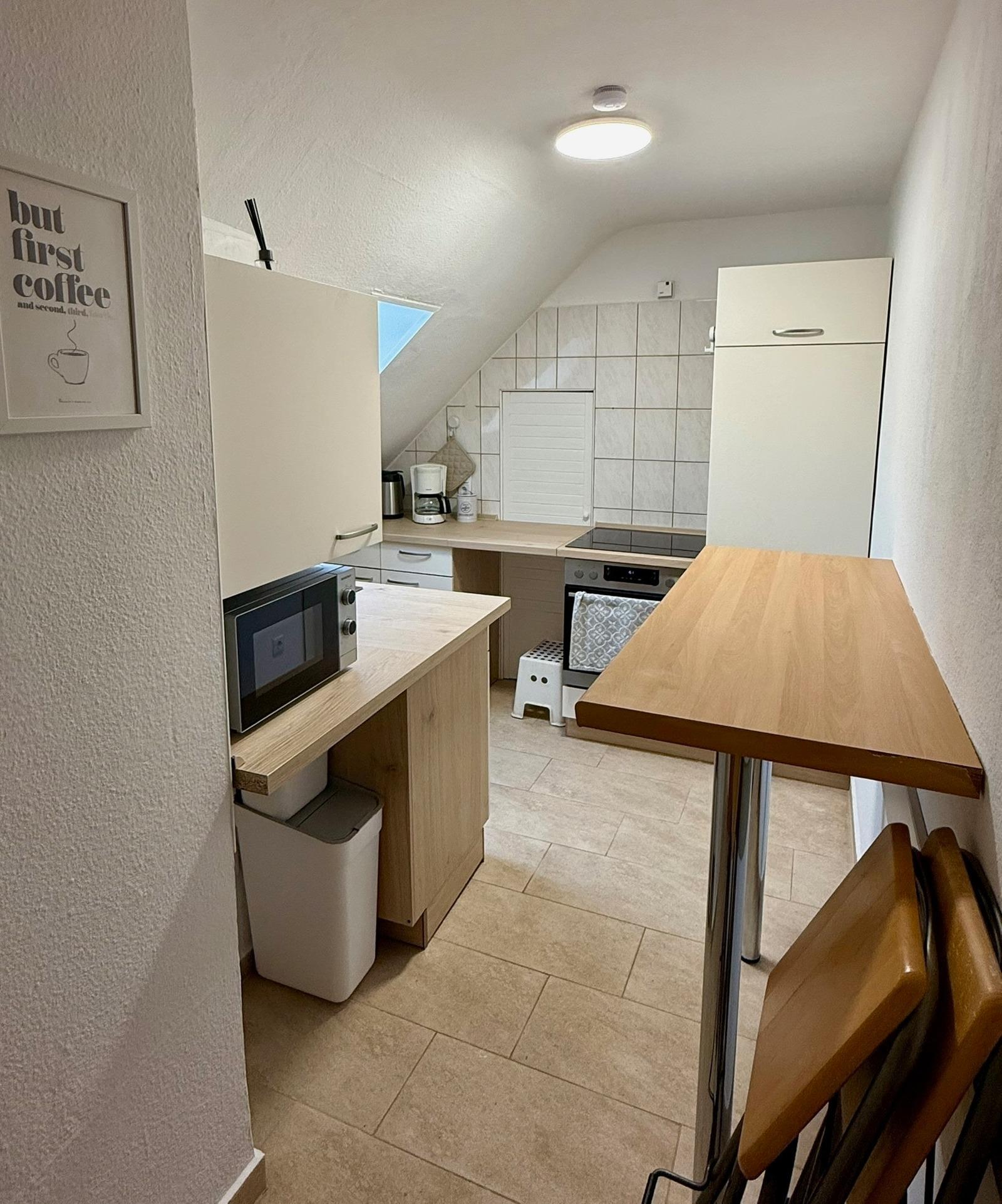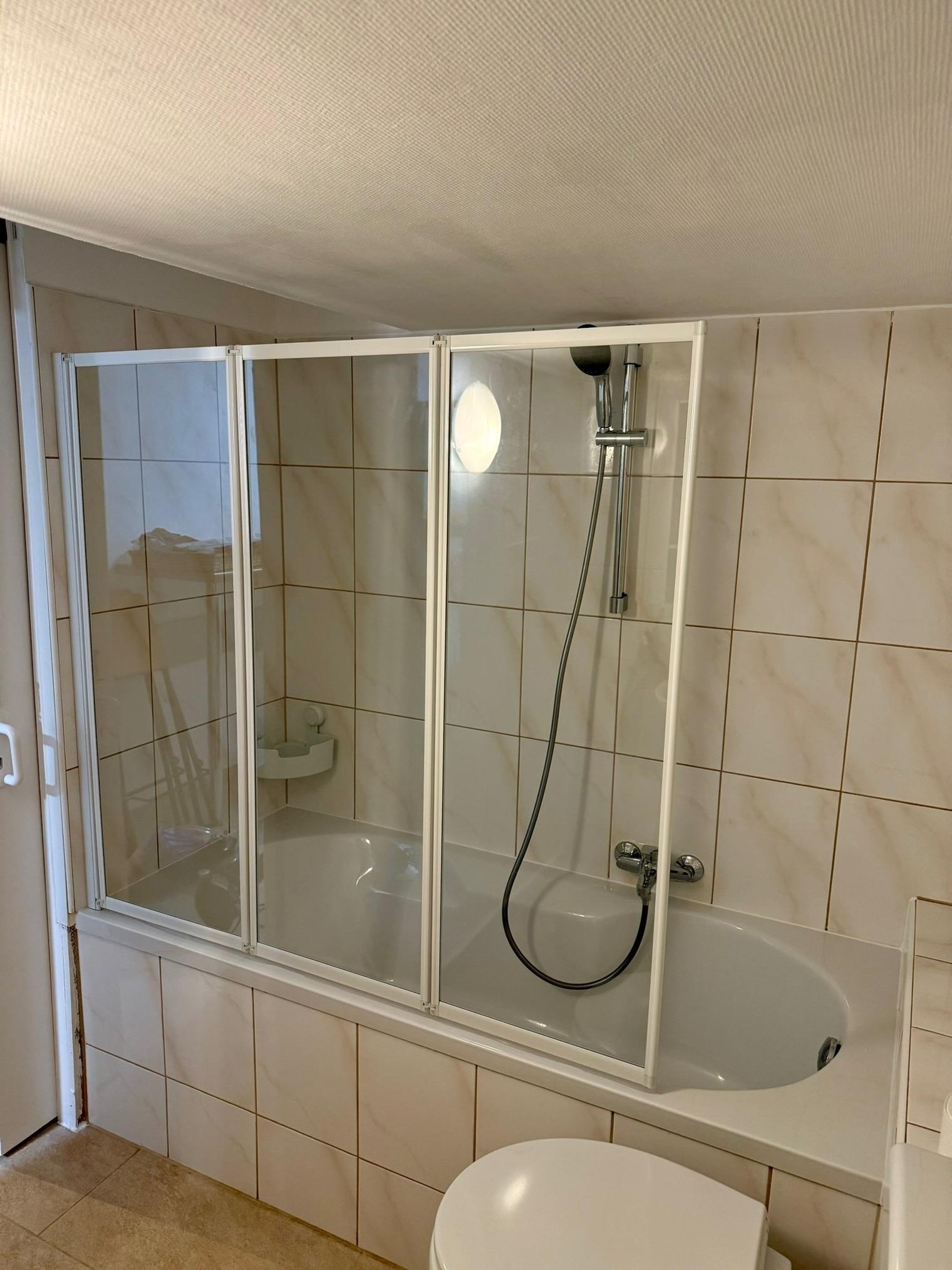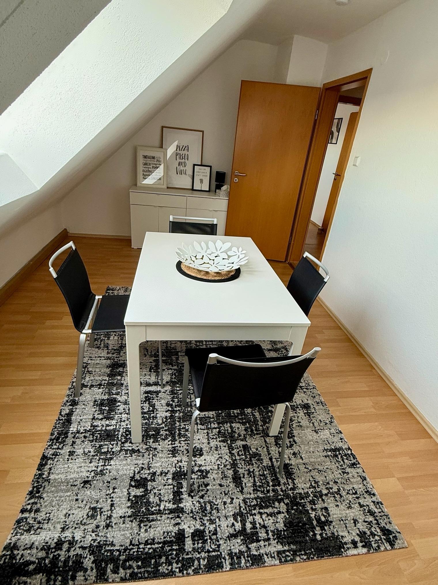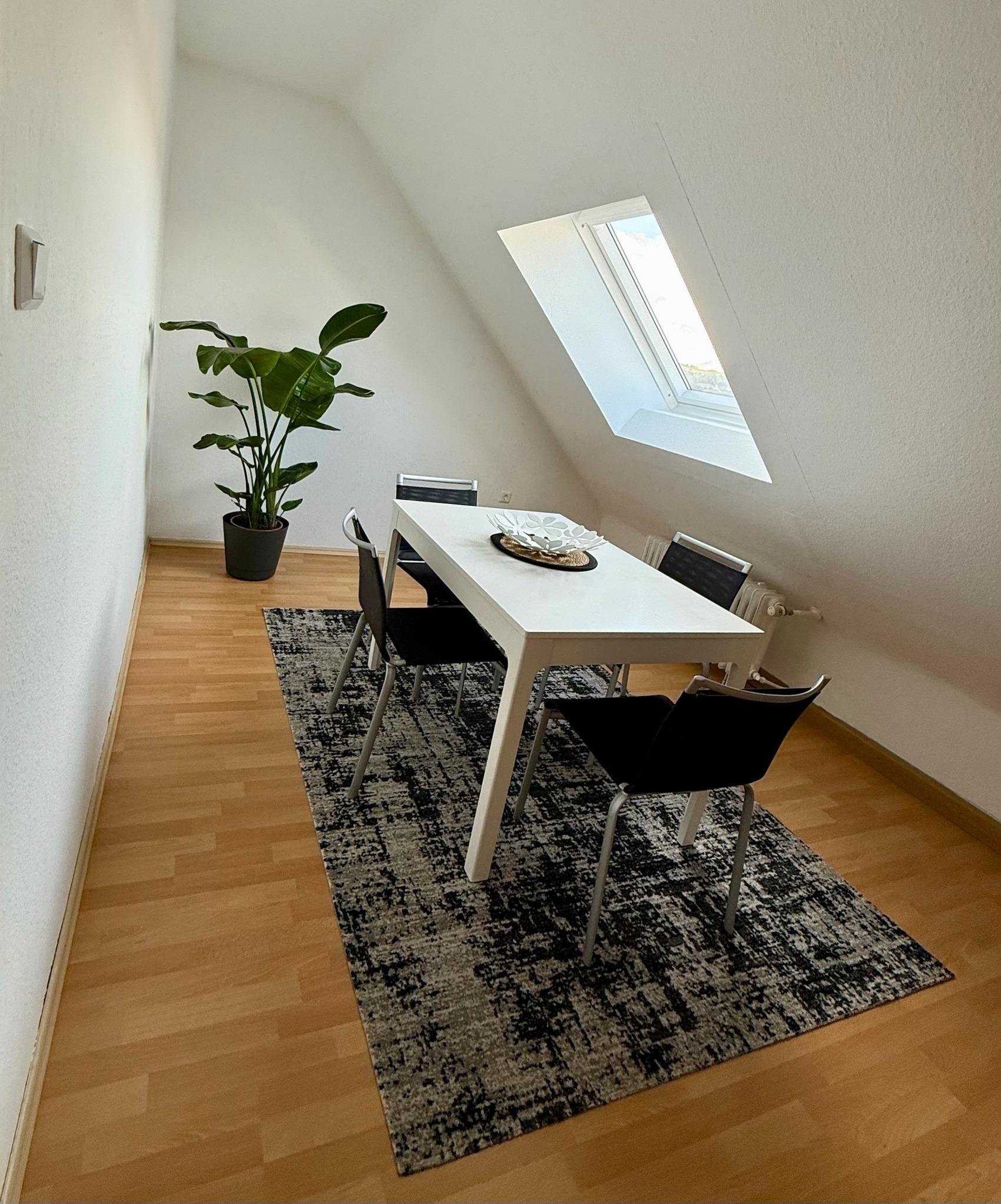 Helle und gepflegte Dachgeschosswohnung mit Schlafzimmer, Wohnzimmer und separatem Esszimmer. Im Wohnzimmer befindet sich ein ausziehbares Sofa,