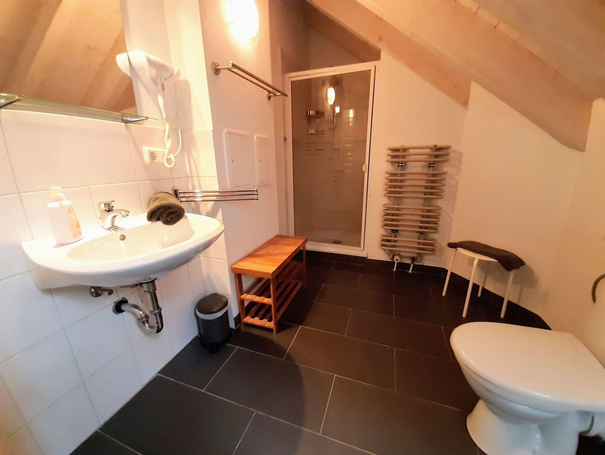 Die Galerie und die Emporen kombiniert mit den großen Fenstern gestalten das Ferienhaus offen und hell. Neben einer Zentralheizung befindet sich noch ein automatisch befüllter Pelletofen im Ferienhaus. In jeder Etage befindet sich ein Bad mit WC und Dusche.