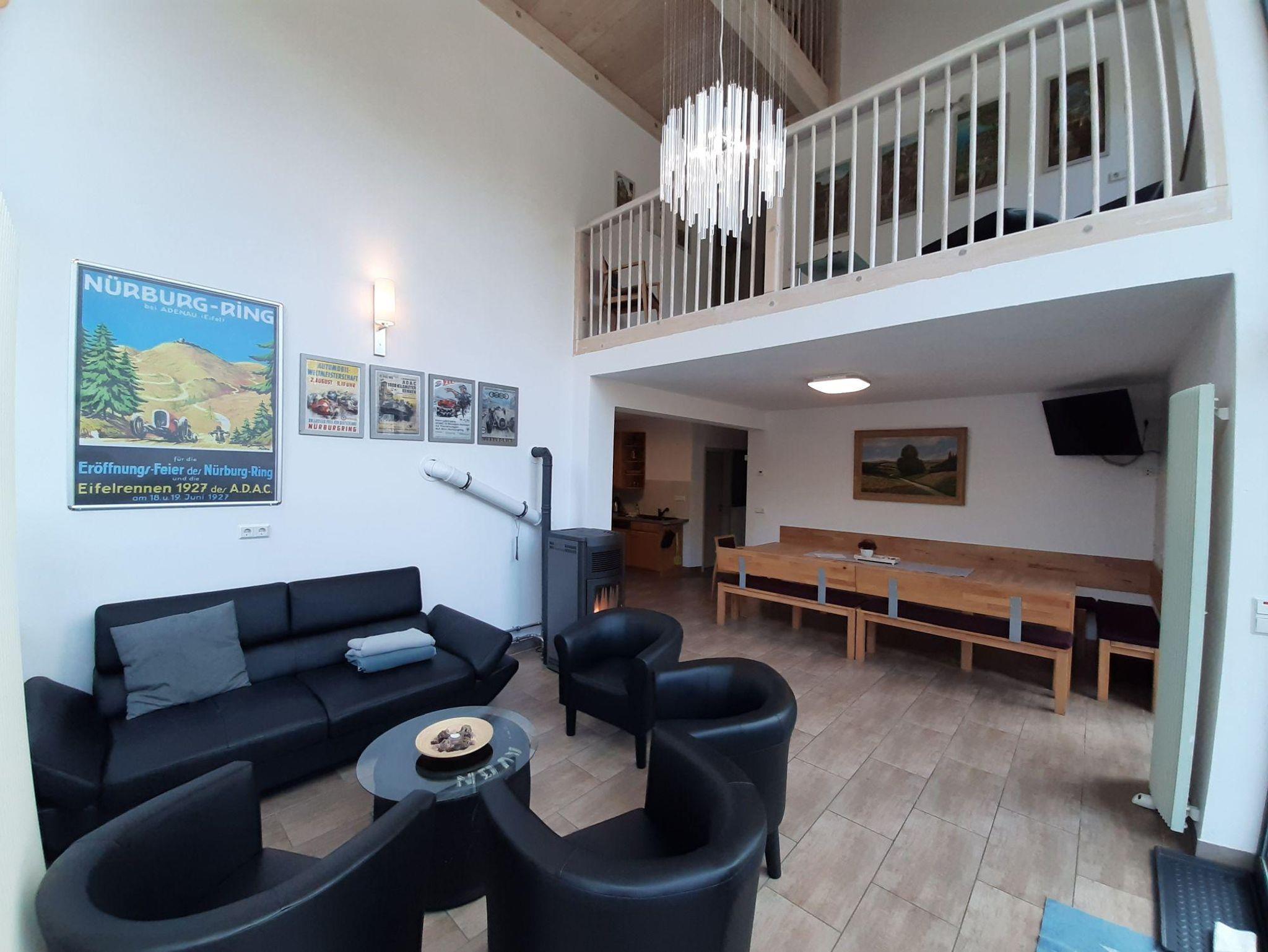 Großes modernes Ferienhaus mit Galerie & Emporen für bis zu 16 Gäste Das Ferienhaus Eifel-Atrium bietet auf 150m² fünf Schlafzimmer, drei Bädern und eine große Galerie als kombinierter Ess,- Wohn,- und Küchenbereich sowie zwei Emporen mit weiteren Wohnbereichen. Die optimale Belegung ist mit 14 Personen, jedoch stehen noch weitere Betten und Schlafsofas für eine größere Gästegruppe zur Verfügung.