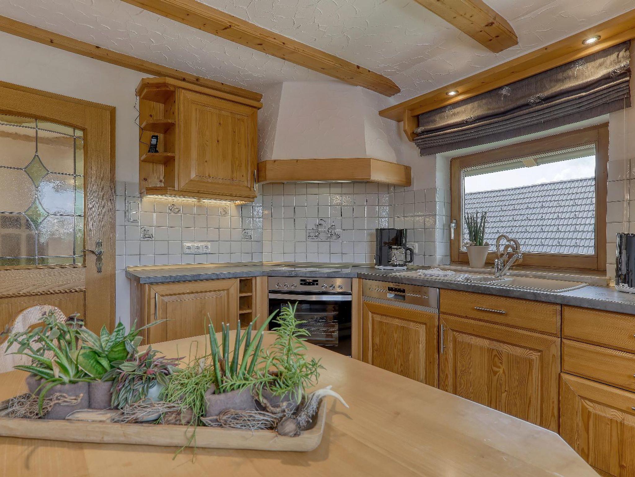 Die Vollholzküche ist komplett ausgestattet mit Geschirrspüler, Herd mit Ceranfeld und Backofen, Kühlschrank mit Gefrierfach, Wasserkocher, Toaster, Kaffeemaschine, Kaffeevollautomat, Mikrowelle sowie Geschirr. Eine Eckbank mit Tisch und Stuhl lädt zum gemeinsamen Essen ein. Ein Parkplatz direkt am Haus, Abstellmöglichkeiten für Fahrräder und Ski runden das Angebot ab.