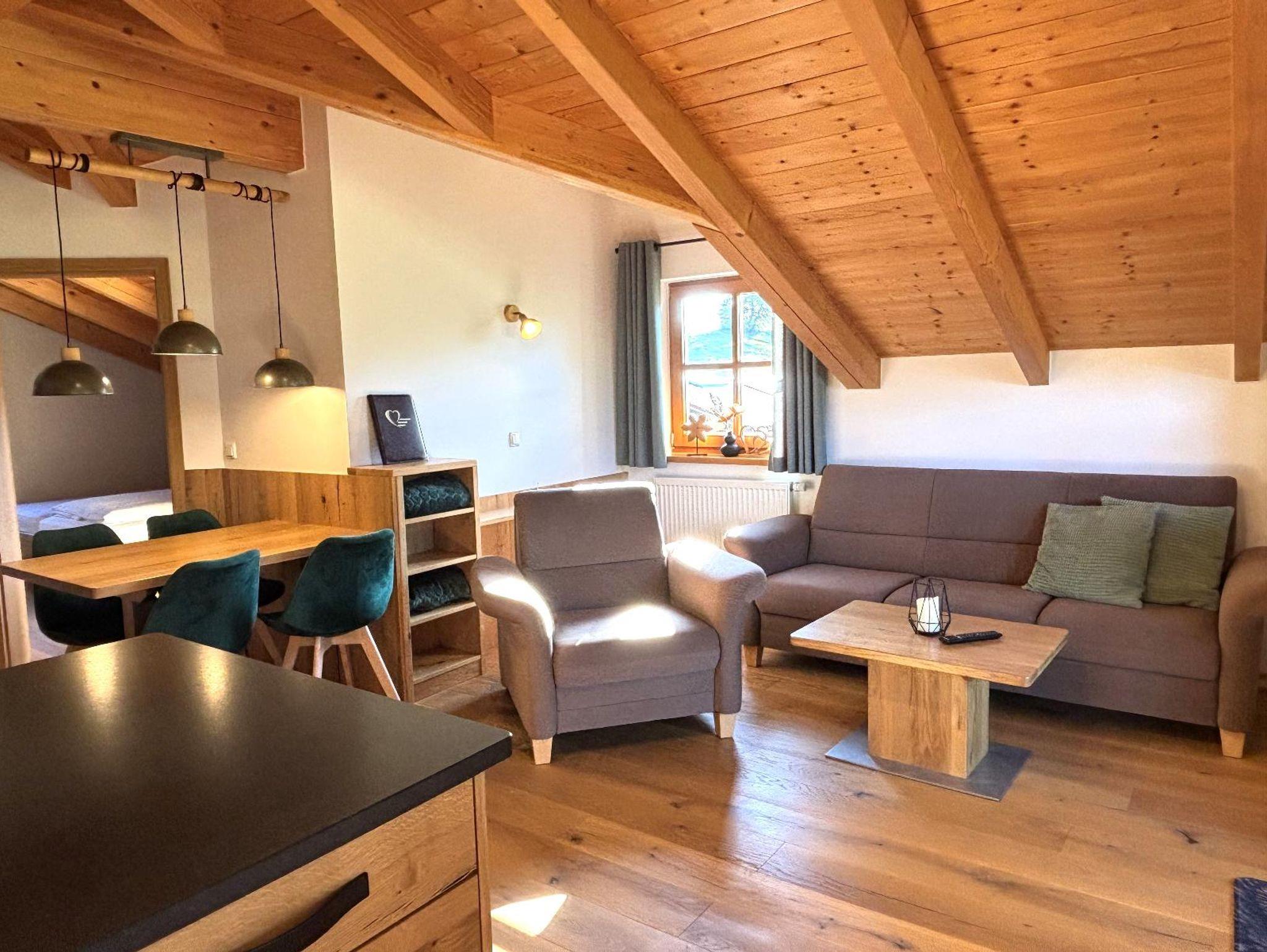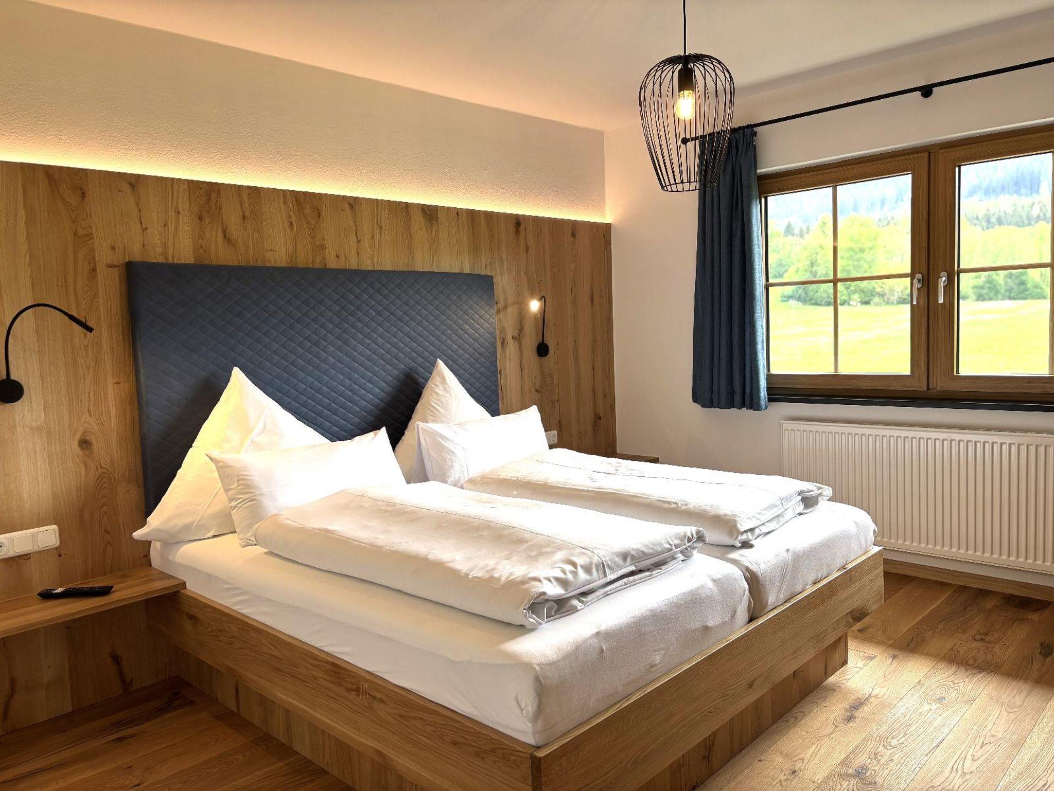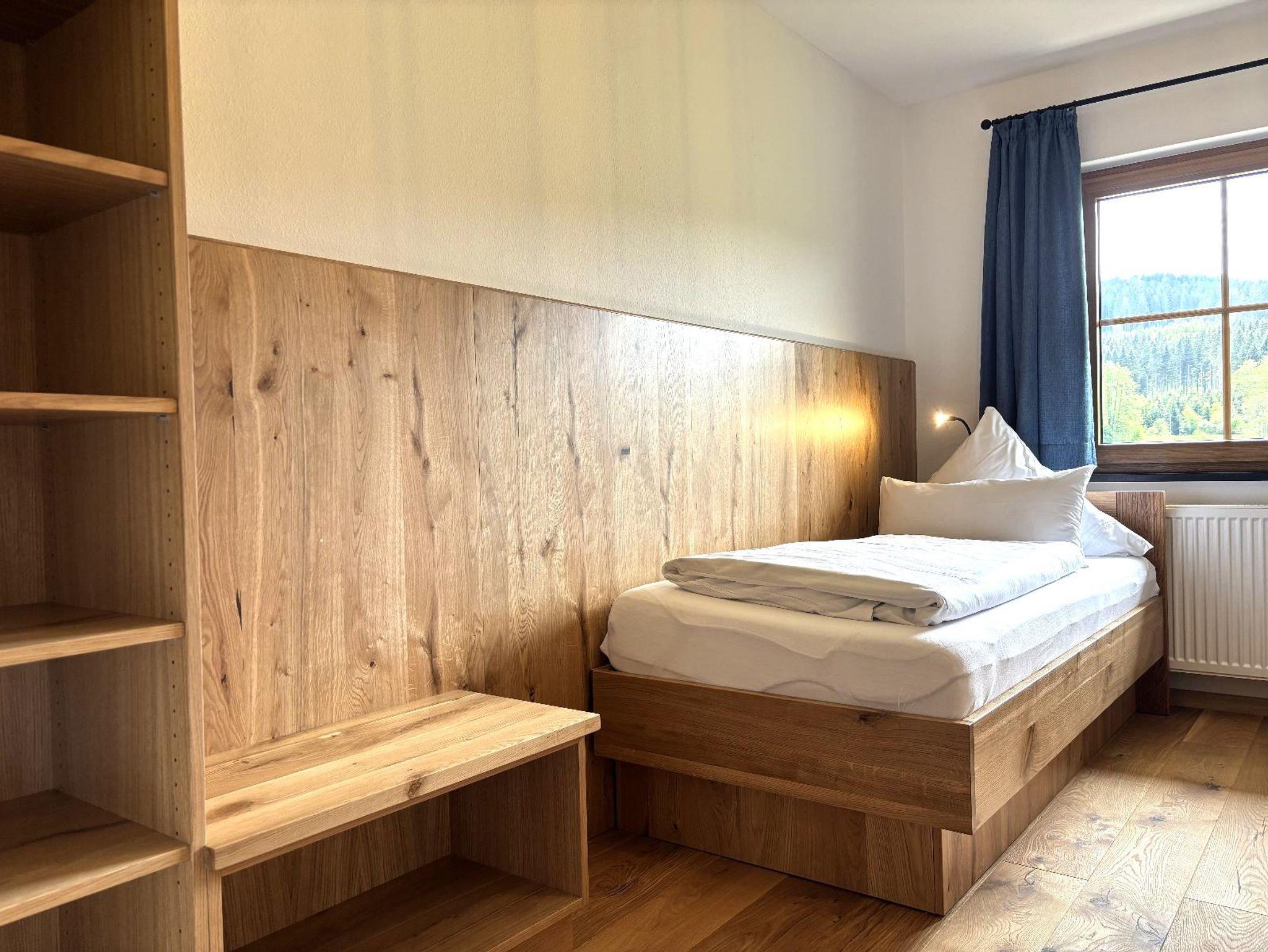 Unsere ebenerdige, sonnige Ferienwohnung bietet auf ca. 80 m² Platz für bis zu 5 Personen und ist ideal für Gäste, die ihren Urlaub gerne viel im Freien auf der Terrasse verbringen. Die große Südterrasse ist mit eigenen Gartenmöbeln wie Tisch, Bank, Sonnenschirm, Liegestühlen und Wäscheständer sowie einem Weber-Elektrogrill ausgestattet und bietet einen herrlichen Blick auf Wald und Wiesen. Die Wohnung verfügt über zwei Schlafzimmer mit Holzfußboden, darunter ein Schlafzimmer mit Doppelbett, Flachbild-SAT-TV und Safe sowie ein Schlafzimmer mit zwei Einzelbetten. Auf Wunsch stellen wir Ihnen gerne ein Zustellbett, ein Babyreisebett inklusive bezogenem Bettzeug, einen Hochstuhl oder einen Rausfallschutz zur Verfügung. Das große Badezimmer ist mit Dusche, WC, Waschbecken, Handtüchern und Föhn ausgestattet. Bettwäsche, Handtücher und Geschirrtücher sind inklusive. Das gemütliche Wohnzimmer mit Holzfußboden bietet eine kuschelige Eckcouch, Tisch und Wohnwand, Flachbild-SAT-TV, Radio sowie WLAN. Die separate Küche mit Eckbank und Holztisch verfügt über eine sehr gut ausgestattete Küchenzeile mit Geschirrspüler, Herd mit Cerankochfeld und Backofen, Kühlschrank mit Gefrierschrank, Wasserkocher, Toaster, Kaffeemaschine, Dolce-Gusto-Maschine und Kaffeevollautomat, ausreichend Geschirr sowie einer kleinen Kaffee- und Teeauswahl. Ein Parkplatz befindet sich direkt am Haus, außerdem stehen Abstellmöglichkeiten für Fahrräder und Ski zur Verfügung. Für einen entspannten Start in den Tag bieten wir liebevoll zusammengestellte Frühstückskörbe, Frühstück in unserer nahegelegenen Pension oder einen bequemen Semmel-Service an. Ihre Kinder finden viel Spaß in unserer Spielscheune mit Kinderspielparadies. Unser Wellnessbereich erhält derzeit ein neues Make-over; ab Juni erwarten Sie eine finnische Sauna, ein Jacuzzi für bis zu vier Personen sowie Schwebeliegen. Nach Eintrag in die Belegungsliste steht Ihnen der Wellnessbereich stundenweise exklusiv gegen eine kleine Gebühr zur Verfügung. Bitte beachten Sie, dass Onlinebuchungen Gebühren enthalten und in der Ferienwohnung Leithenwald Haustiere nicht erlaubt sind.