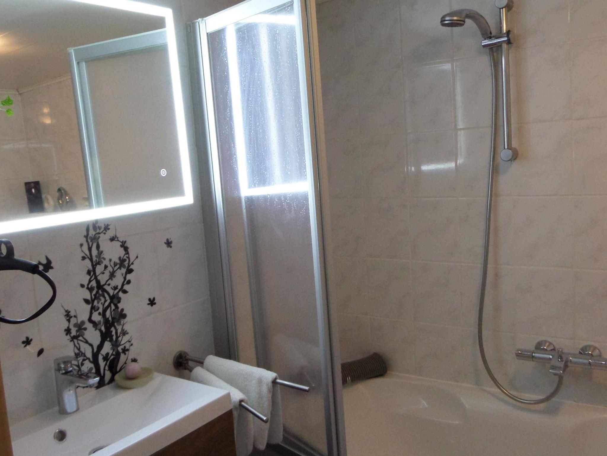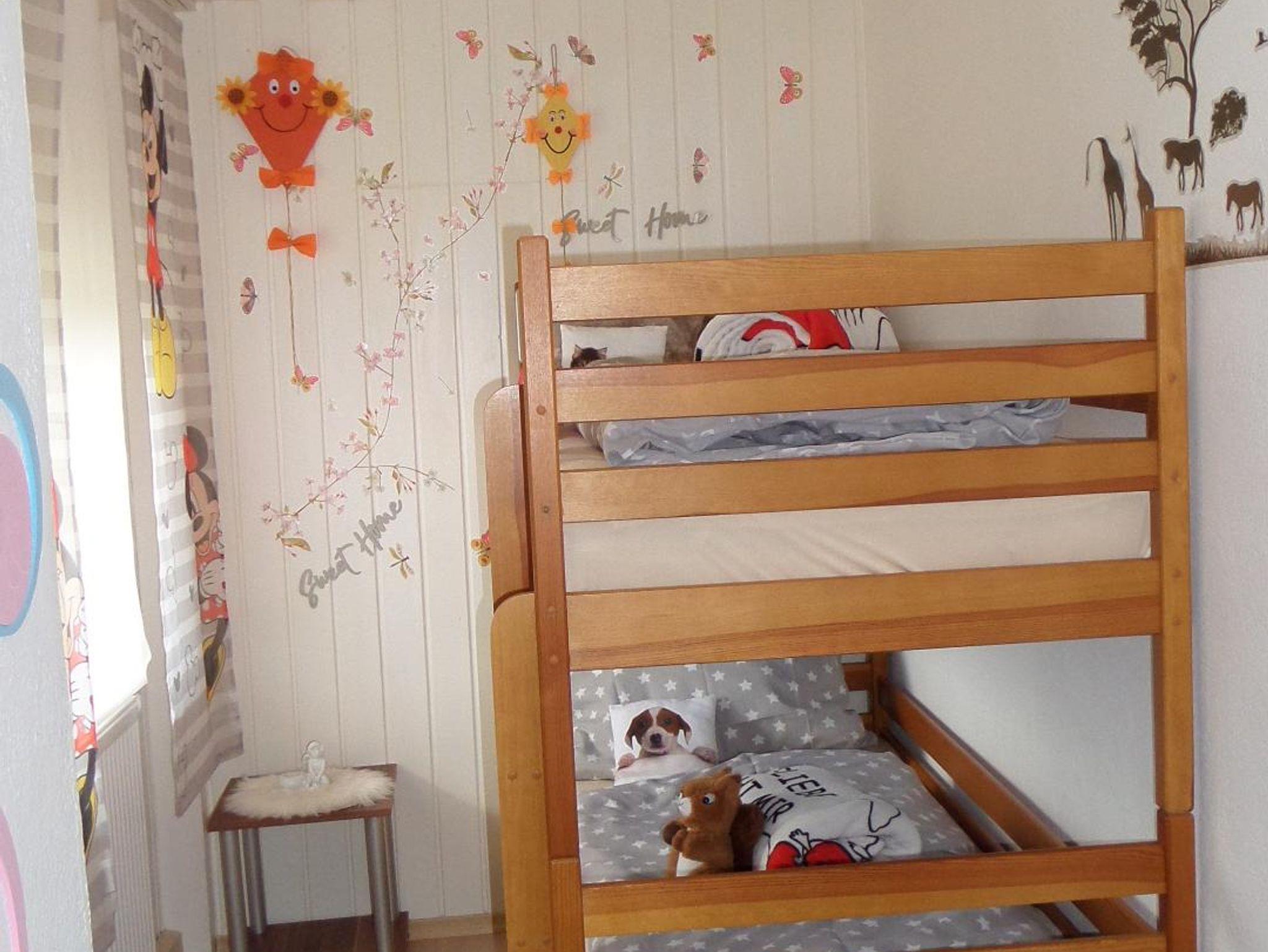 1 Schlafzimmer mit Doppelbett plus 1 Zustellbett, 1 Etagenbett, kompl. Küche mit Micro, Geschirrspüler, großes Wohnzimmer, Bad /Dusche /WC .