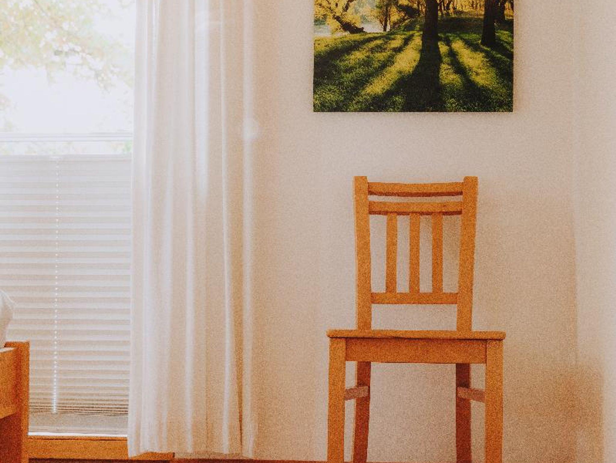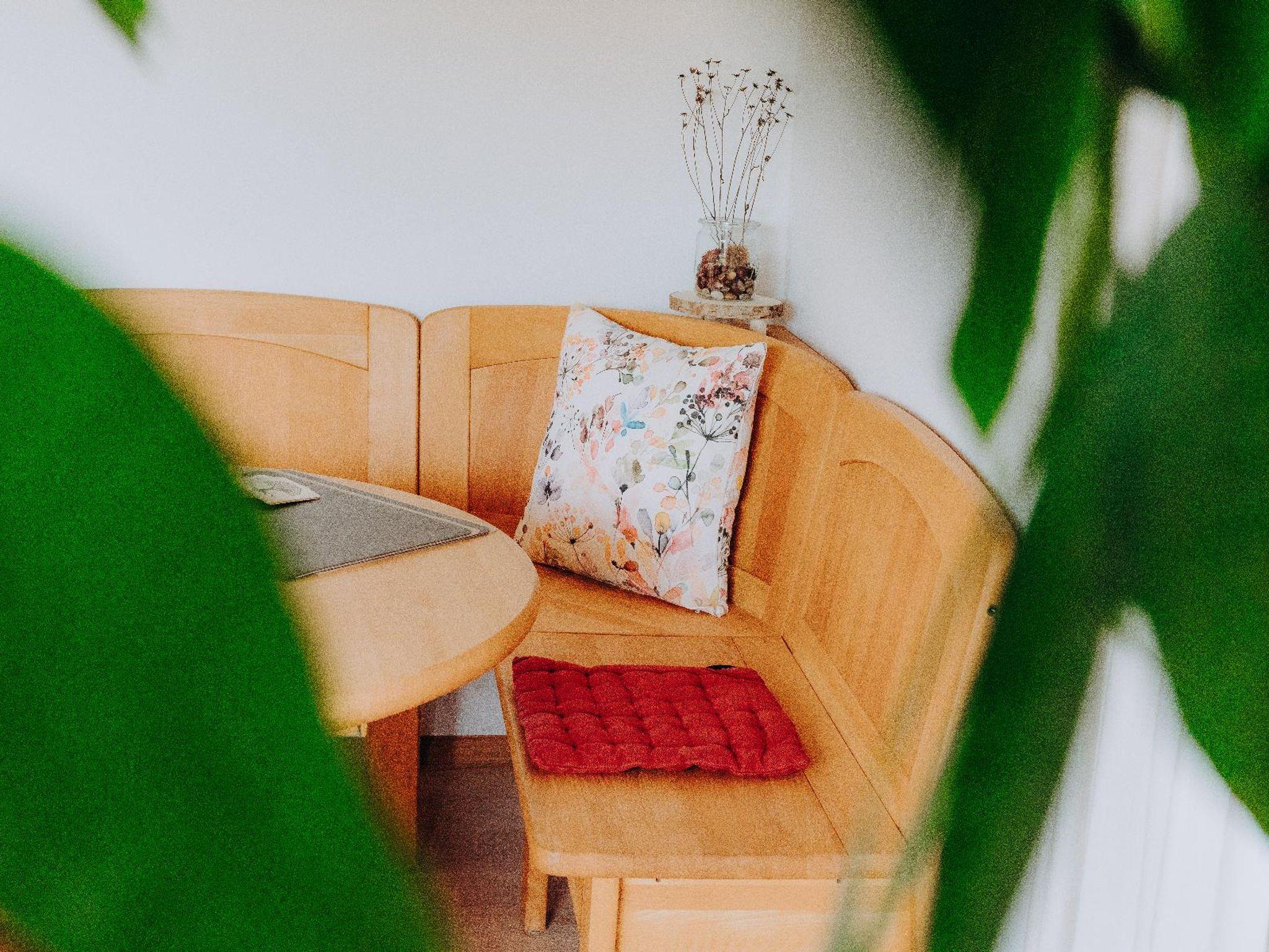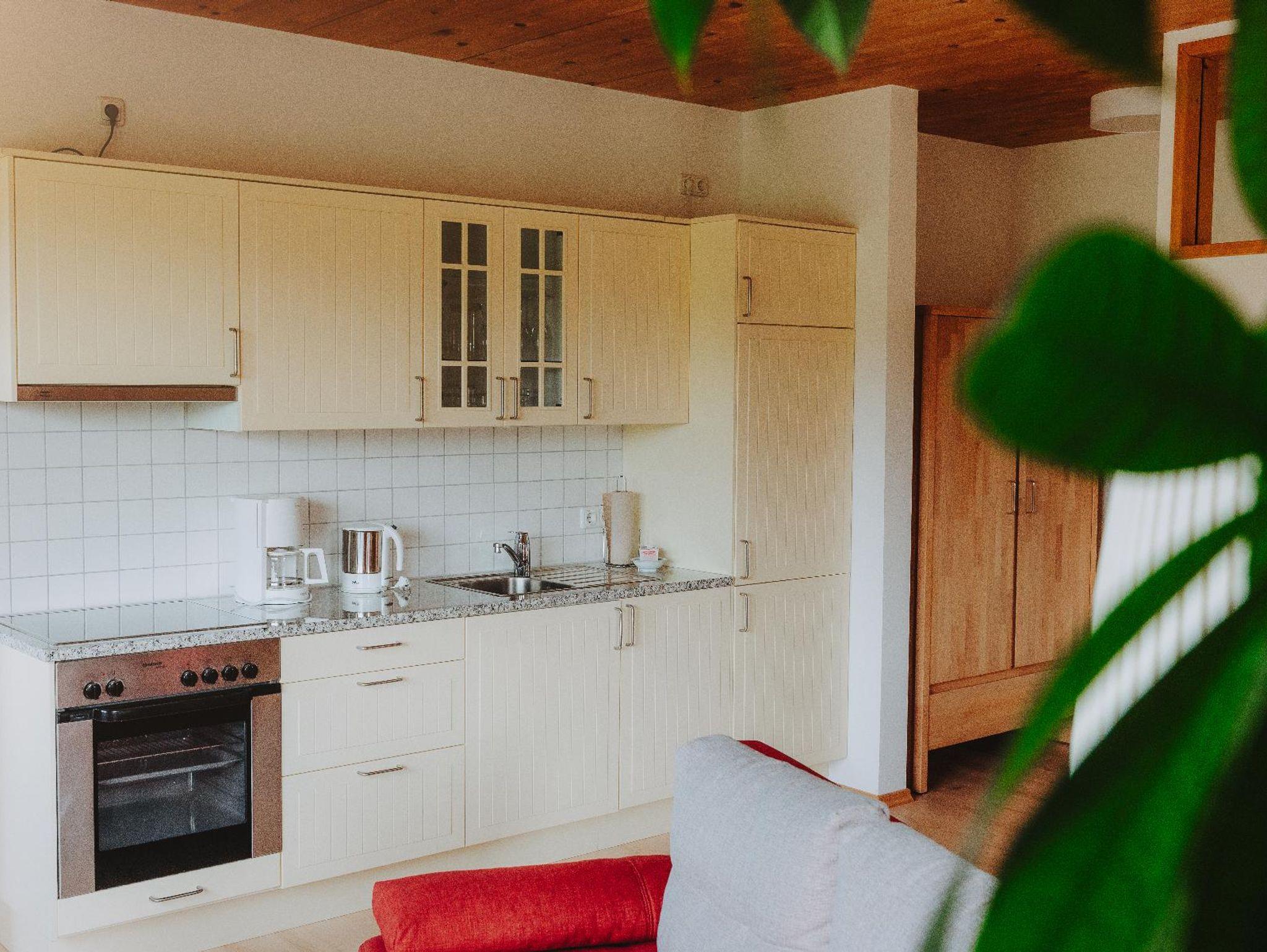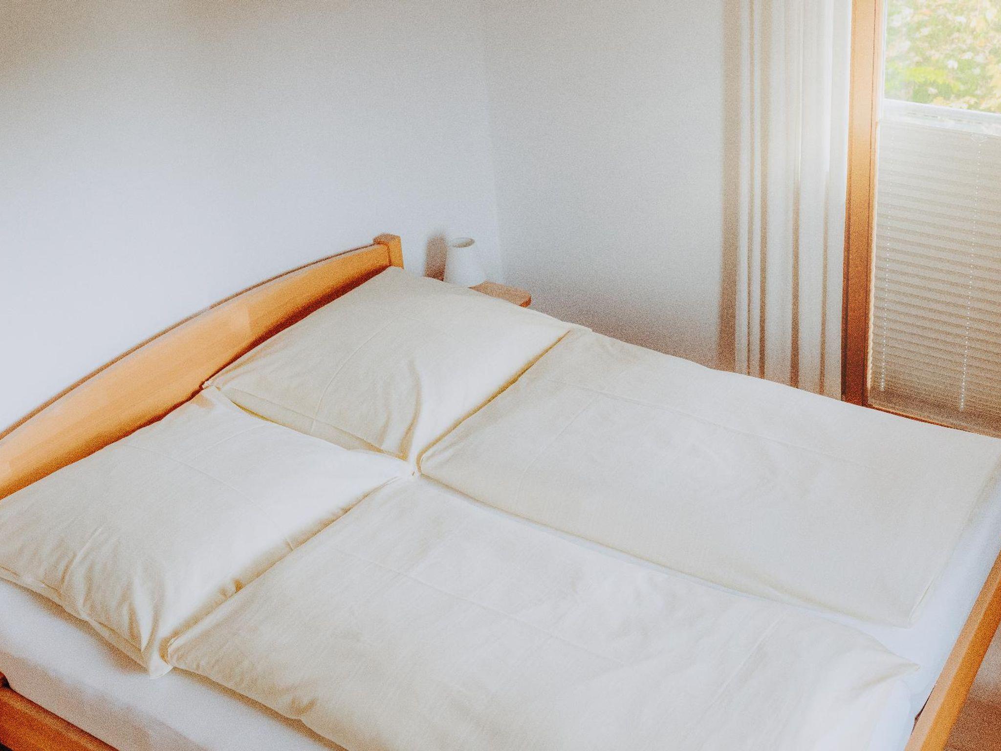 Ferienwohnung Nr. 1 im 1. Stock (42 qm) mit großem Balkon mit Liegestuhl und Sitzgruppe. Appartement ist open-plan gestaltet und hat hochwertigen Wineo-Bioboden. Voll ausgestattete Küchenzeile mit Wasserkocher und Filterkaffeemaschine. Essgruppe mit rundem Tisch aus Vollholz, Im Schlafbereich Doppelbett (160 cm) aus Vollholz mit verstellbarem Lattenrost und Wende-Matratzen in zwei wählbaren Festigkeiten. Großes oder kleineres Kopfkissen zur Auswahl. Netzfreischalter im Schlafbereich. Möglichkeit für dritte Person auf dem Sofabett zu schlafen. DU/WC mit wohliger Fußbodenheizung. Handtücher und Bettwäsche inklusive. Verdunkelungsvorhänge. Gratis WLAN und SAT-TV.