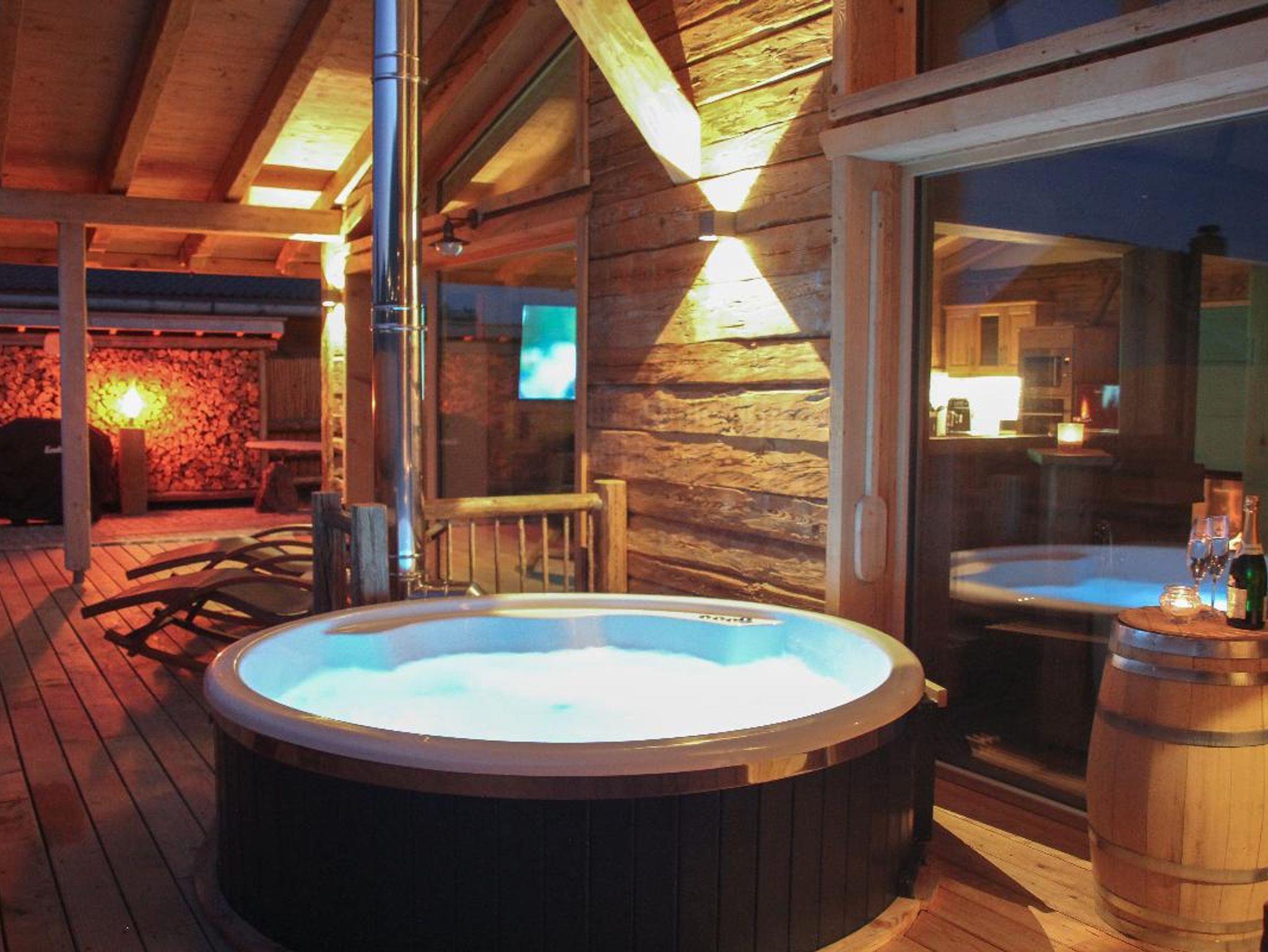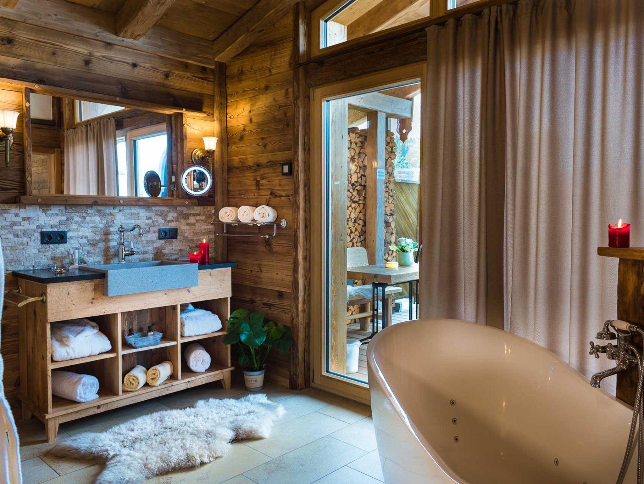 Ein Highlight in ihrer eigenen kleinen Hütte ist ihr eigener Wellnessbereich mit einer urigen Finnischen Sauna aus Altholz, einer großzügigen Standbadewanne mit LED und Massagedüsen sowie einer großen ebenerdigen Regendusche mit Schwallbrause.