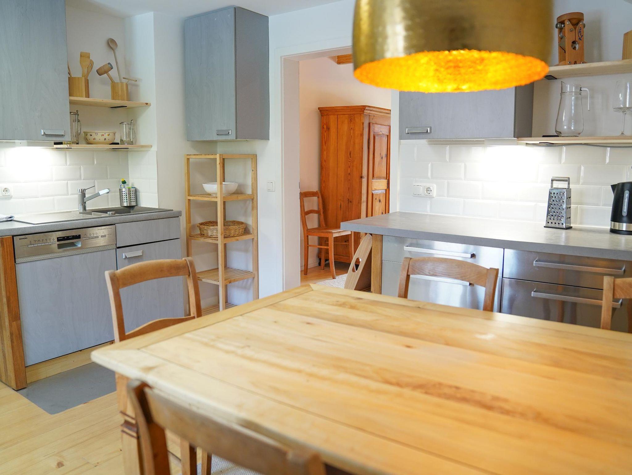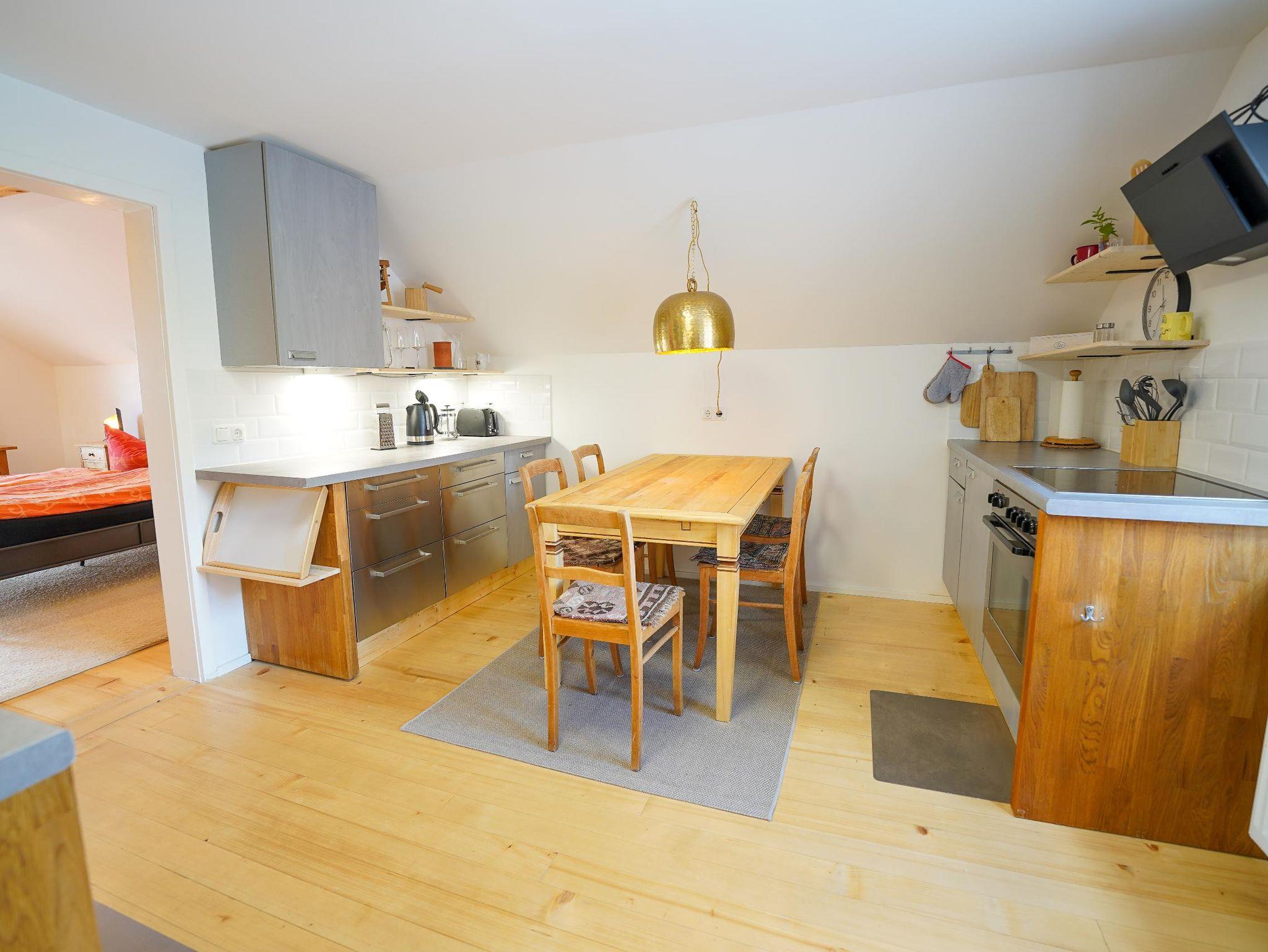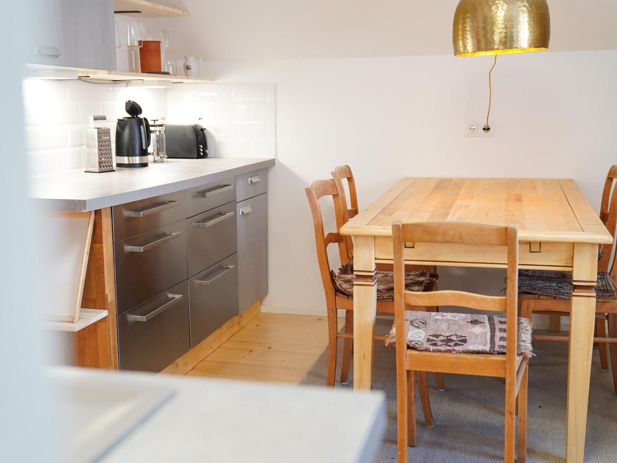 Vom Flur aus haben Sie Zugang zum Abstellraum mit Trockner, dem Duschbad mit Waschmaschine, dem Wohnzimmer und der Küche. Diese ist voll ausgestattet mit E-Herd, Spülmaschine, Kühl-Gefrierkombination, Kaffeevollautomat, Toaster, zahlreichen Schränken und dem Esstisch, an dem auch Gäste mit bewirtet werden können. Das Schlafzimmer mit Doppelbett (160 cm breit), geräumigen Kleiderschrank und kleinem Schreibtisch hat einen Zugang zum Balkon. Im Wohnzimmer lädt eine (ausziehbare) Couch zu gemütlichen Stunden ein beim Ratschen, TV-Schauen, beim Blick auf das Feuer im Kaminofen oder einfach beim Träumen. Ein kleiner Schreibtisch steht für das Homeoffice bereit. Auch vom Wohnzimmer haben Sie Zugang zum Balkon.