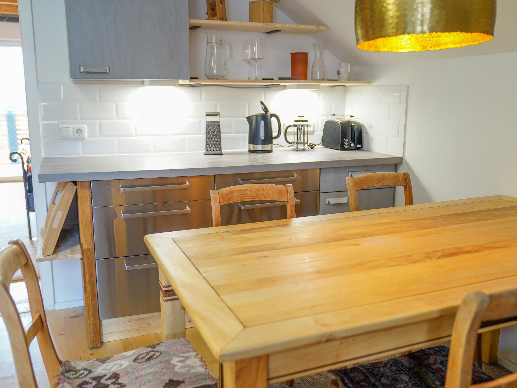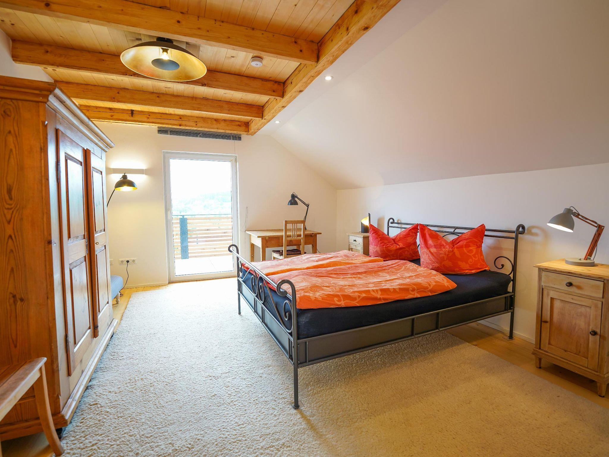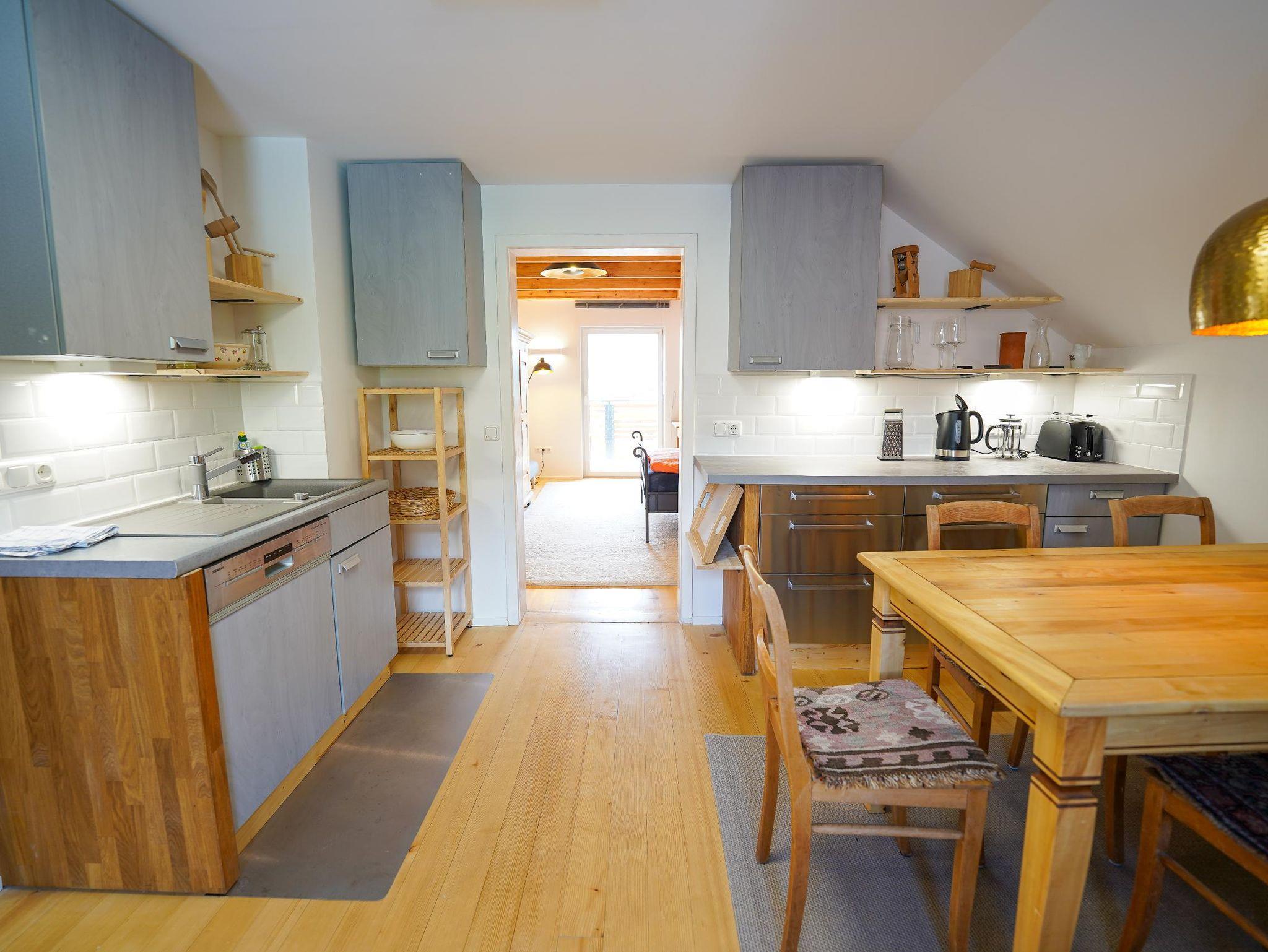Vom Flur aus haben Sie Zugang zum Abstellraum mit Trockner, dem Duschbad mit Waschmaschine, dem Wohnzimmer und der Küche. Diese ist voll ausgestattet mit E-Herd, Spülmaschine, Kühl-Gefrierkombination, Kaffeevollautomat, Toaster, zahlreichen Schränken und dem Esstisch, an dem auch Gäste mit bewirtet werden können. Das Schlafzimmer mit Doppelbett (160 cm breit), geräumigen Kleiderschrank und kleinem Schreibtisch hat einen Zugang zum Balkon. Im Wohnzimmer lädt eine (ausziehbare) Couch zu gemütlichen Stunden ein beim Ratschen, TV-Schauen, beim Blick auf das Feuer im Kaminofen oder einfach beim Träumen. Ein kleiner Schreibtisch steht für das Homeoffice bereit. Auch vom Wohnzimmer haben Sie Zugang zum Balkon.