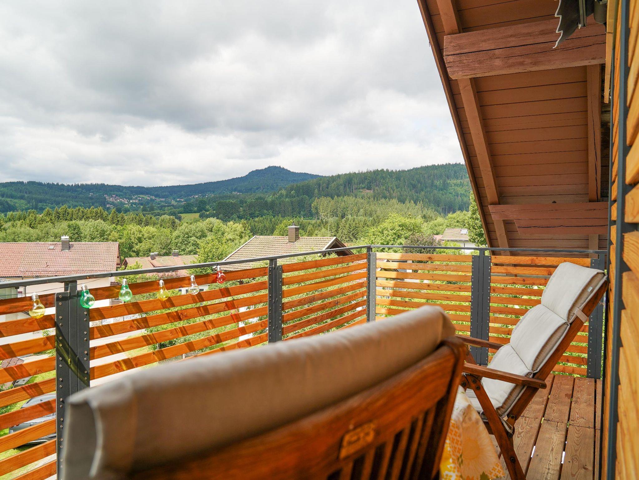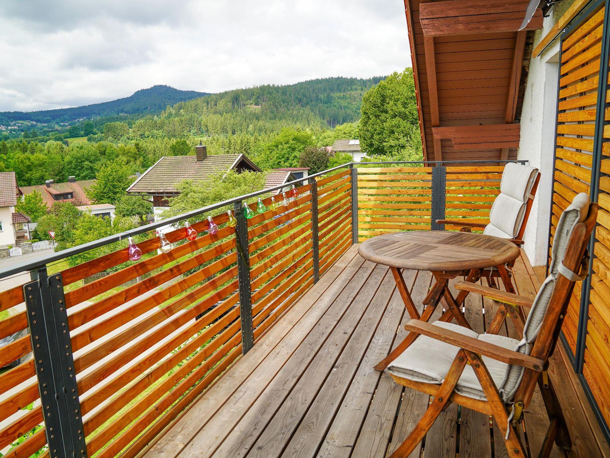Auf zwölf Quadratmetern mit Südwestausrichtung genießen Sie das Panorama des Bayerischen Waldes: Blick auf Rabenstein, den Hennenkobel und die Stadt Zwiesel. Ein Essplatz lässt den Sonnenuntergang an warmen Sommerabenden zum Erlebnis werden. Die Teakholzstühle lassen sich zur Liege umklappen. Eine Markise und ein Sonnenschirm spenden Schatten. Ebenso die Schiebeläden, die an heißen Sommertagen der Wohnung innen ein mediterranes Flair geben.