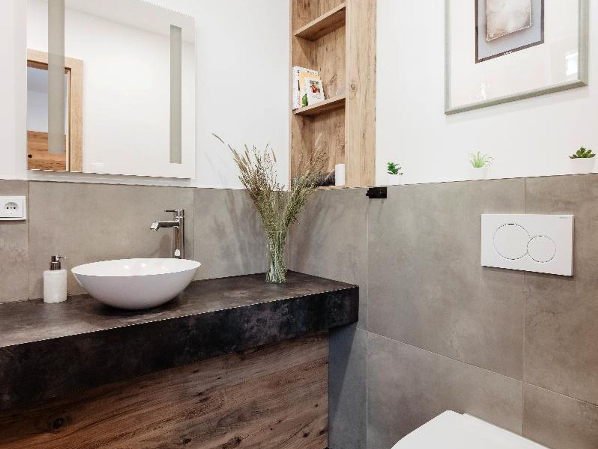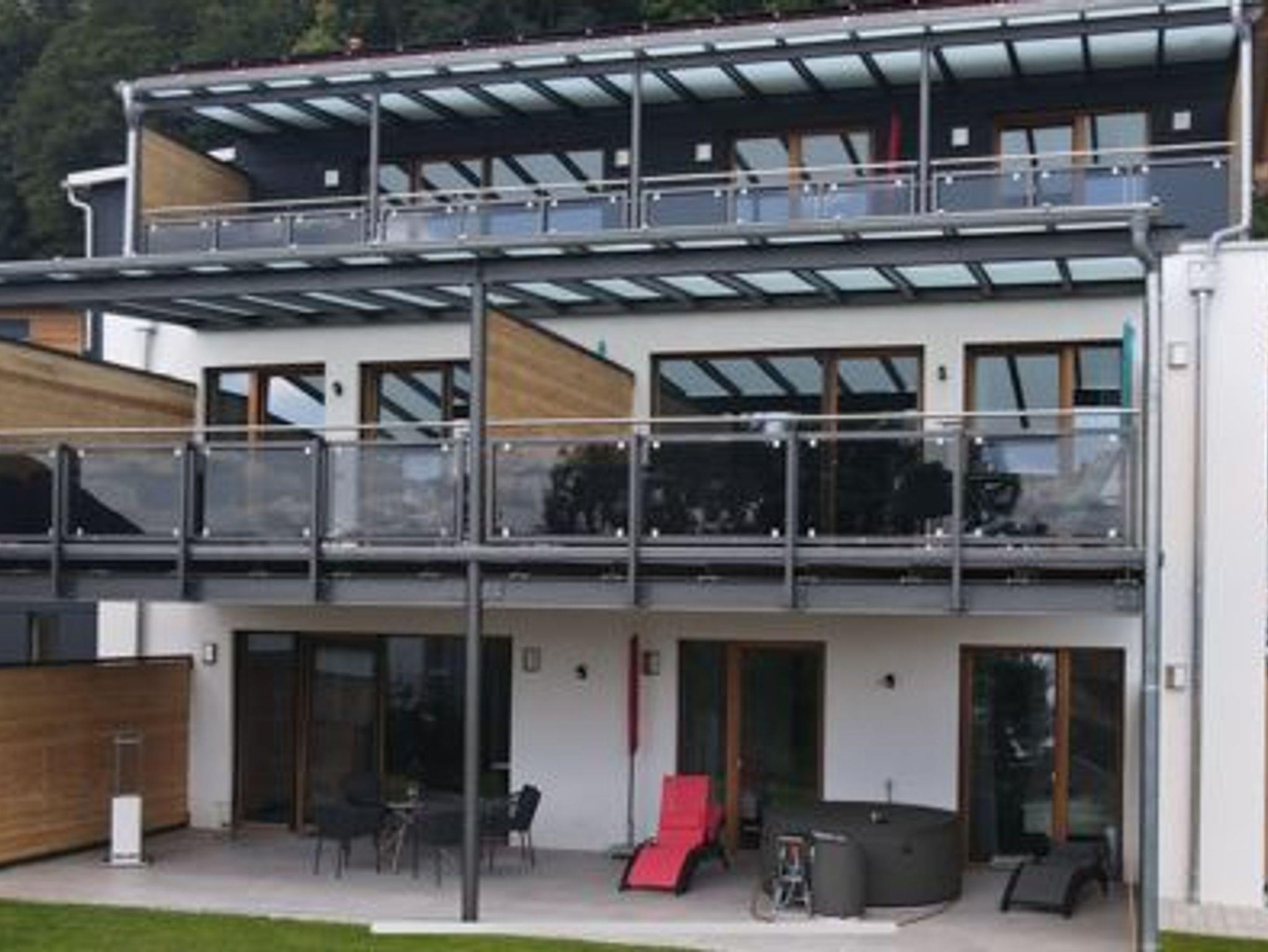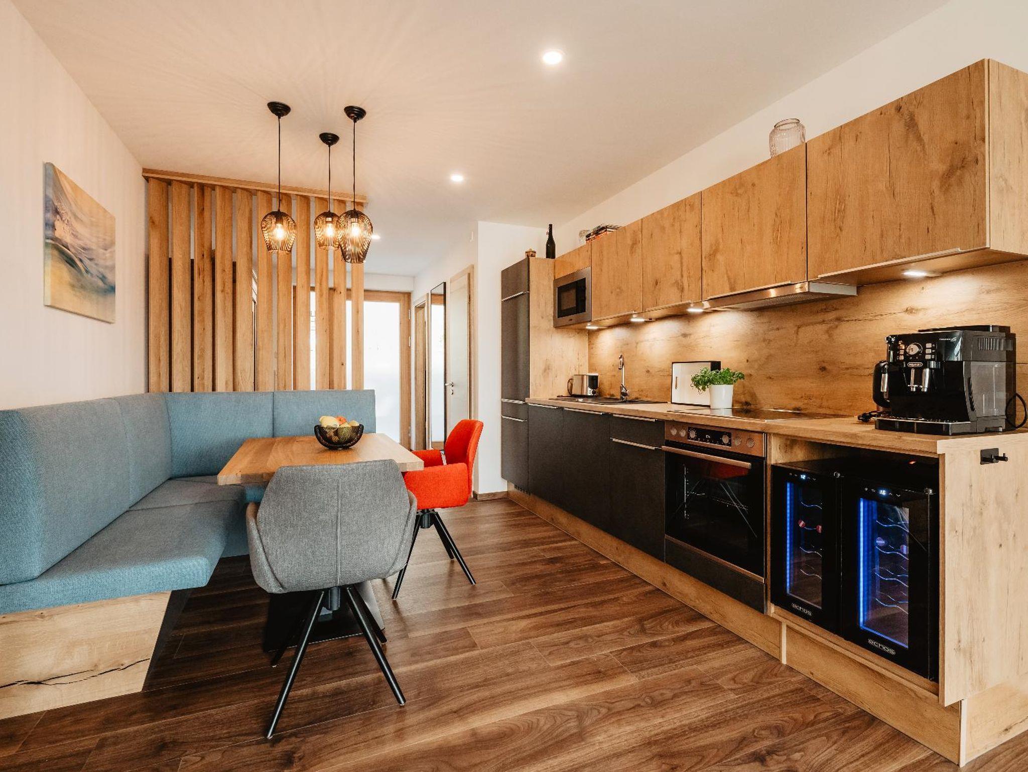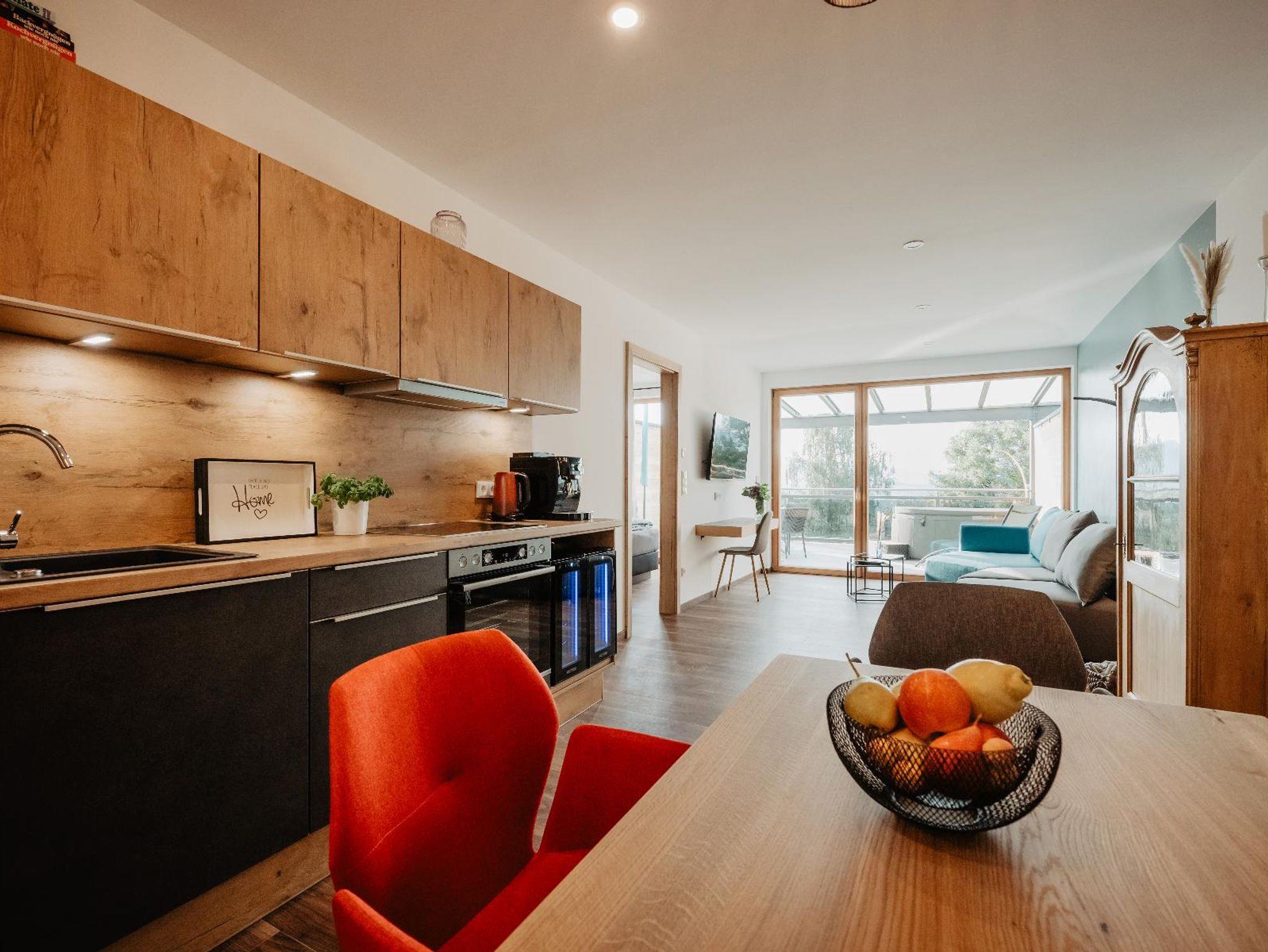 Im Eingangsbereich befindet sich die Garderobe mit Stauraum sowie die Toilette mit Fenster. Der großzügige Wohnbereich besteht aus einer gut ausgestatteten Küche mit Weinkühlschränken, Kaffeevollautomat, Mikrowelle usw., einem Essplatz, einer gemütlichen Couchecke und einem 55 Zoll Smart TV-Gerät. Von hier aus gelangt man in das Schlafzimmer mit hochwertigem Doppelbett und Smart TV. Nebenan liegt das großzügige Badezimmer mit steuerbarer Wellness-Ambiente-Beleuchtung, Einbauradio mit Bluetooth-Funktion, freistehender Badewanne, Walk-in-Regendusche und finnischer Sauna mit Infrarot-Bereich. Ein besonderes Highlight ist der 25 qm große überdachte Balkon, den man über Wohn- und Schlafzimmer betreten kann und der mit Sonnenliegen, Sitzgarnitur und einem Whirlpool ausgestattet ist. Von hier aus haben Sie eine traumhafte Aussicht auf die grandiose Landschaft.