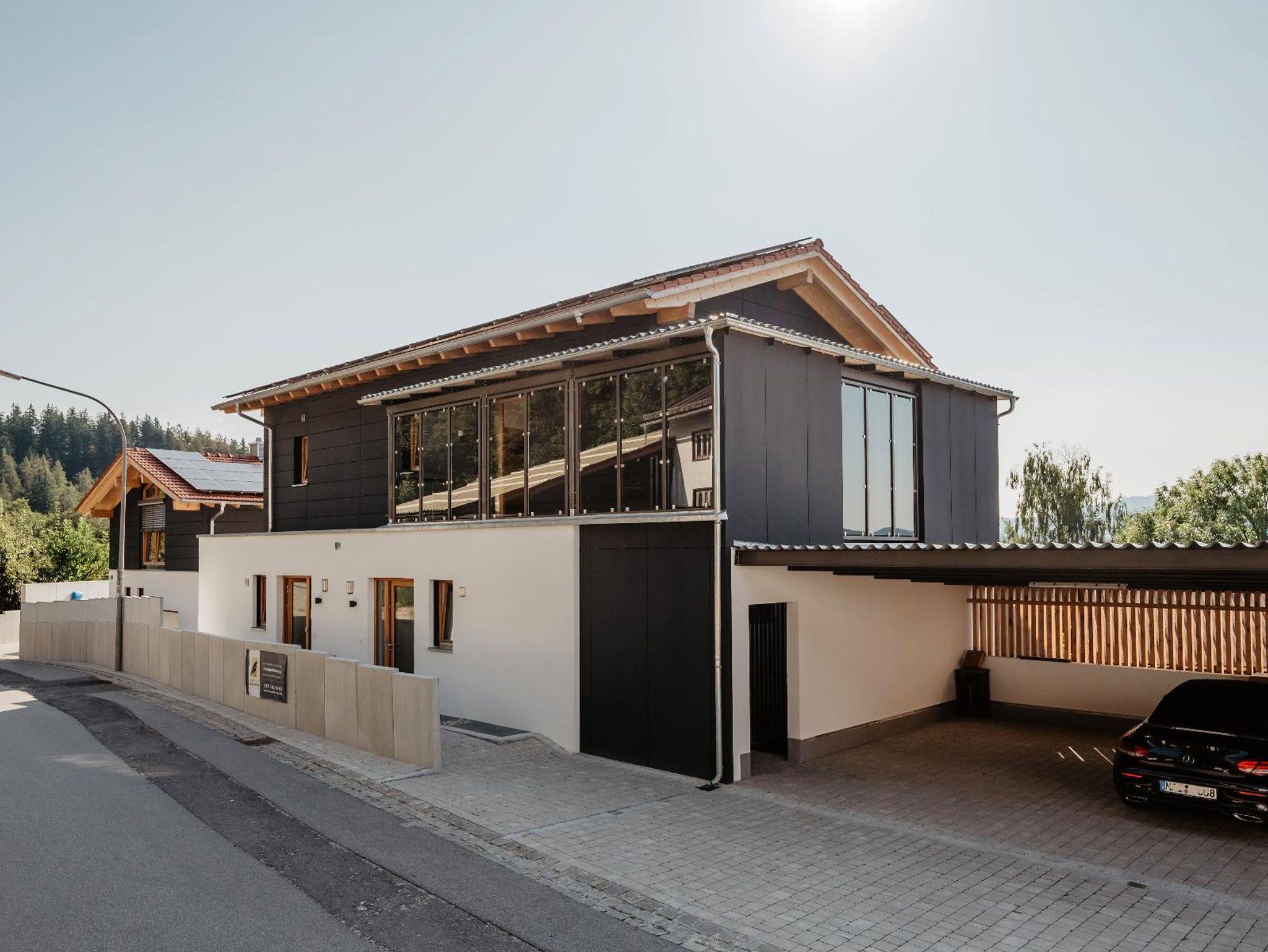 Unmittelbar am Haus befinden sich überdachte Car-Ports mit Ladestation für Ihr E-Auto, ebenso ein abschließbarer Fahrradraum.