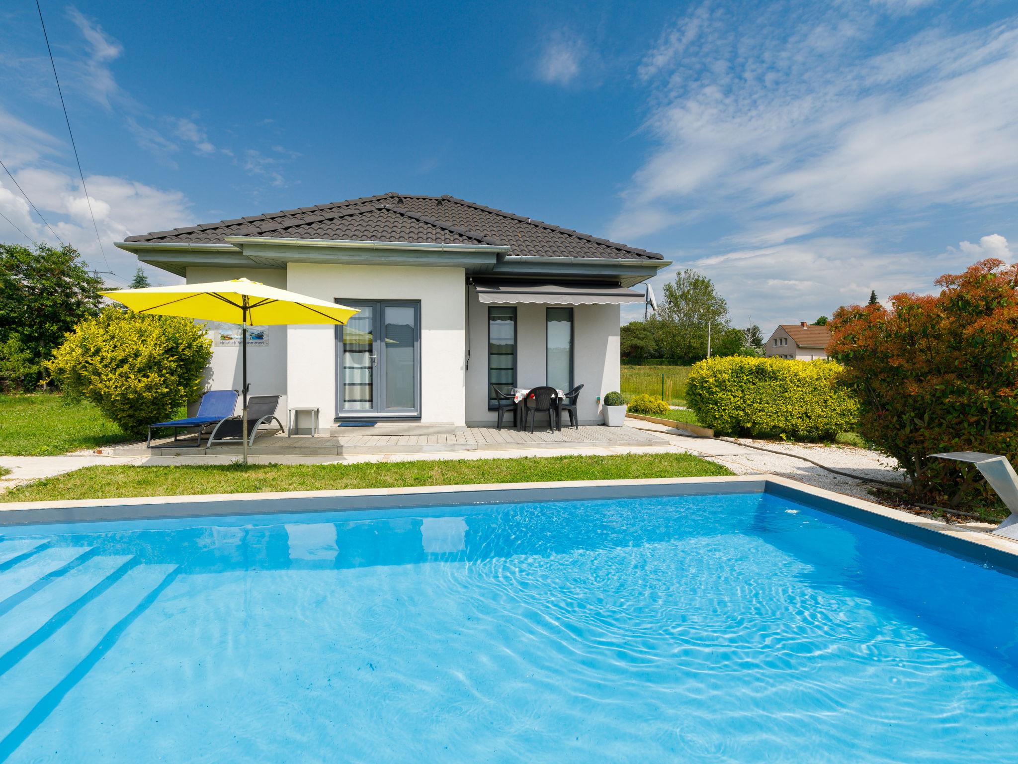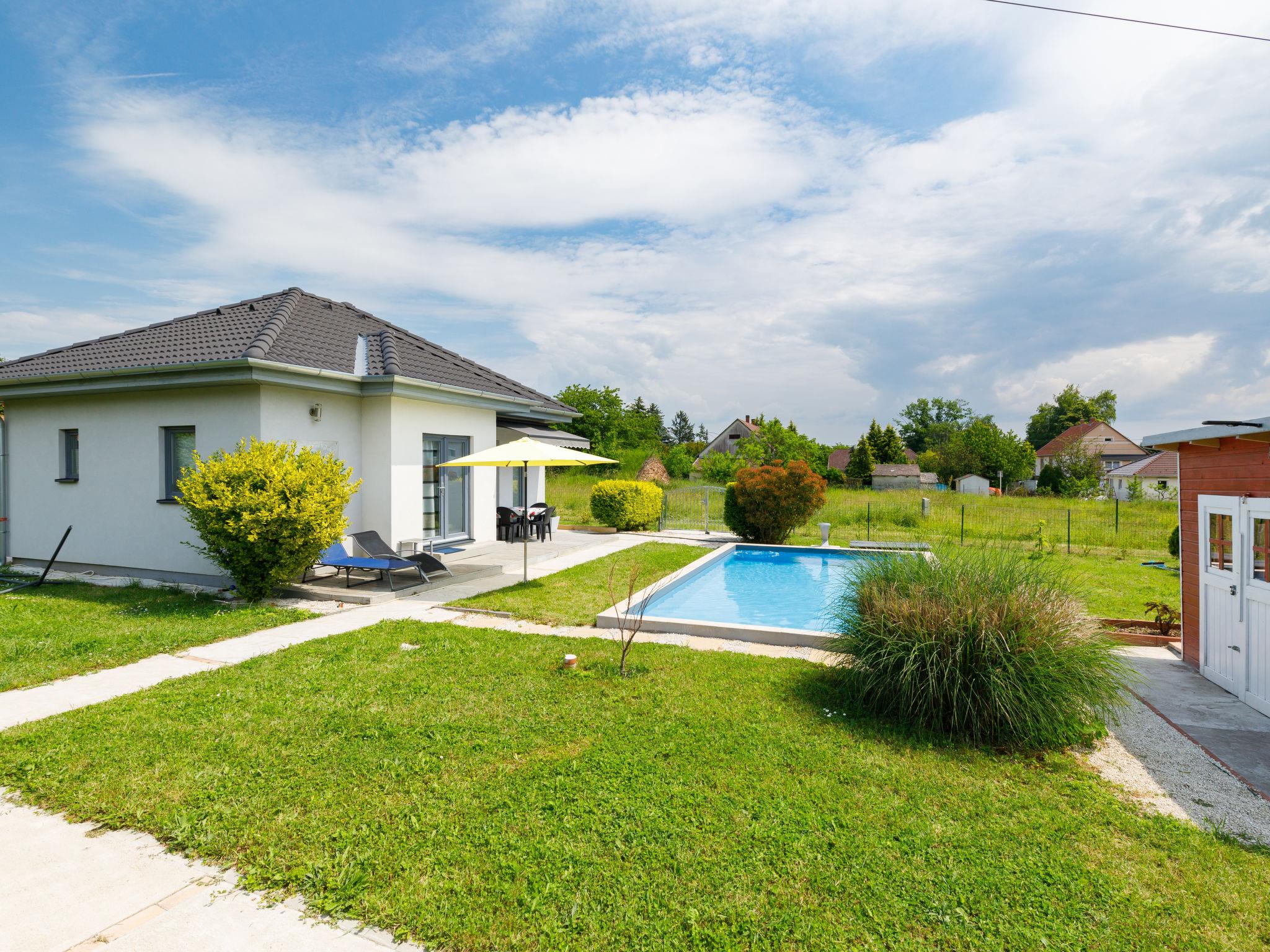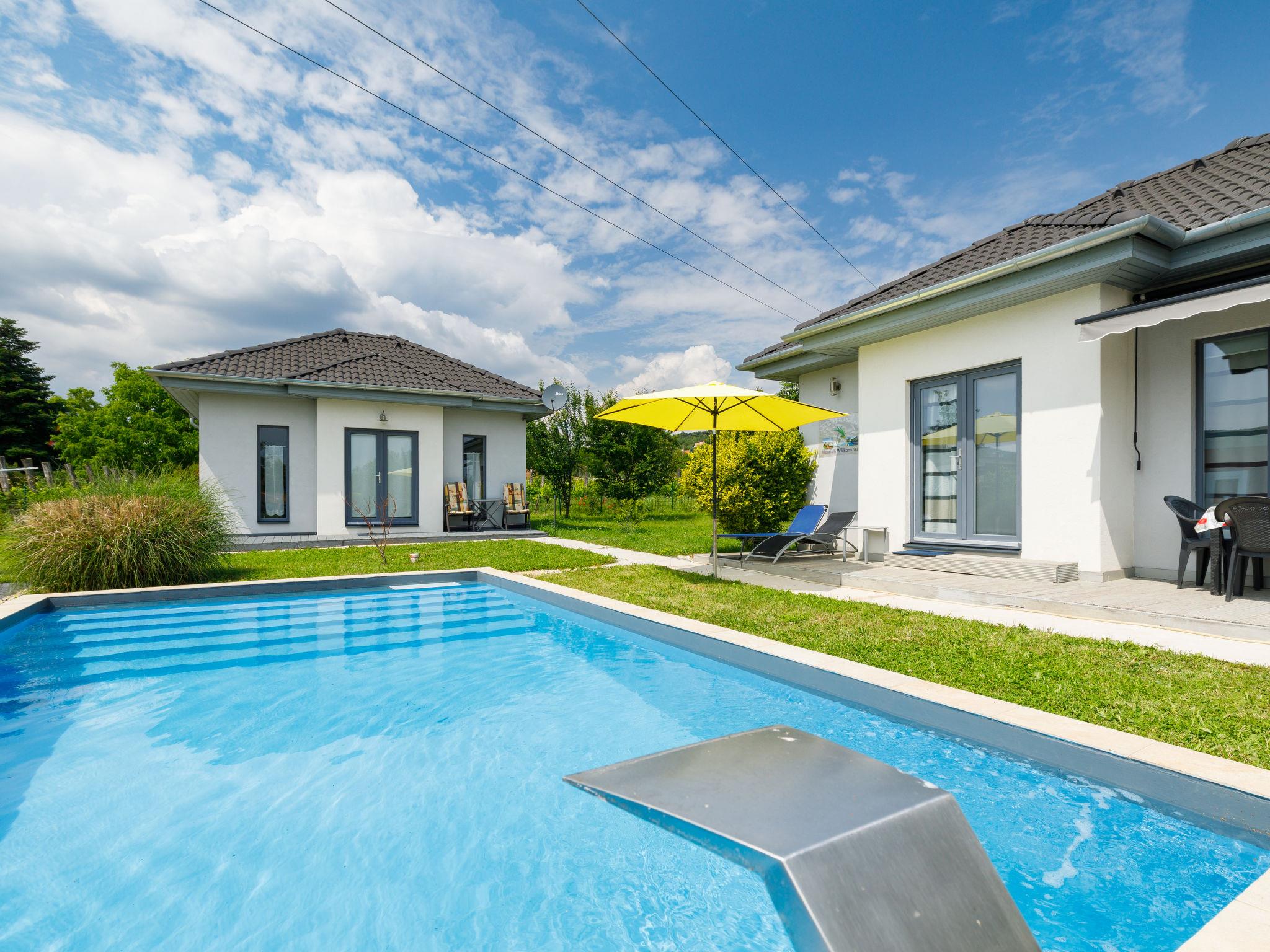Ábrahámhegy 33 km from Keszthely: The property consists of the two separate buildings shown in the pictures. Beautiful, comfortable 2-family house "Geminis", built in 2021. In the resort, in a quiet position, 800 m from the lake, 1 km from the beach. Private: property 800 m2 (fenced), garden, lawn for sunbathing, swimming pool angular (4 x 7 m, depth 130 - 140 cm, seasonal availability: 20.May. - 03.Oct.). In the house: washing machine. Available: bicycles (2). Grocery 500 m, restaurant 600 m, grass beach 800 m.