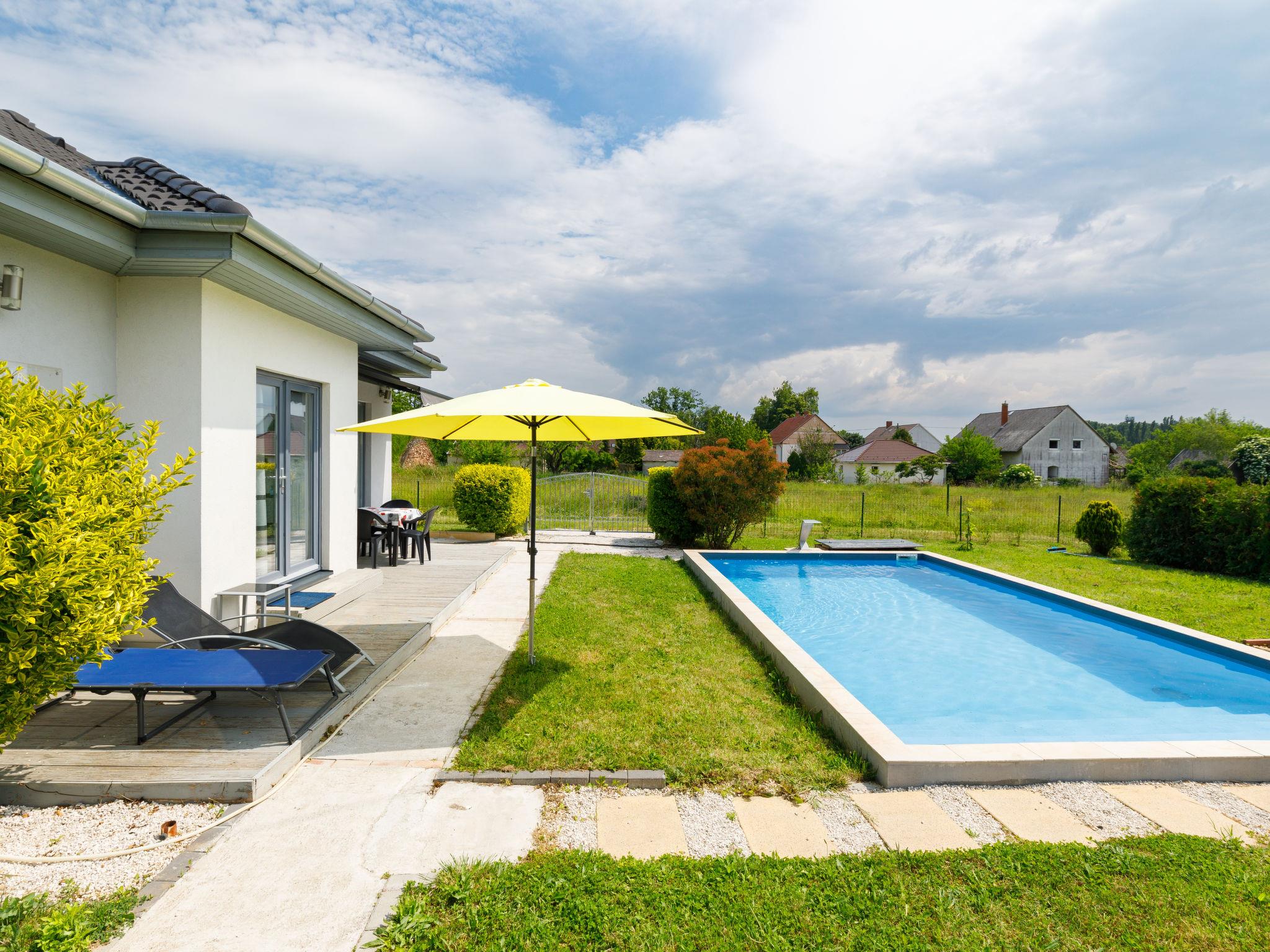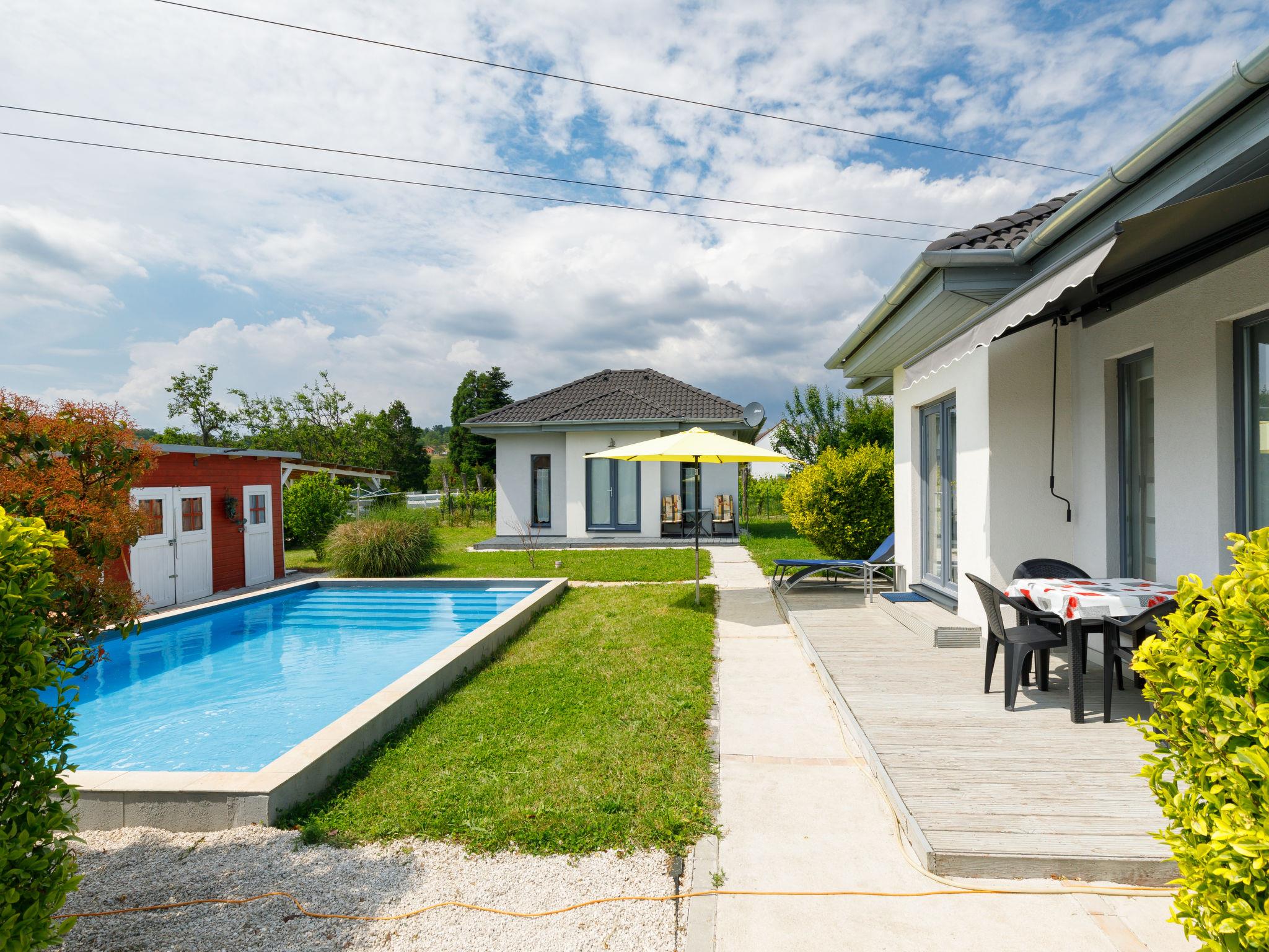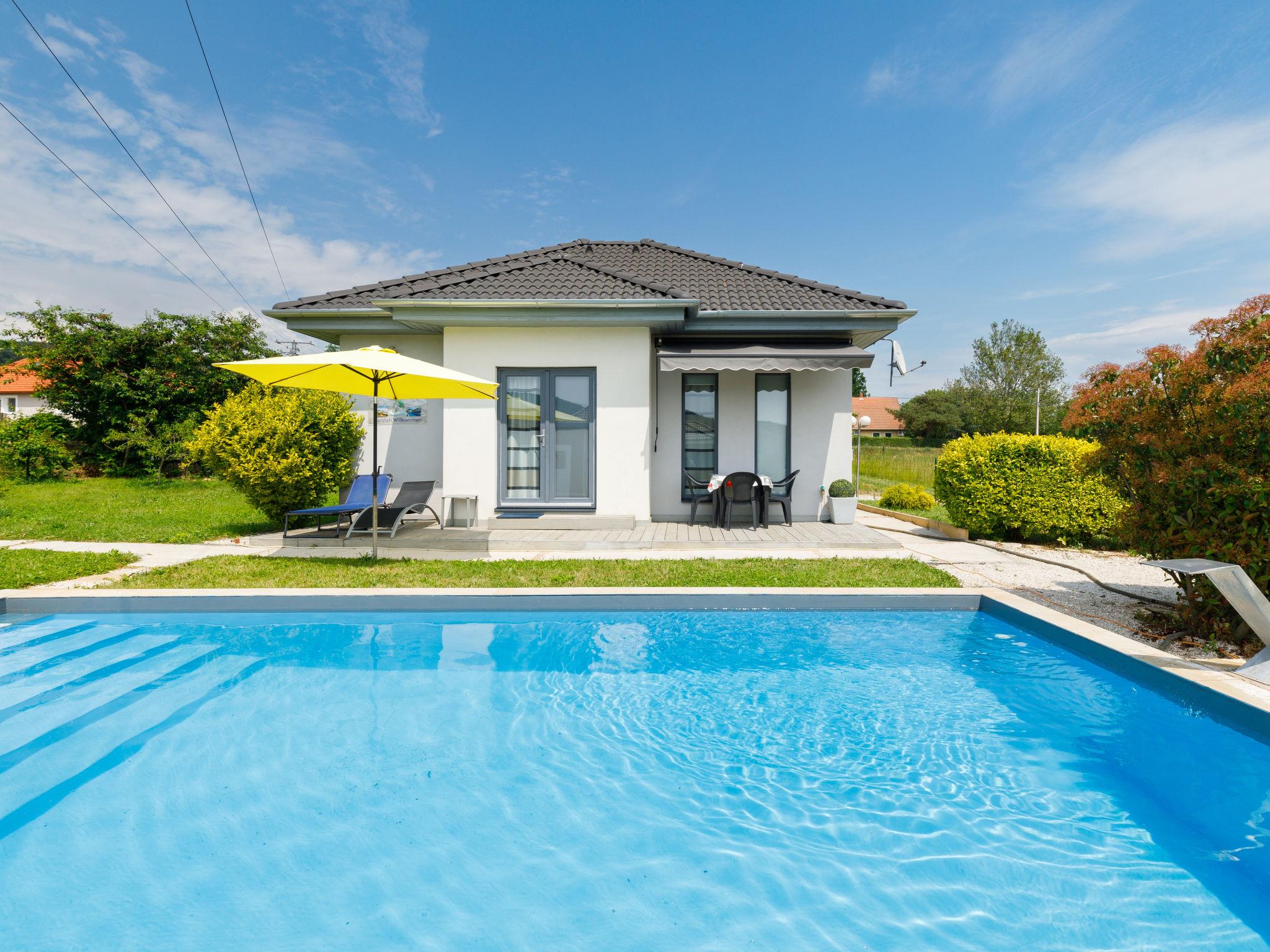 Ábrahámhegy 33 km from Keszthely: The property consists of the two separate buildings shown in the pictures. Beautiful, comfortable 2-family house "Geminis", built in 2021. In the resort, in a quiet position, 800 m from the lake, 1 km from the beach. Private: property 800 m2 (fenced), garden, lawn for sunbathing, swimming pool angular (4 x 7 m, depth 130 - 140 cm, seasonal availability: 20.May. - 03.Oct.). In the house: washing machine. Available: bicycles (2). Grocery 500 m, restaurant 600 m, grass beach 800 m.