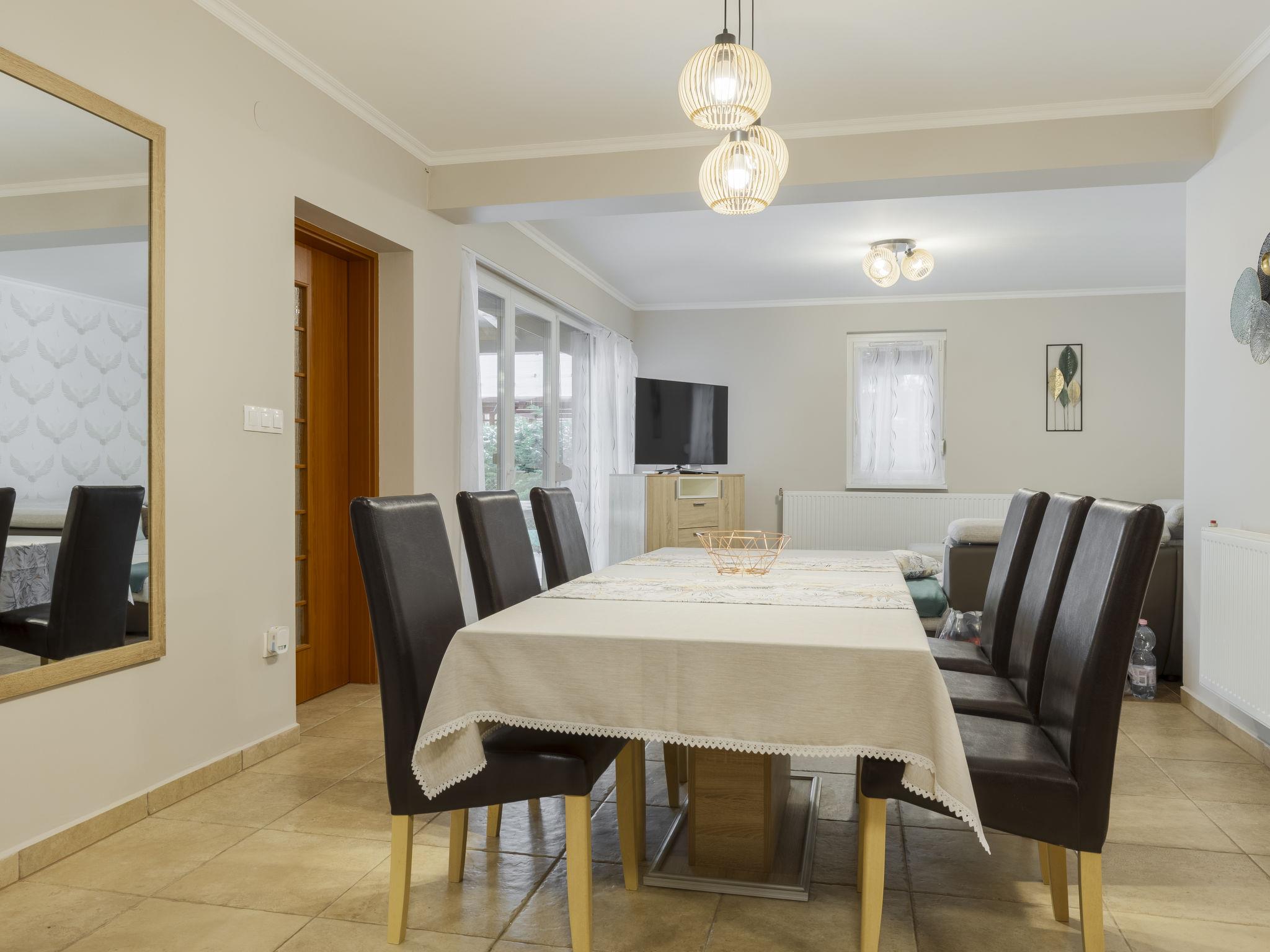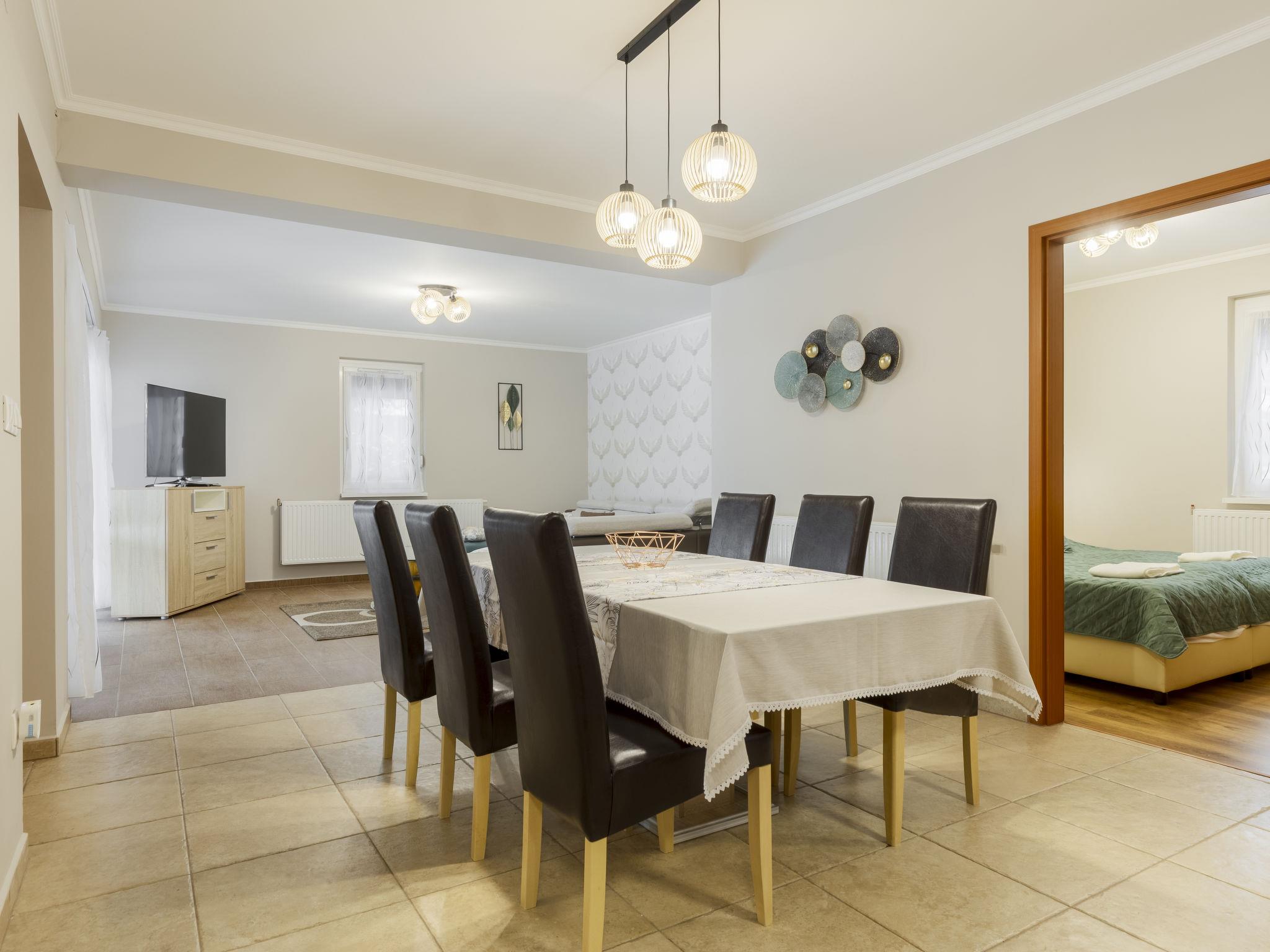 "Petka 1", 4-room apartment on the ground floor. Spacious and bright, comfortable and beautiful furnishings: entrance hall. Living/dining room with sliding door with dining table and TV (flat screen), air conditioning. Exit to the terrace. 2 double bedrooms, each room with 1 french bed (160 cm, length 200 cm). 1 room with 2 beds (90 cm, length 200 cm). Open kitchen (oven, 4 ceramic glass hob hotplates, toaster, kettle, microwave, freezer, electric coffee machine). Shower, sep. WC. Heating. Large terrace. Terrace furniture. Facilities: mosquito net, baby cot (extra). Internet (WiFi). Parking (fenced 2 cars). Please note: the entrance hall is shared, leading to the lower apartment and stairs to the upper apartment.