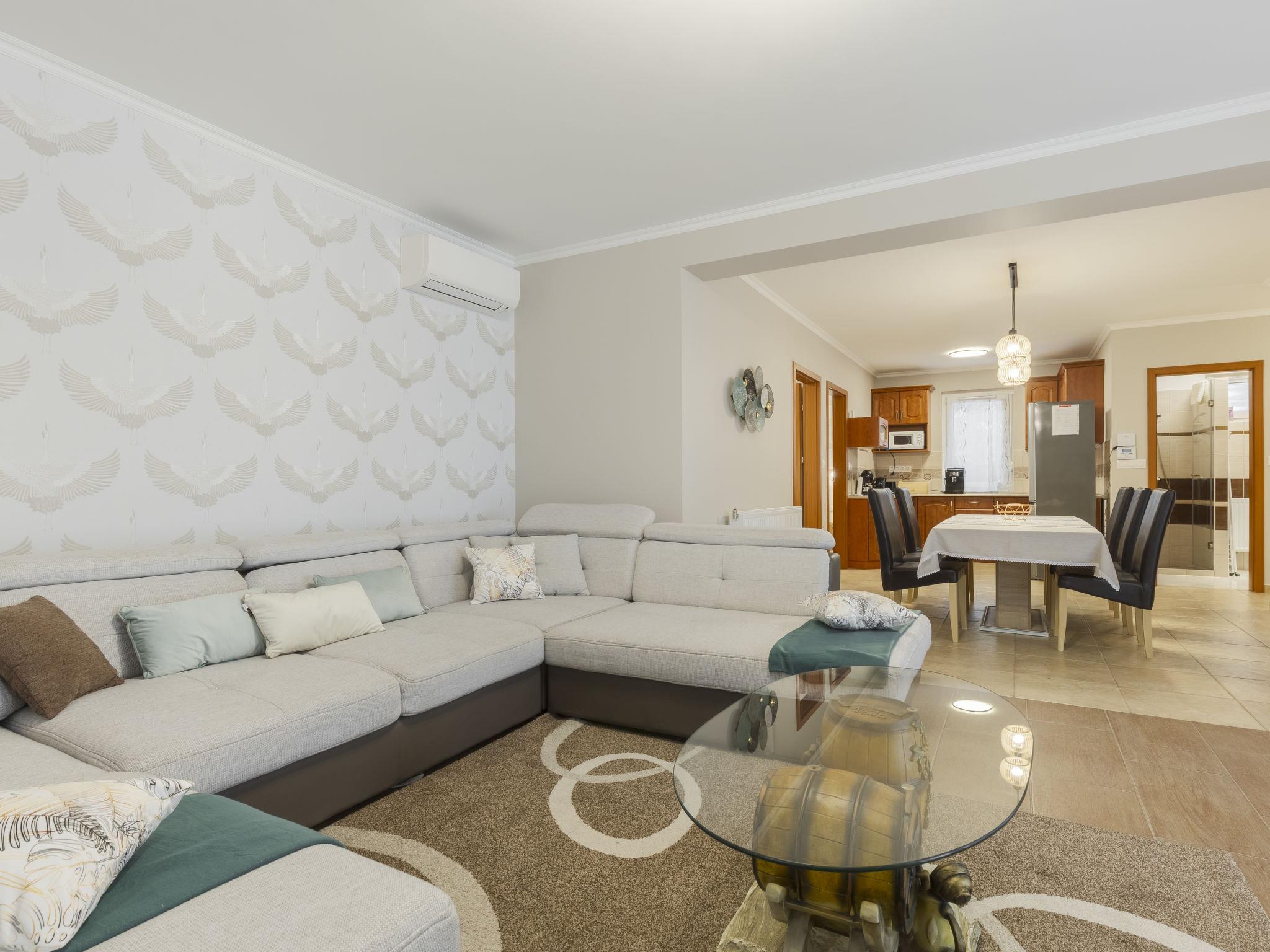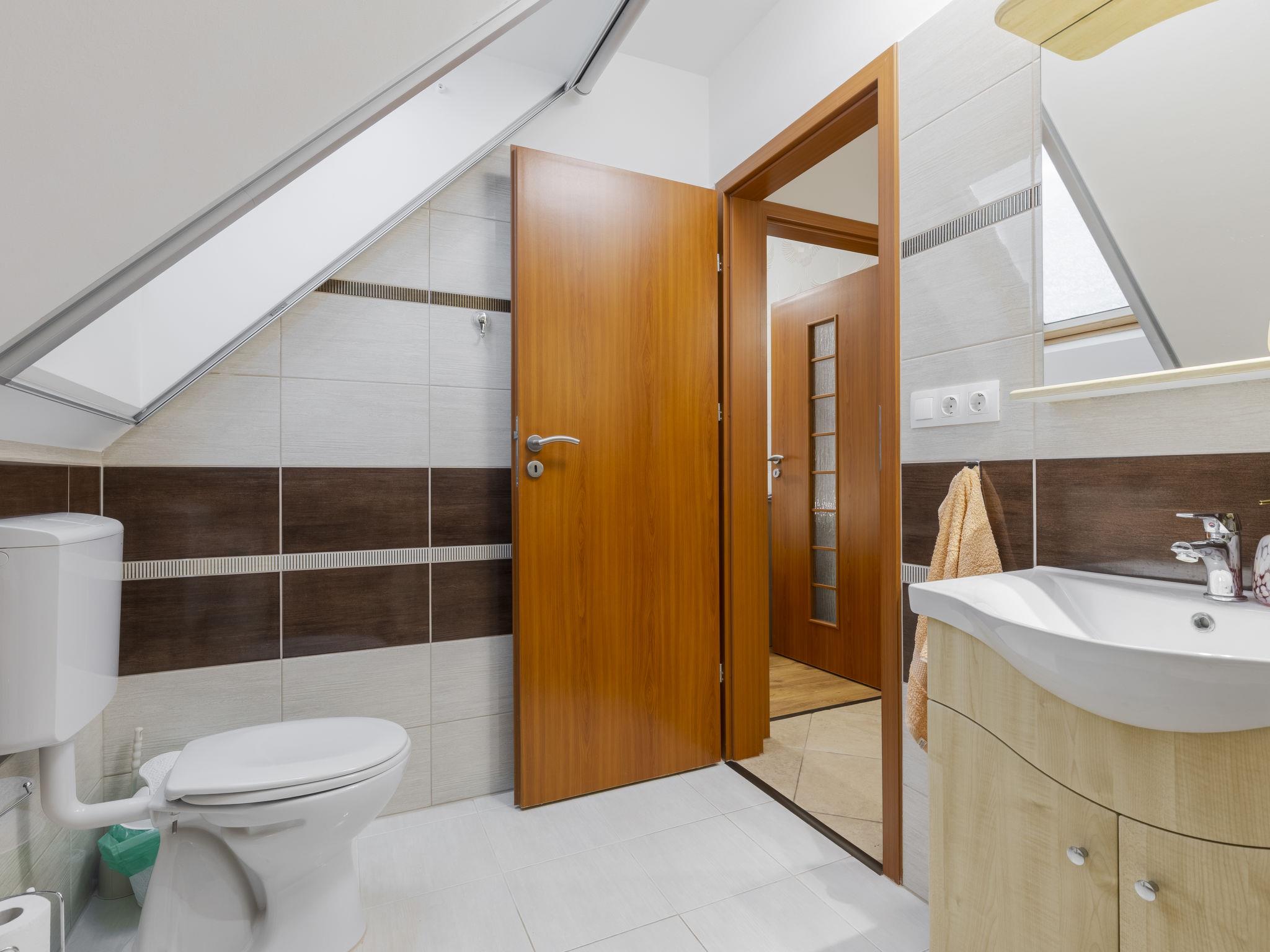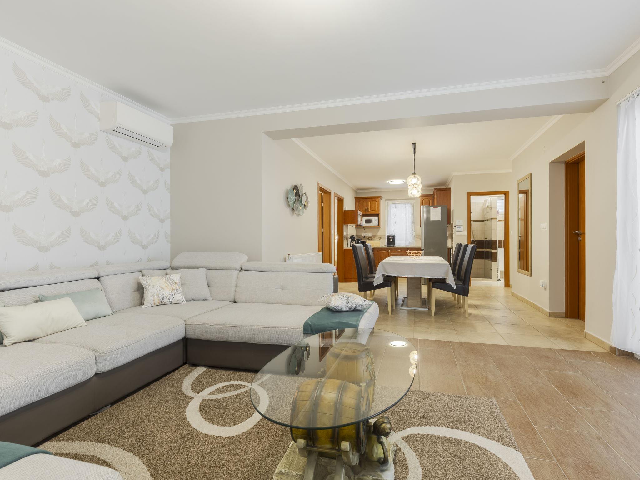 "Petka", 8-room house. Spacious and bright, comfortable and beautiful furnishings: entrance hall. 2 double bedrooms, each room with 2 french beds (160 cm, length 200 cm). 1 room with 2 beds (90 cm, length 200 cm). Open living/dining room with sliding door with TV (flat screen), air conditioning. Exit to the terrace. Open kitchen (oven, 4 ceramic glass hob hotplates, toaster, kettle, microwave, freezer, electric coffee machine). Shower, sep. WC. Heating. Upper floor: open living/dining room with TV (flat screen), air conditioning. 2 double bedrooms, each room with 1 french bed (160 cm, length 200 cm). 1 room with 2 beds (90 cm, length 200 cm). Open kitchen (4 ceramic glass hob hotplates, toaster, kettle, microwave, freezer, electric coffee machine). Shower, sep. WC. Heating. Large terrace. Terrace furniture. Facilities: mosquito net. Internet (WiFi).