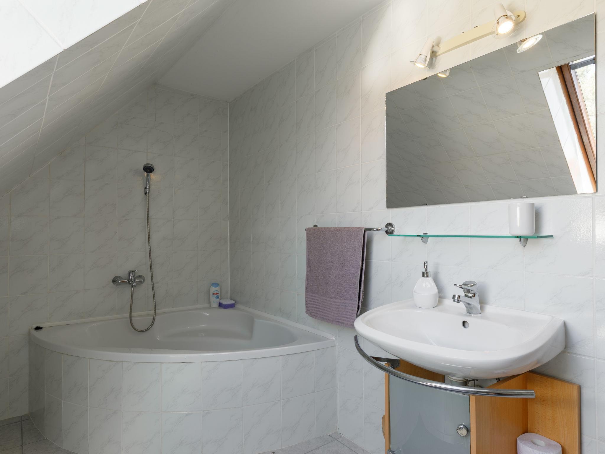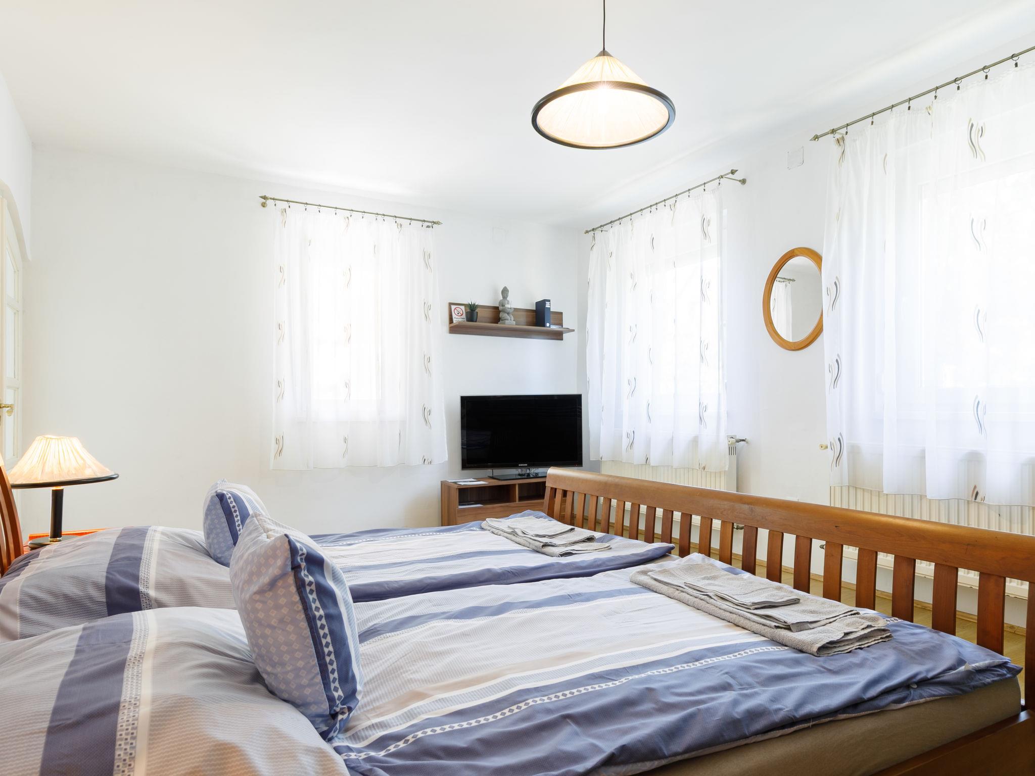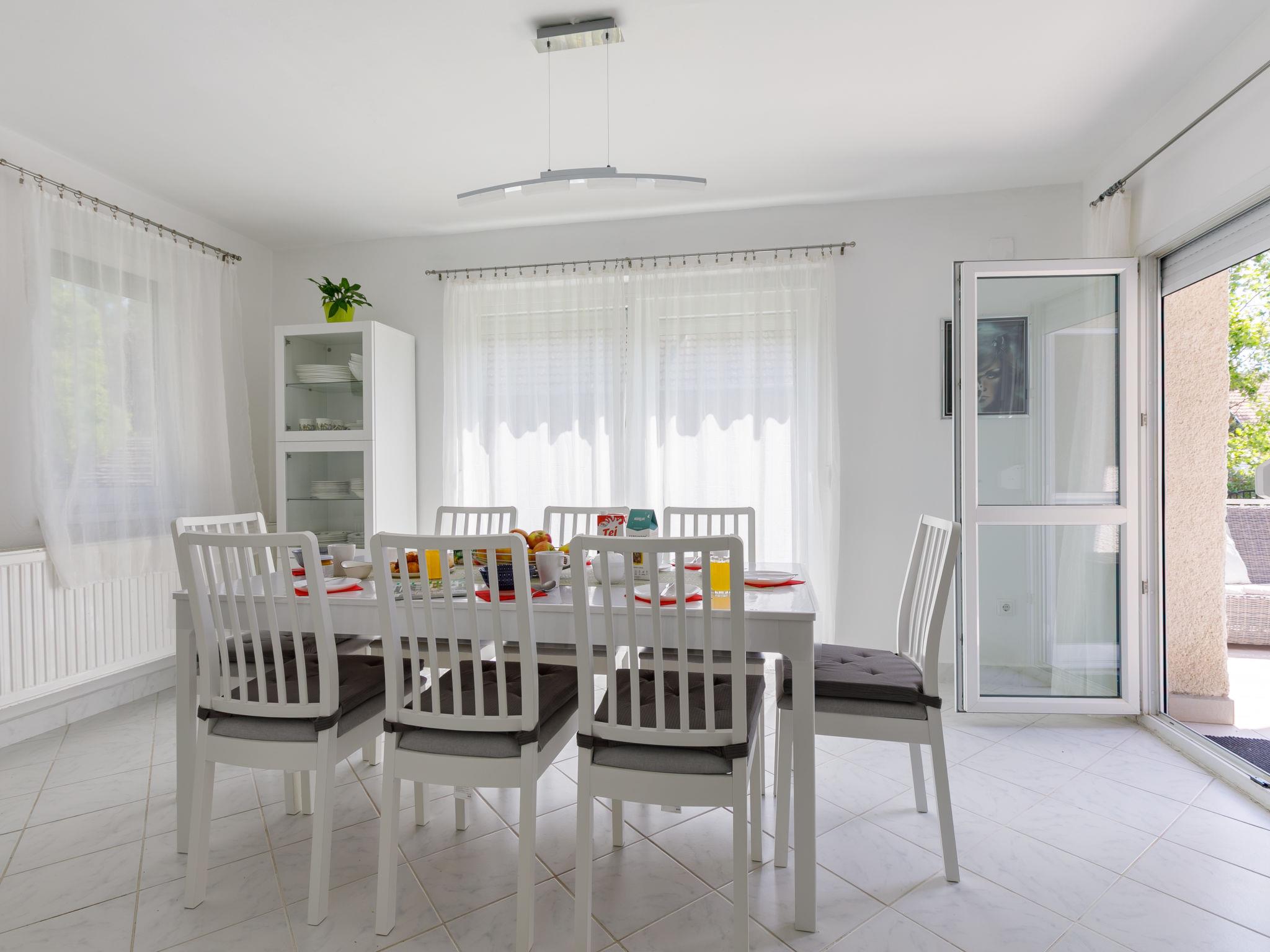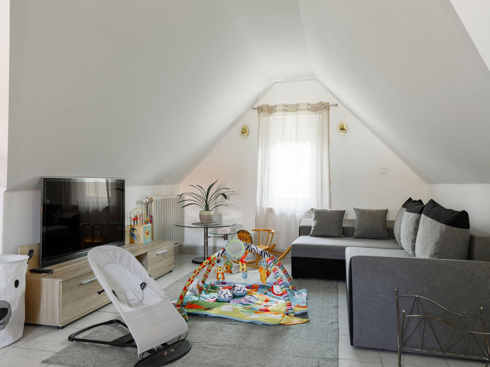 "Racz", 6-room house 150 m2 on 2 levels, on the upper ground floor. Bright, modern furnishings: living/dining room with electric heater. Exit to the terrace. 1 room with 2 beds (90 cm, length 200 cm), cable TV. 1 room with 1 double bed (2 x 90 cm, length 200 cm), cable TV. Open kitchen (oven, dishwasher, 4 ceramic glass hob hotplates, toaster, kettle, microwave, freezer, electric coffee machine). Bathroom, sep. WC. No heating option. Upper floor: living room with sloping ceilings with cable TV. 2 rooms with sloping ceilings, each room with (2 x 90 cm, length 200 cm), bath/WC and cable TV. Parquet floors. Terrace, patio roofed. Terrace furniture, barbecue, deck chairs (6). Facilities: washing machine, mosquito net, children's high chair, baby cot, baby changing unit. Internet (WiFi, free). Please note: suitable for families. Non-smoking house. Baby bath, diaper container, stroller, play corner, baby swing, toys and, near the stairs, safety gates. MA19018181