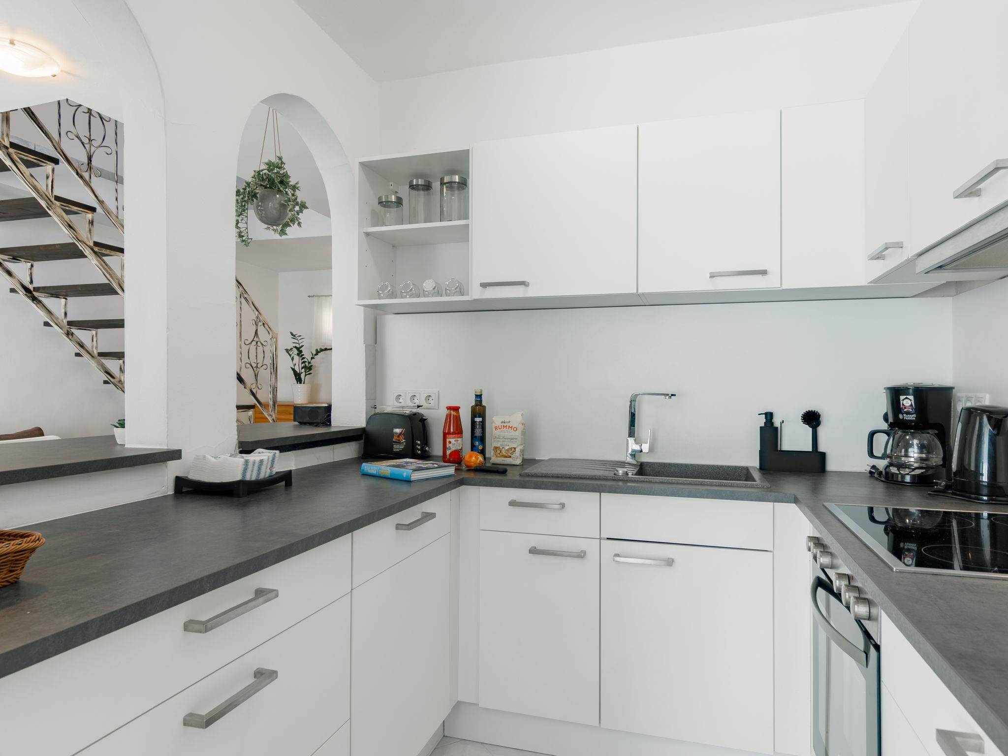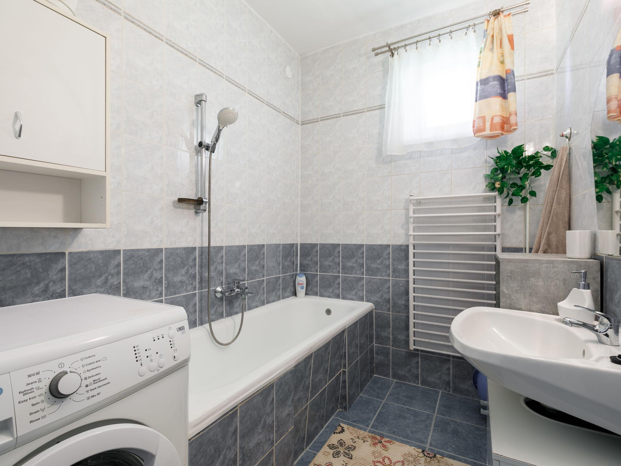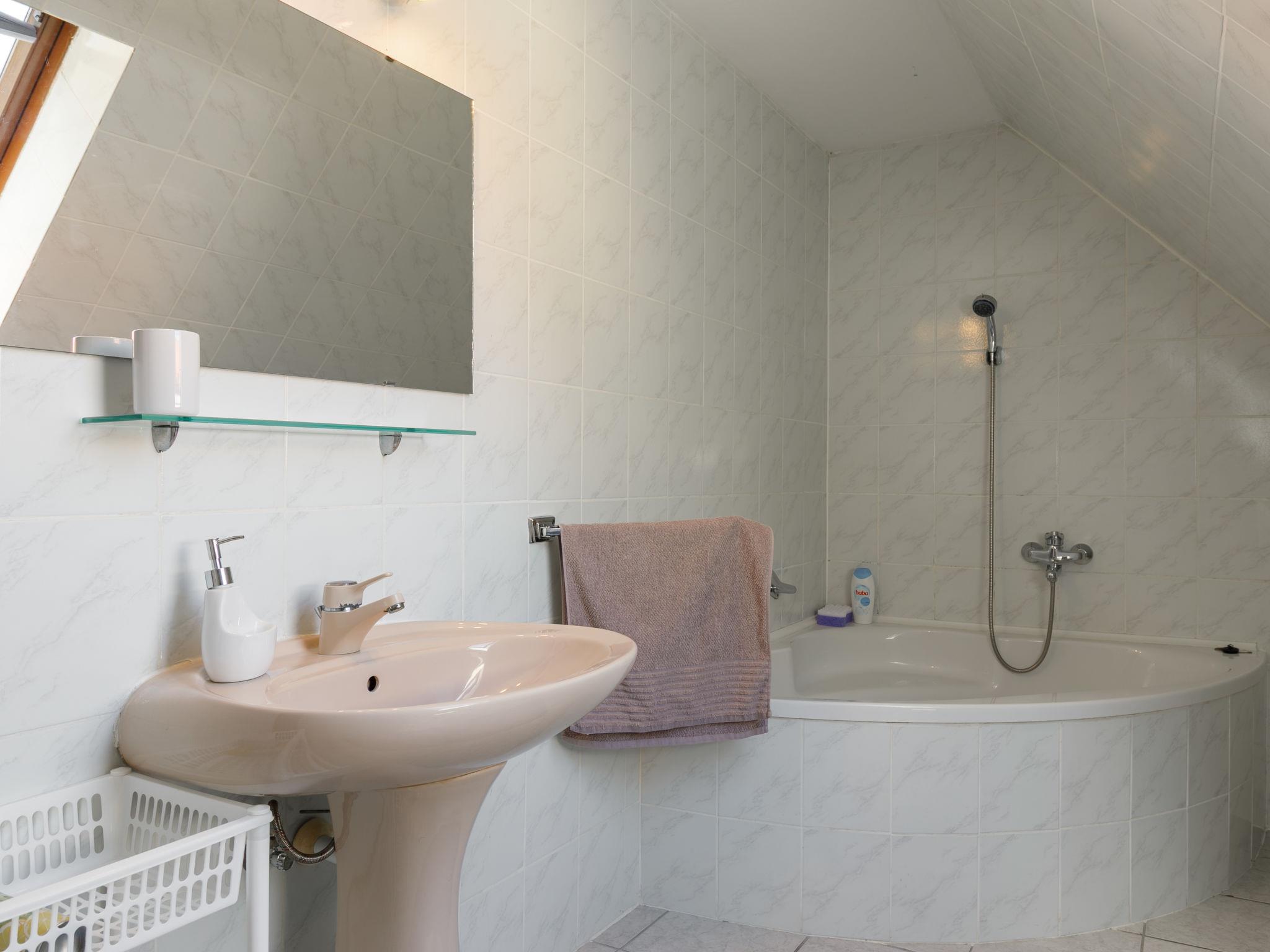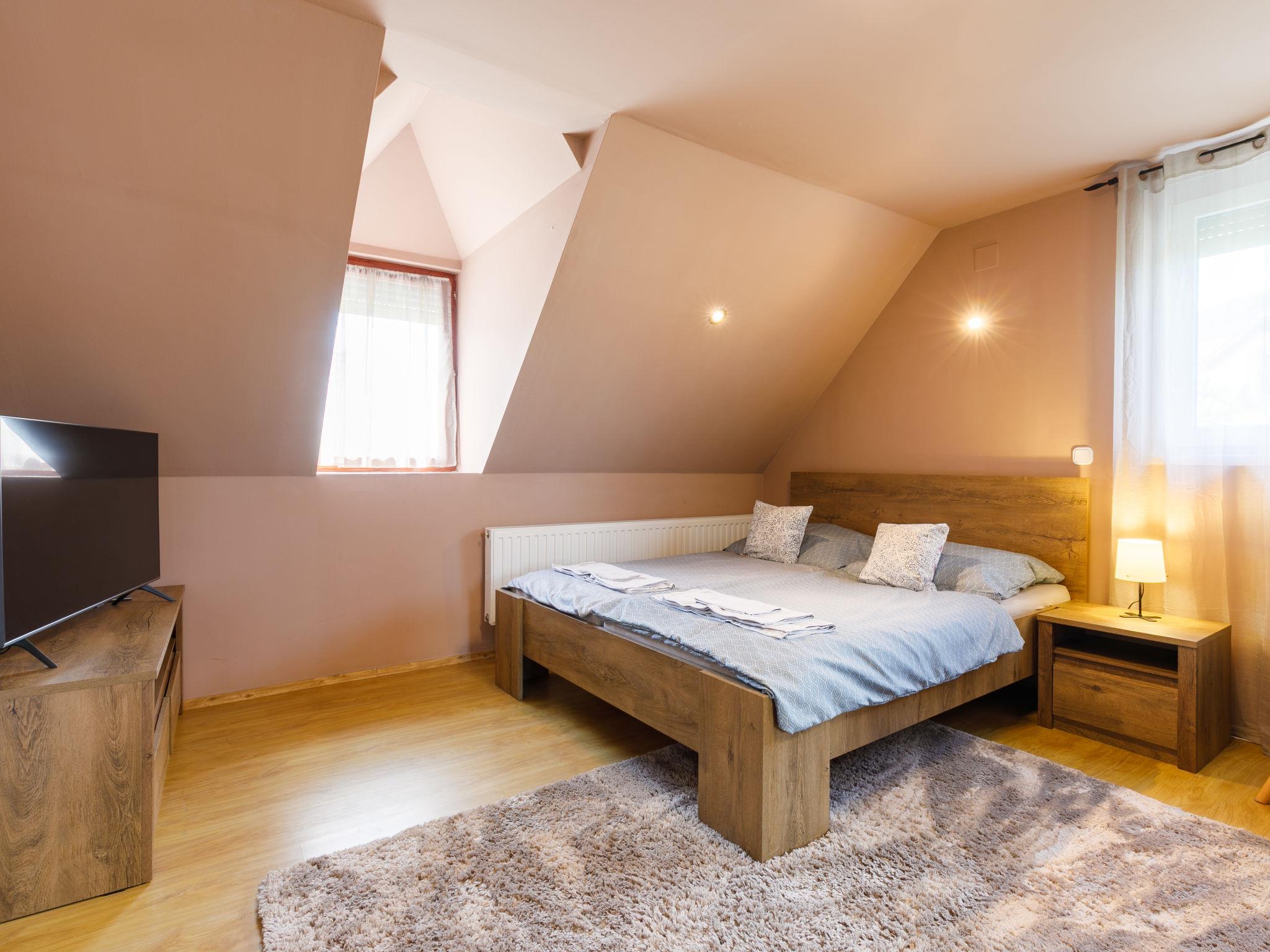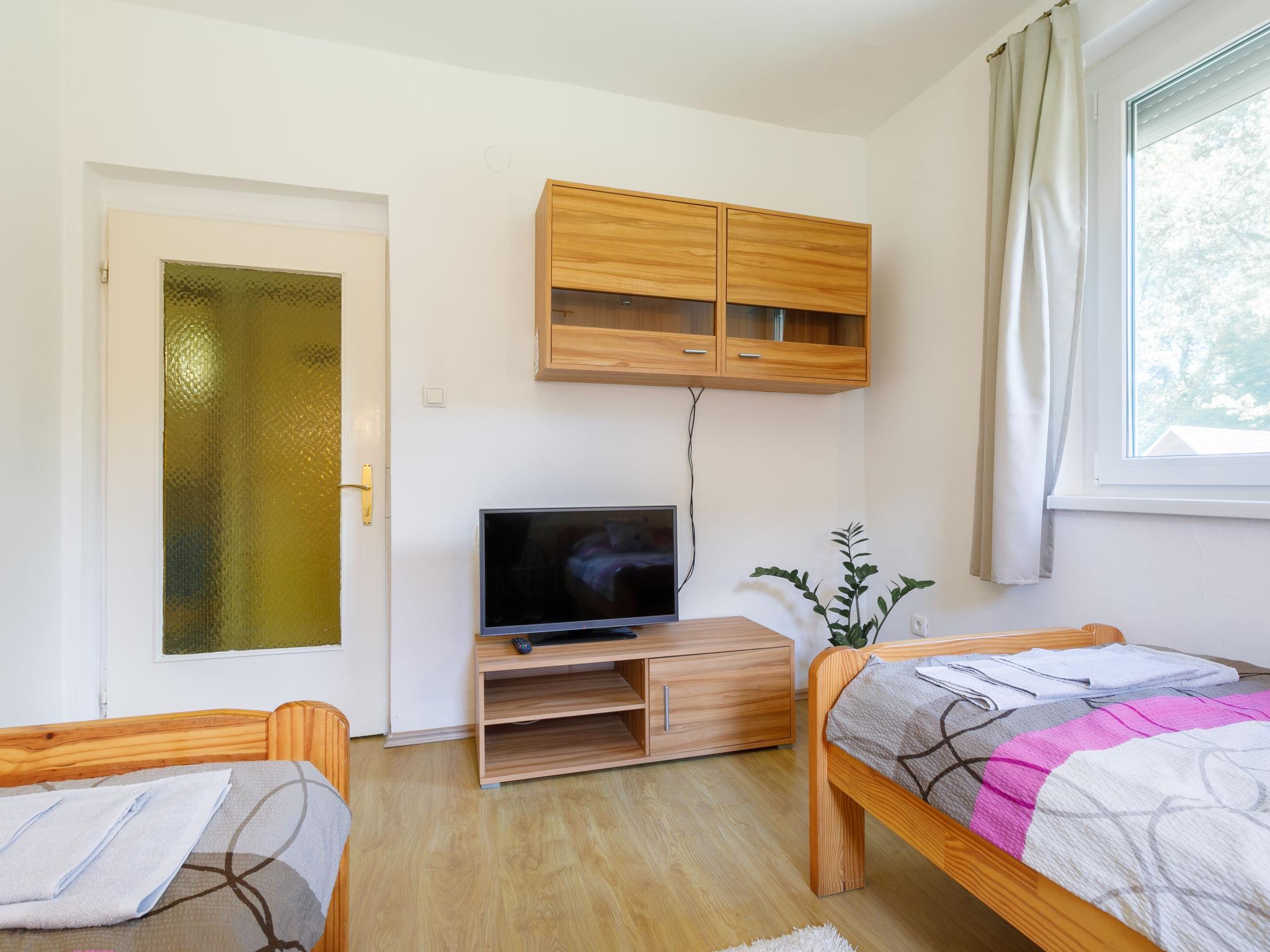 "Racz", 6-room house 150 m2 on 2 levels, on the upper ground floor. Bright, modern furnishings: living/dining room with electric heater. Exit to the terrace. 1 room with 2 beds (90 cm, length 200 cm), cable TV. 1 room with 1 double bed (2 x 90 cm, length 200 cm), cable TV. Open kitchen (oven, dishwasher, 4 ceramic glass hob hotplates, toaster, kettle, microwave, freezer, electric coffee machine). Bathroom, sep. WC. No heating option. Upper floor: living room with sloping ceilings with cable TV. 2 rooms with sloping ceilings, each room with (2 x 90 cm, length 200 cm), bath/WC and cable TV. Parquet floors. Terrace, patio roofed. Terrace furniture, barbecue, deck chairs (6). Facilities: washing machine, mosquito net, children's high chair, baby cot, baby changing unit. Internet (WiFi, free). Please note: suitable for families. Non-smoking house. Baby bath, diaper container, stroller, play corner, baby swing, toys and, near the stairs, safety gates. MA19018181