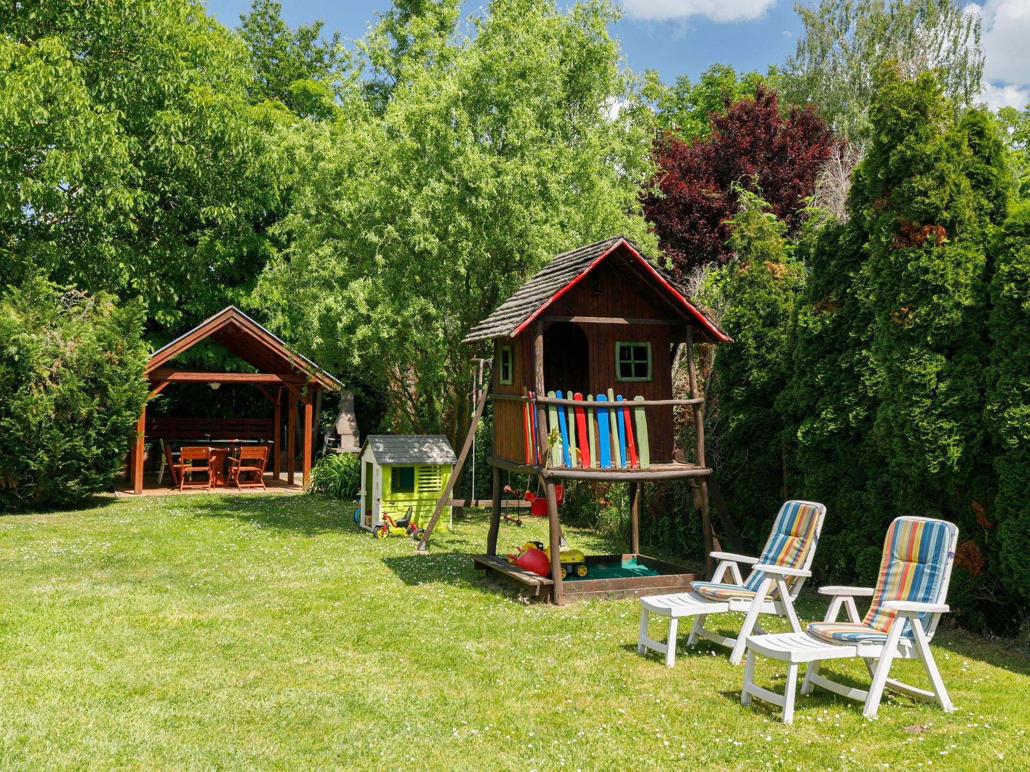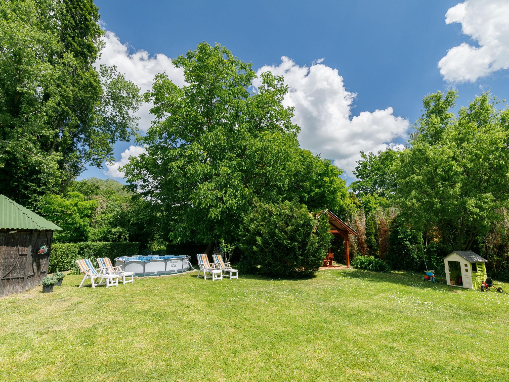 Badacsonytomaj 25 km from Keszthely: House "Racz", detached. In the district of Tomaj 900 m from the centre of Badacsonytomaj, 4 km from the centre of Badacsony, in the residential district, 1.6 km from the lake, 1.8 km from the beach, in a cul-de-sac. Private: property 700 m2 (fenced), well-kept garden with lawn and trees, swimming pool (above ground) round (3,05 m diameter, depth 80 cm, seasonal availability: 15.May. - 15.Sep.). Outdoor shower, table tennis, children's playground (slide, swing), parking on the premises. Grocery 300 m, supermarket 11 km, restaurant 300 m, bakery 1 km, bicycle rental 1 km, grass beach 1.6 km, thermal baths "Hévíz" 30 km. Tennis 2 km, riding stable 4 km, cycle lane 1.5 km, children's playground 500 m. Nearby attractions: Festetics Castle 26 km, Tihany 37 km, Balatonfüred Annagora Aquapark 38 km, Tapolca Lake Cave Visitor Centre 10 km, Szigliget Castle 88 km, Folly Arboretum 3 km. Please note: baby equipment.