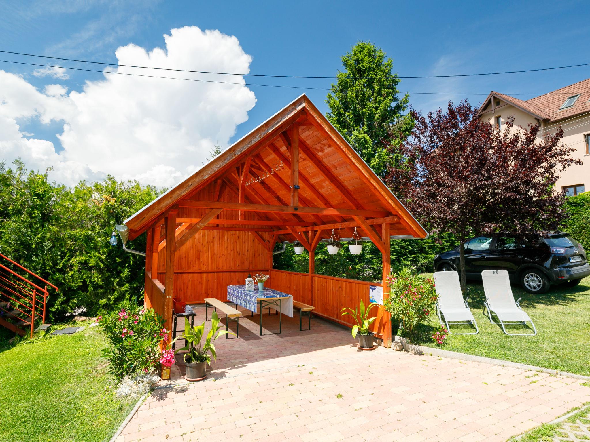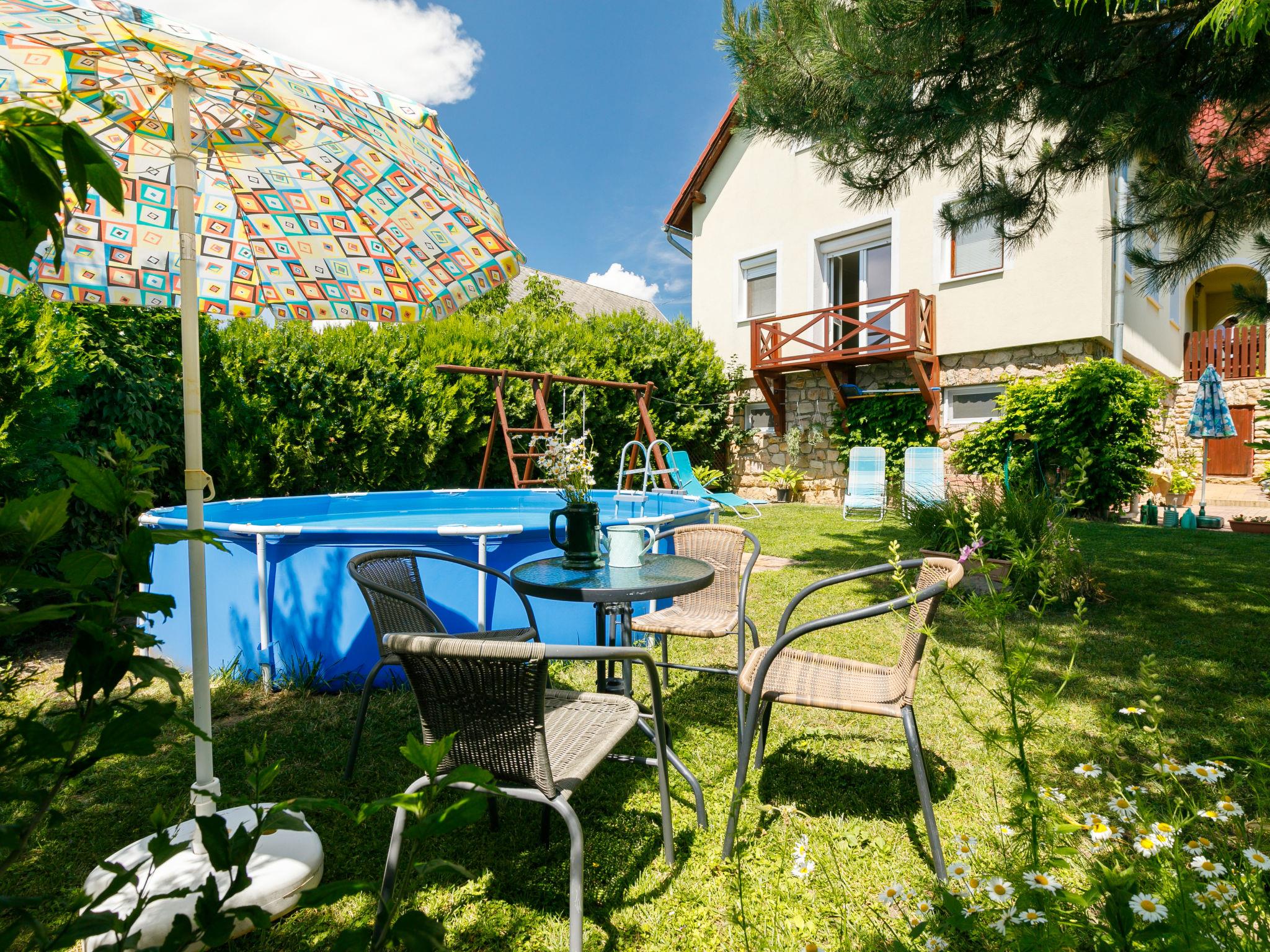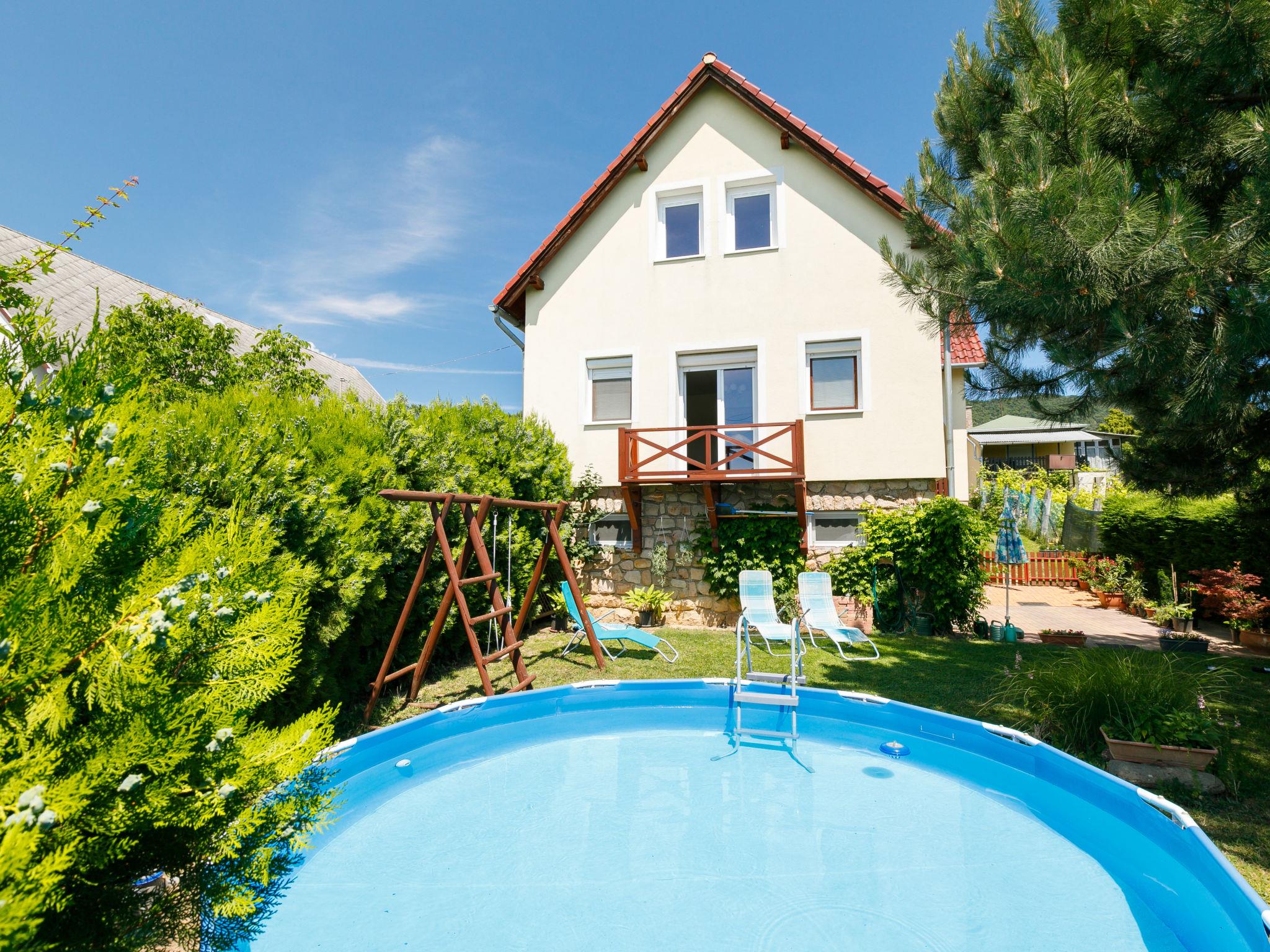 Badacsonytomaj 29 km from Keszthely: House "Toth", surrounded by vineyards. Above Badacsony, in the district of Badacsonyörs 2 km from the centre of Badacsonytomaj, 3 km from the centre of Badacsony, on a slope, in the residential district, 1 km from the lake, 2 km from the beach. For shared use: property (fenced) with trees, meadow. Private: garden with lawn, swimming pool (above ground) round (3,60 m diameter, depth 80 cm, seasonal availability: 16.May. - 12.Sep.). Children's playground (swing, sandbox). In the house: air conditioning. 500 m long narrow motor access. Parking (for 2 cars) on the premises. Grocery 2 km, supermarket 13 km, restaurant 500 m, bicycle rental 2 km, thermal baths "Hévíz" 35 km. Golf course (18 hole) 28 km, tennis 3 km, cycle lane 500 m, children's playground 1 km. Nearby attractions: Festetics Castle 29 km, Tihany 36 km, Balatonfüred Annagora Aquapark 36 km, Tapolca Lake Cave Visitor Centre 12 km, Szigliget Castle 12 km, Folly Arboretum 2 km. Please note: 1st floor is closed and not occupied. Owner lives in separate semi-detached house. The owner has a dog.
