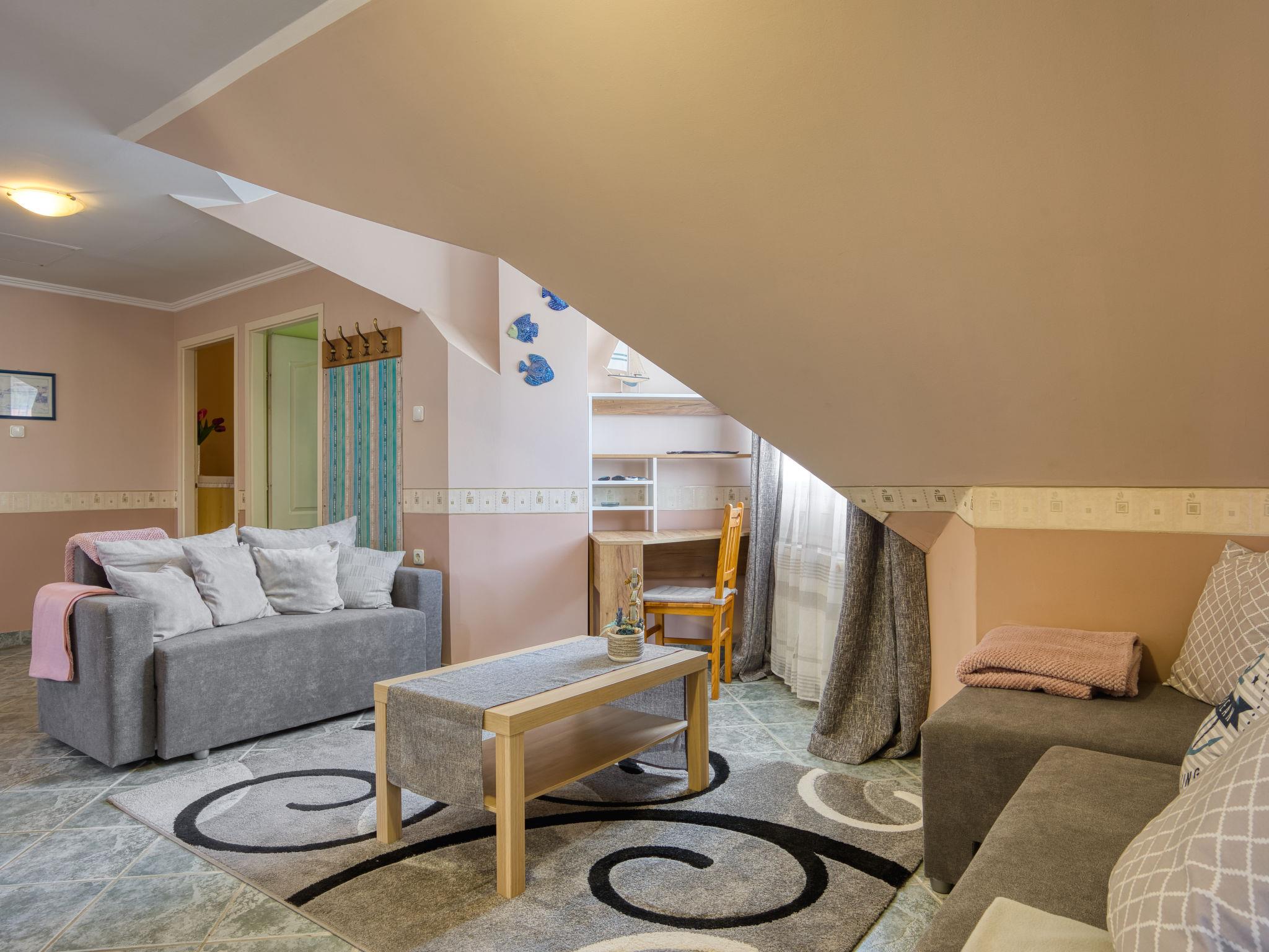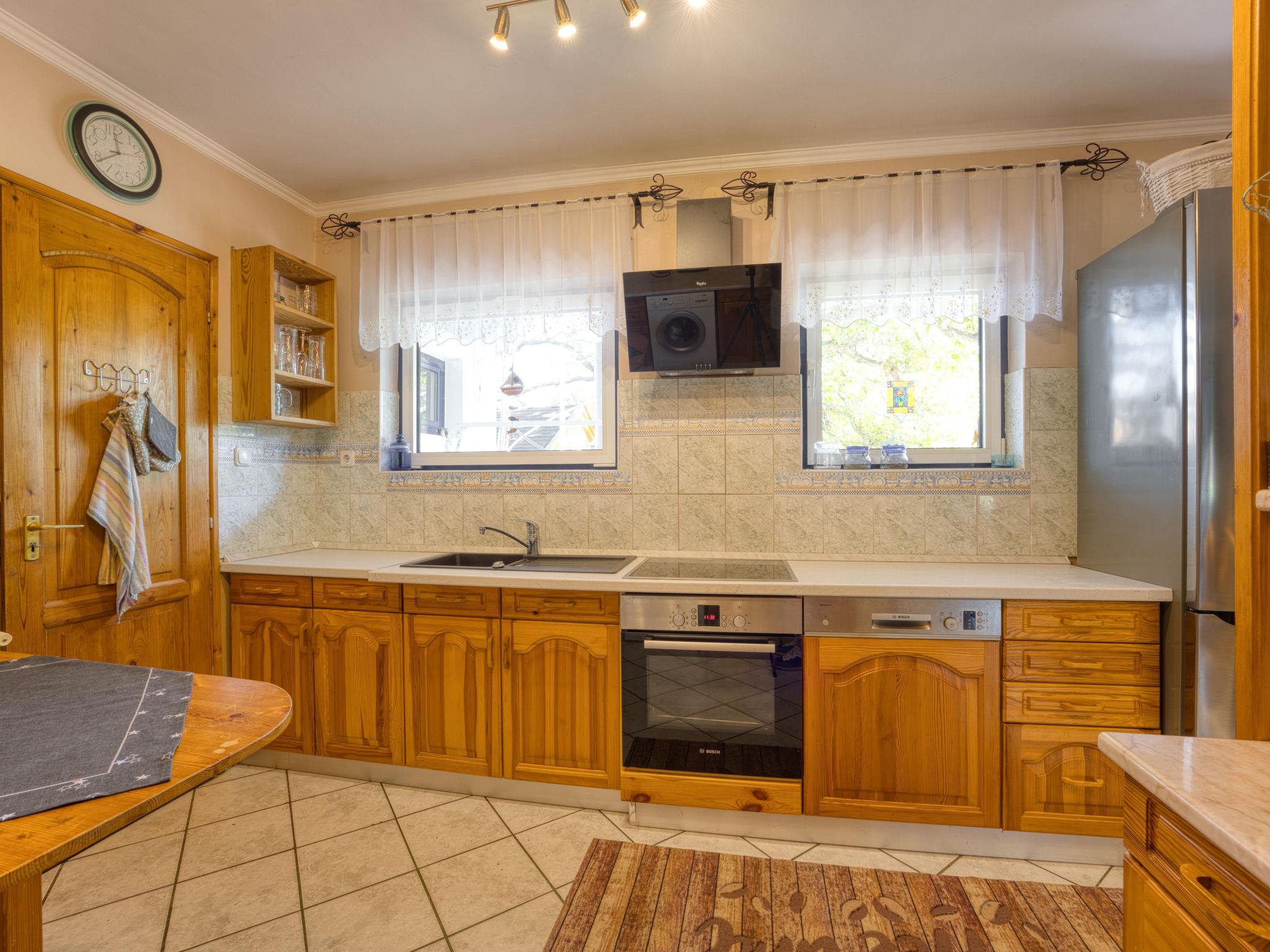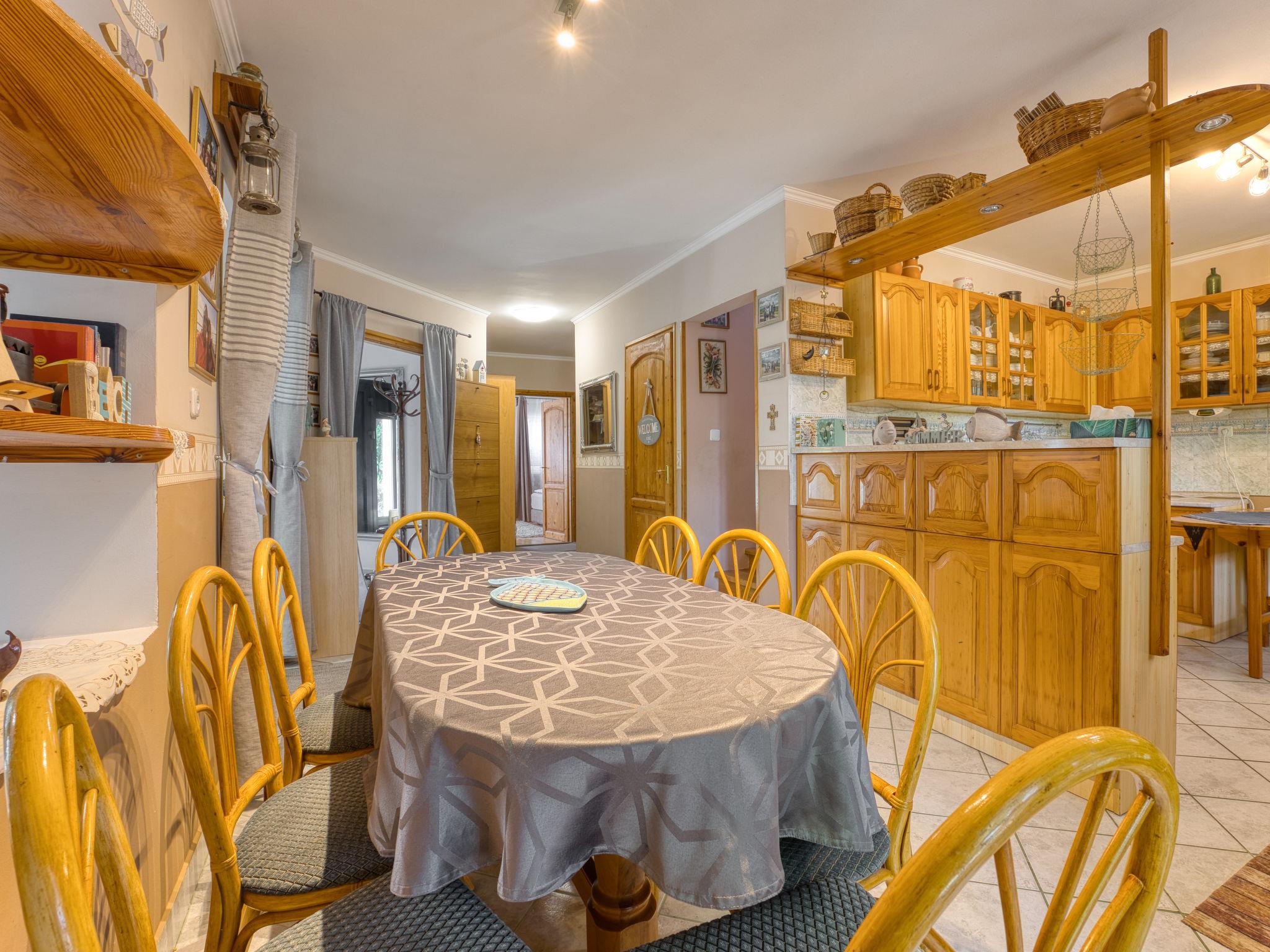"Emöke", 7-room house 130 m2 on 2 levels. Cosy furnishings: living room with satellite TV (flat screen). Exit to the terrace. 1 room with 1 french bed. Open kitchen (oven, dishwasher, 4 ceramic glass hob hotplates, toaster, kettle, microwave, freezer, electric coffee machine) with dining table. Exit to the terrace. Shower/WC, sep. WC. No heating option. Upper floor: living room. 2 rooms, each room with 1 french bed (180 cm, length 200 cm). 1 room with 1 french bed (180 cm, length 200 cm). Exit to the balcony. 1 room with 1 sofabed. Exit to the balcony. Small kitchen (3 gas rings). Shower/WC. No heating option. Carpet. Balcony, terrace roofed, patio. Terrace furniture, barbecue, deck chairs (6). Facilities: washing machine, mosquito net, children's high chair, baby cot. Internet (WiFi, free). Please note: non-smoking house. MA19016218