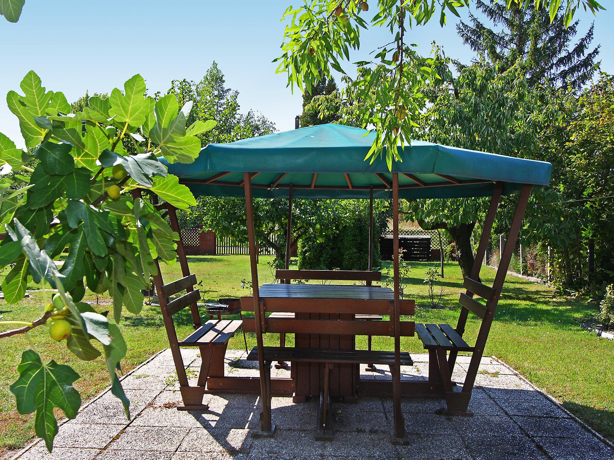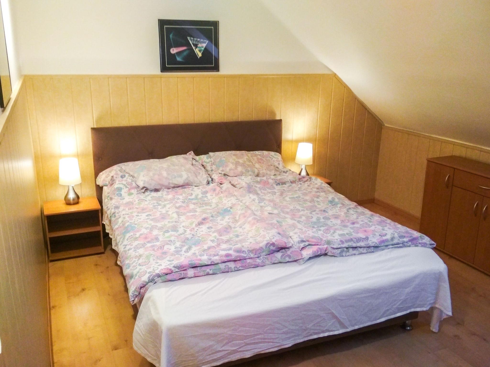 Balatonkeresztúr: Large house "Grand Jardin", 2 storeys. In a sunny position, 500 m from the lake. Private: large, beautiful garden 700 m2 (fenced) with lawn and trees, swimming pool (above ground) round (3,5 m diameter, depth 90 cm, seasonal availability: 15.May. - 15.Sep.). (swing). In the house: air conditioning. Grocery, restaurant 300 m, outdoor swimming pool 500 m.