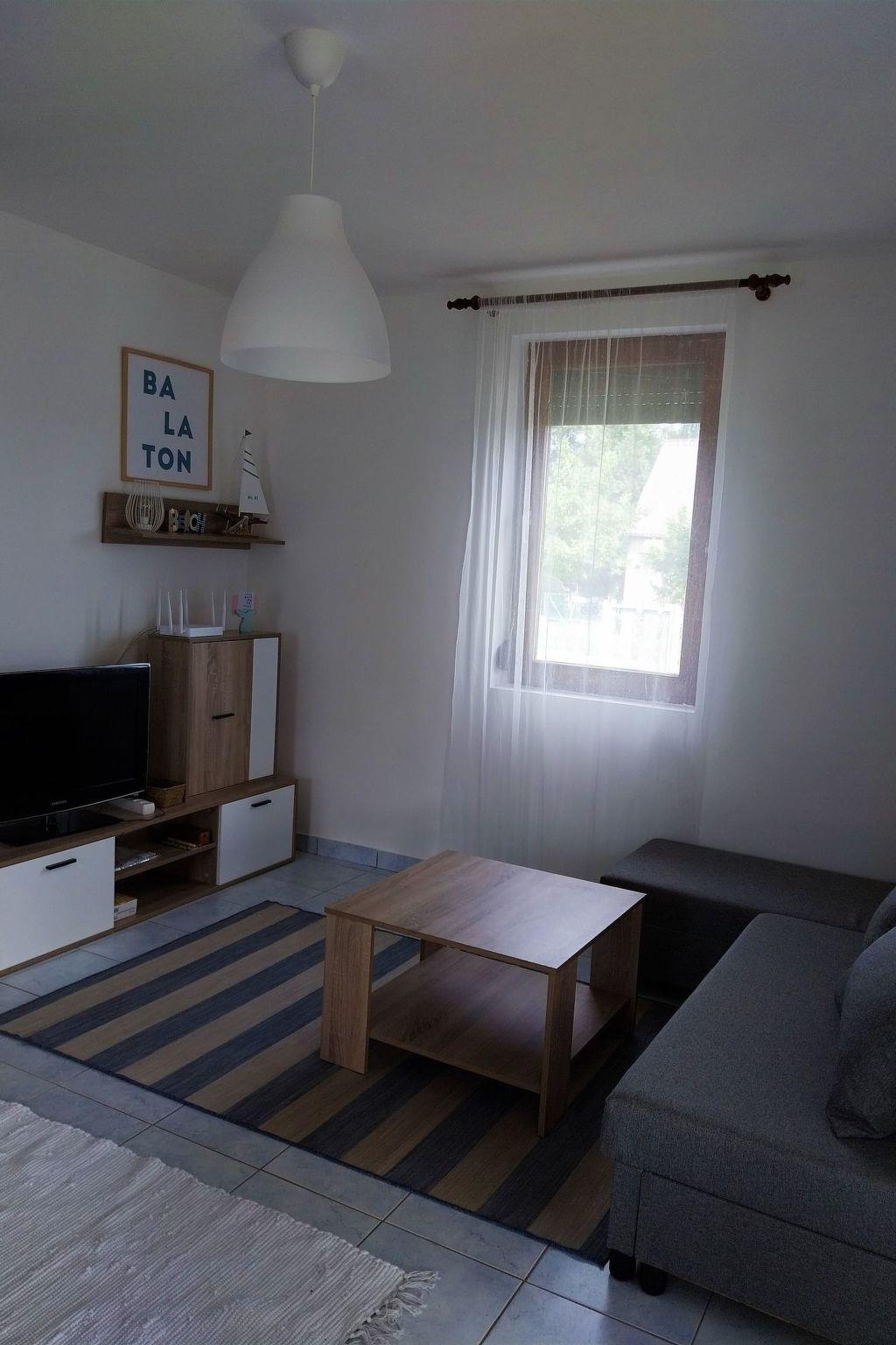 Ground floor: American style living room with kitchenette, with dining nook and with colour TV (only with Hungarian channels). 2 double bedrooms. Well equipped kitchen. Bathroom with corner bath and WC. Washing machine. Terrace with garden furniture.