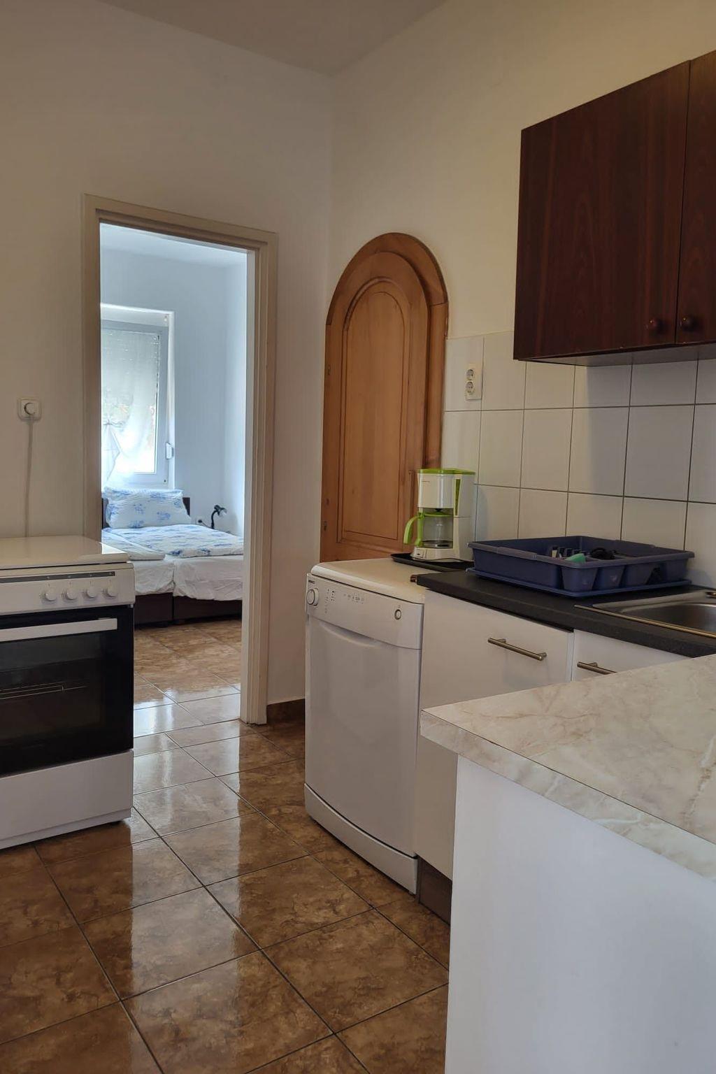 The part of the flat on the ground floor has an area of approx. 20 square metres and has a kitchen with a 2-burner gas hob, fridge, dishwasher, microwave, coffee machine and kettle. There is also a dining area and a bathroom with shower and WC.