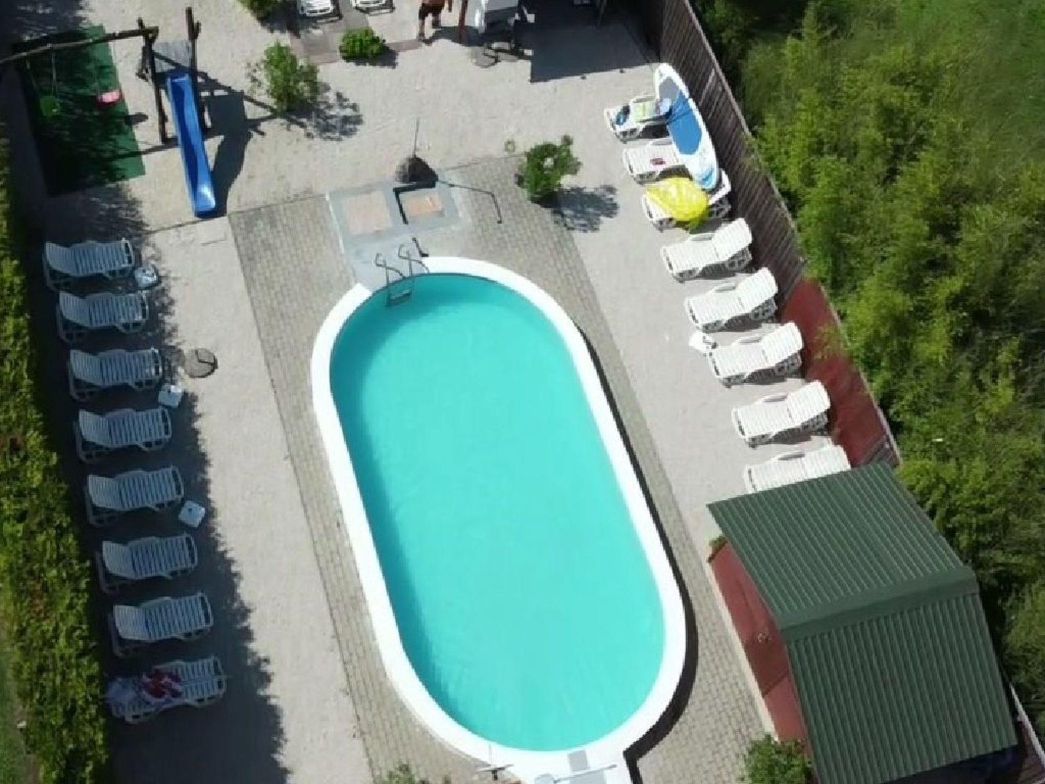 Leisure facilities at the property: outdoor pool for communal use, sun loungers, parasols, playground, trampoline.