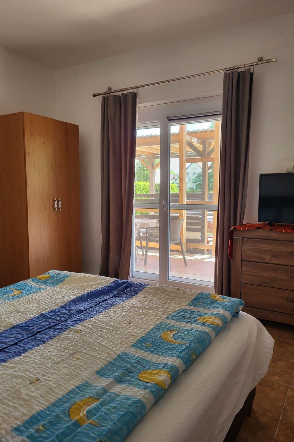 The upper floor has an area of approx. 50 square metres and consists of two double bedrooms, a large covered balcony, a bedroom and living room with air conditioning, pull-out couch 160 x 200 cm in comfort height approx. 45 cm recommended for 2 children or 2 teenagers, LED TV.