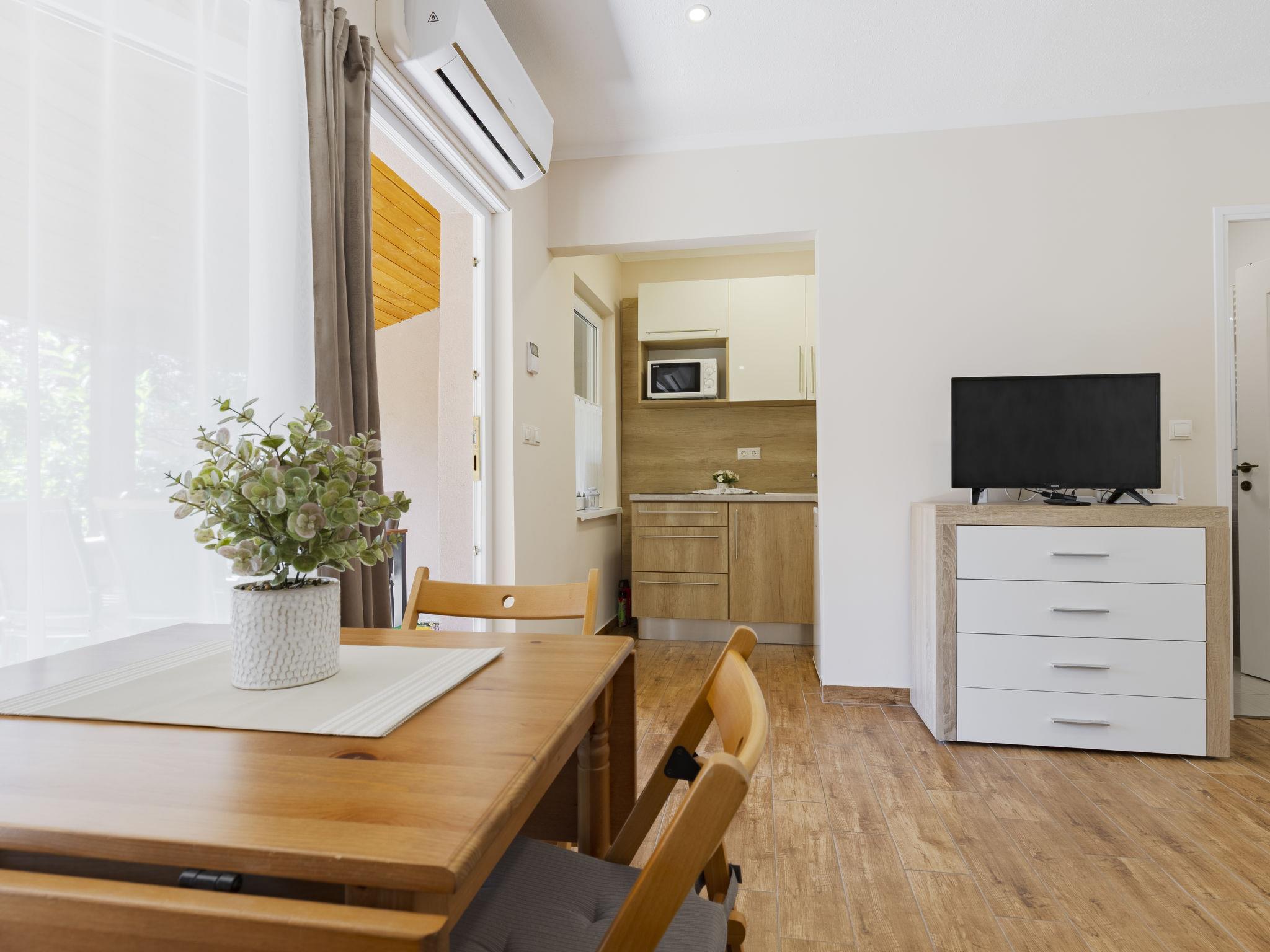 3-room semi-detached house. Comfortable and cosy furnishings: open living/dining room with dining table, kitchen corner, digital TV and air conditioning. Exit to the terrace. 1 double bedroom with 1 french bed (140 cm, length 200 cm). 1 room with 2 beds (90 cm, length 200 cm). Open kitchen (2 induction hot plates, toaster, kettle, microwave, electric coffee machine). Shower/WC. Electric heating, air-conditioning. Terrace furniture, deck chairs. Facilities: mosquito net. Internet (WiFi). Parking (fenced 2 cars).