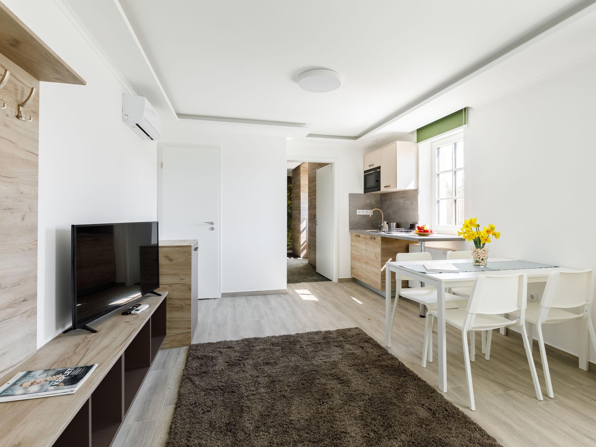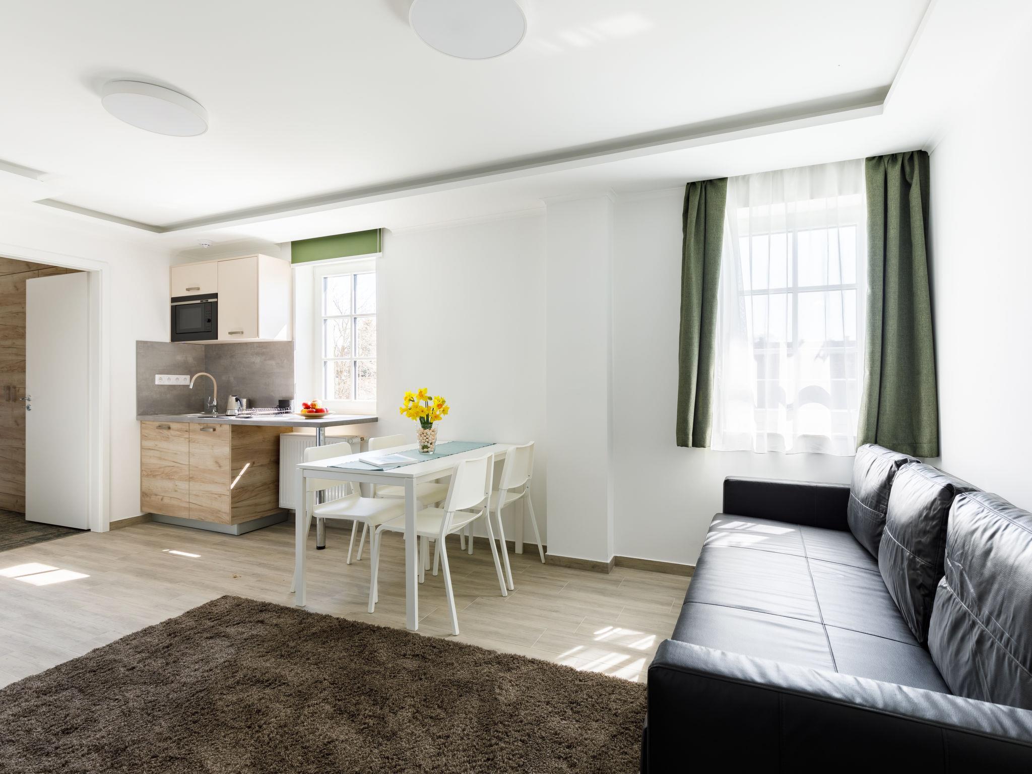 "Park 5", apartment on the upper floor. Beautiful and modern furnishings: open living/dining room with 2 sofabeds and cable TV (flat screen). 1 double bedroom with 1 french bed (160 cm, length 200 cm). Small, open kitchen (2 ceramic glass hob hotplates, microwave, electric coffee machine). Shower/WC. Floor heating. Solar power. North-west facing position. Facilities: children's high chair, baby cot (extra), hair dryer. Internet (WiFi). Please note: apartment courtyard side. Type of coffee machine: Nespresso.
