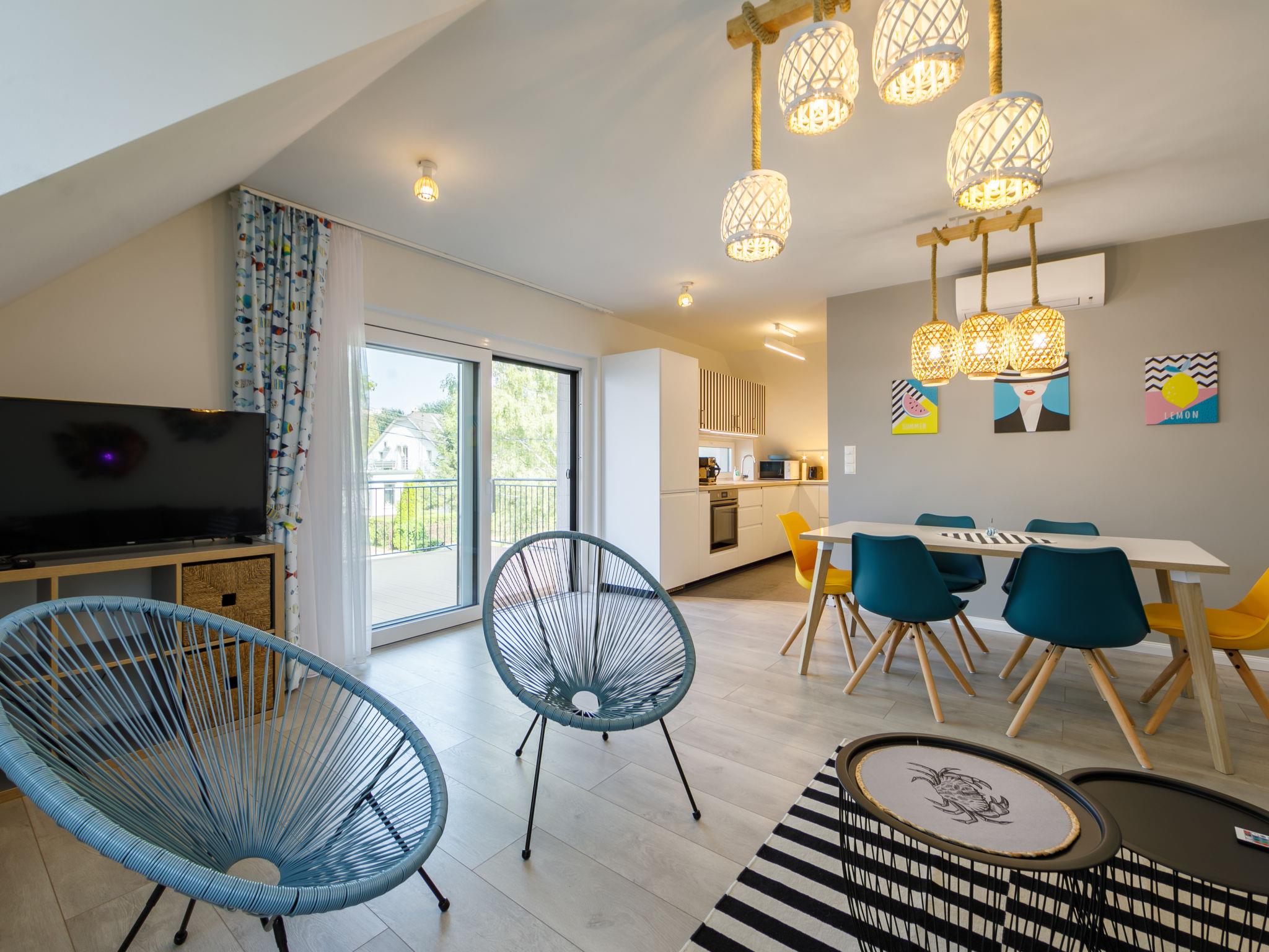 "Erika", 3-room apartment 75 m2, on the upper floor. Beautiful and tasteful furnishings: large living/sleeping room with 1 pull-out bed (2 pers.), satellite TV and air conditioning. Exit to the terrace. 1 room with 1 bed and 1 pull-out bed (2 pers.), air conditioning. 1 room with 1 french bed (160 cm, length 200 cm), air conditioning. Open kitchen (4 hot plates, oven, dishwasher, microwave). Shower/WC, sep. WC. Heating. Large terrace 25 m2. Terrace furniture, deck chairs. Beautiful view of the lake. Facilities: washing machine, children's high chair, baby cot (extra). Internet (WiFi). Parking (fenced 2 cars).