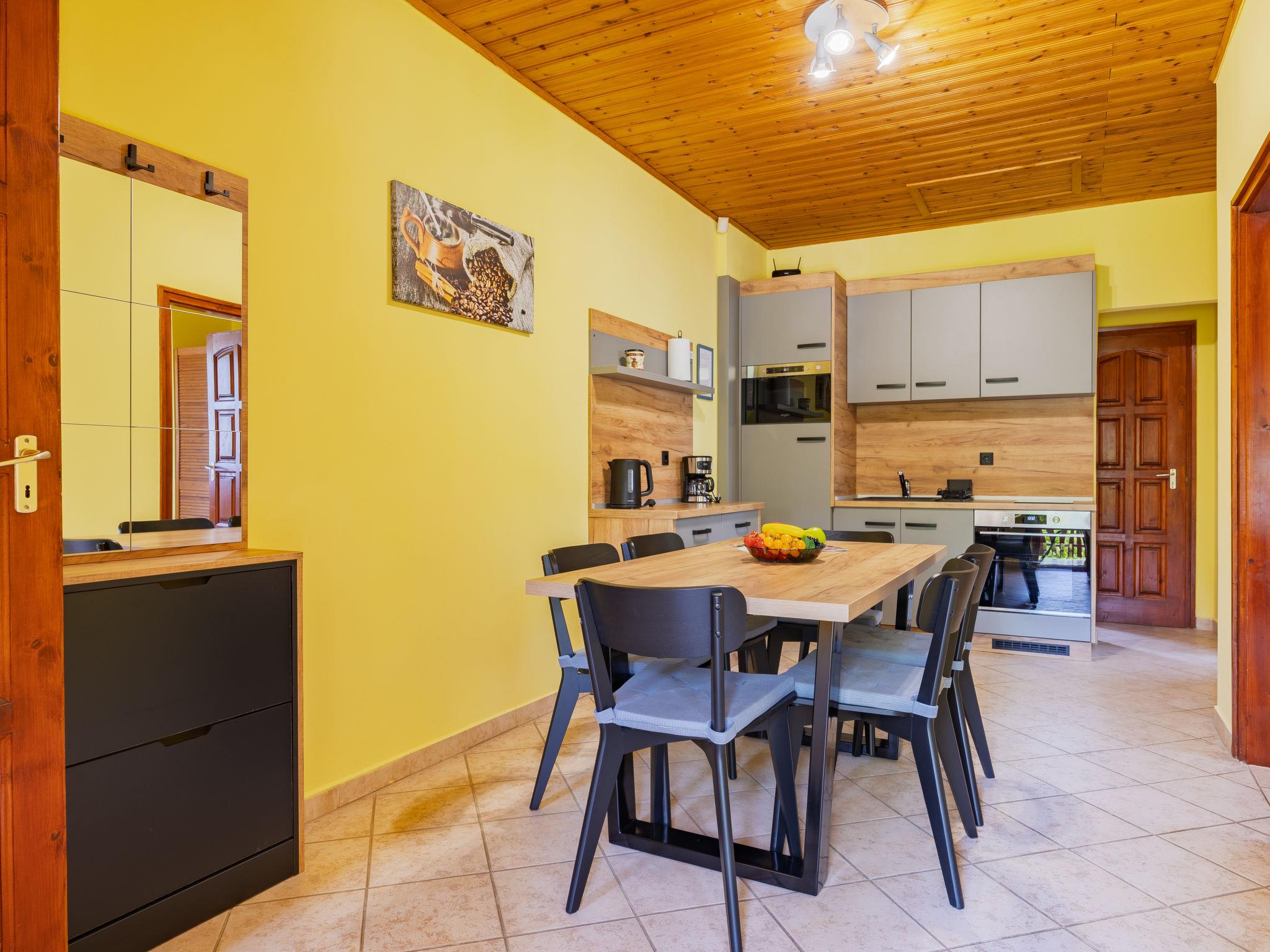 "Jókai", 6-room semi-detached house 160 m2 on 2 levels. Comfortable and cosy furnishings: living/dining room with satellite TV and air conditioning. 1 double bedroom with 1 french bed (180 cm, length 200 cm), 1 fold-away bed, digital TV and air conditioning. Exit to the terrace. 1 room with 2 beds (90 cm, length 200 cm). Open kitchen (2 hot plates, oven, toaster, kettle, microwave, freezer, electric coffee machine) with dining table, 1 fold-away bed. Shower, sep. WC. Heating, air-conditioning. Upper floor: 1 room with sloping ceilings with 2 beds (90 cm, length 200 cm). 1 double bedroom with sloping ceilings with 1 french bed (180 cm, length 200 cm), digital TV and air conditioning. Exit to the balcony. Open kitchen (oven, 2 ceramic glass hob hotplates, microwave, freezer) with dining table. Exit to the balcony. Shower, sep. WC. No heating option. Terrace. Terrace furniture, balcony furniture, covered balcony. Facilities: children's high chair, baby cot (extra). Internet (WiFi). Please note: non-smoking house. SPTPS8WH