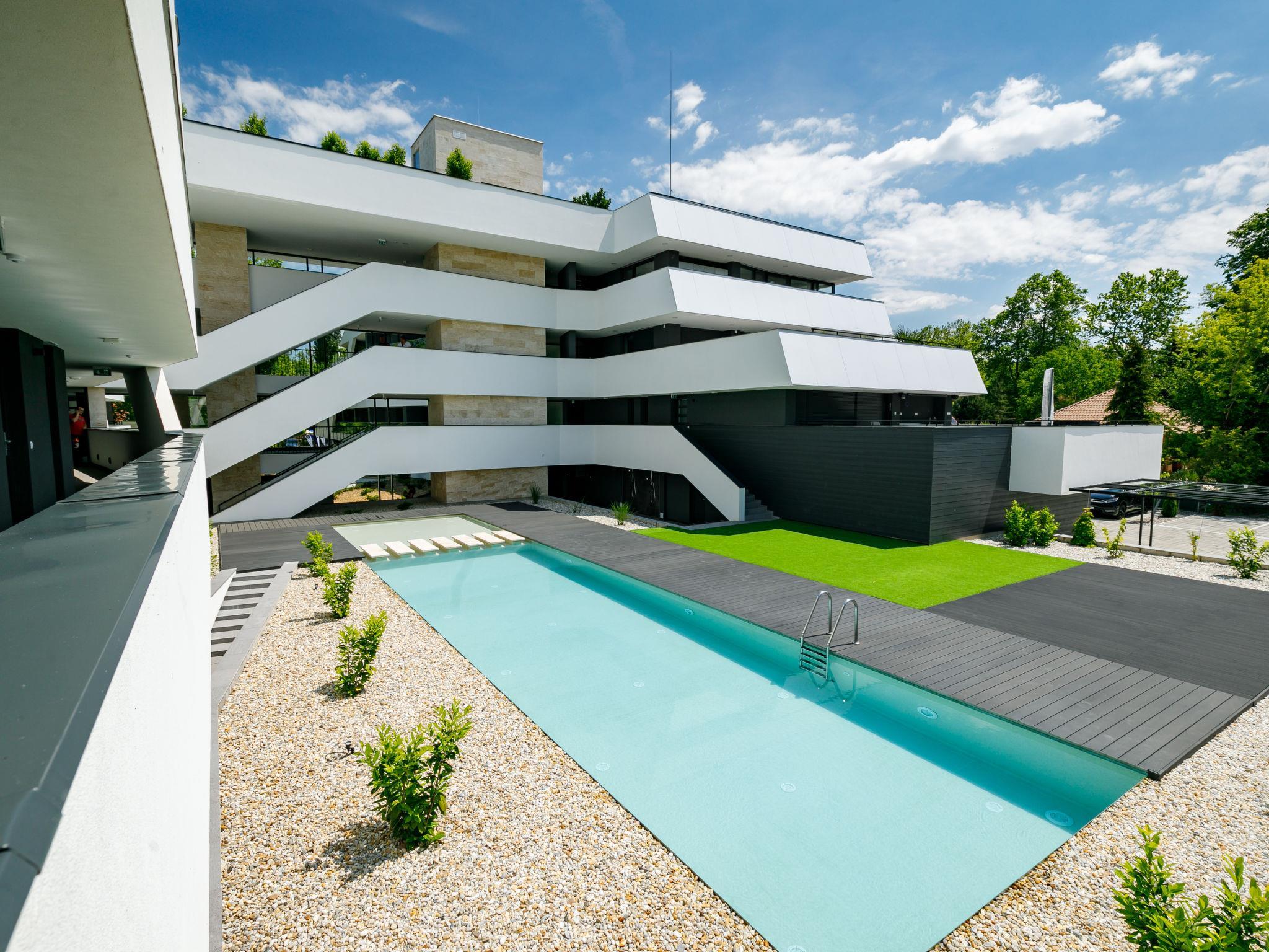 Balatonszemes 7 km from Balatonlelle: Modern, beautiful apartment block, built in 2020. In the resort, in a central position, 100 m from the lake, 350 m from the beach. For shared use: swimming pool angular heated (8 x 20 m, seasonal availability: 15.May. - 15.Sep.). In the house: internet café, WiFi, lift, sun terrace. Breakfast on request (extra). Grocery 200 m, restaurant 100 m, railway station 450 m, grass beach 300 m. Sports harbour 100 m. Nearby attractions: Tihany 14 km.