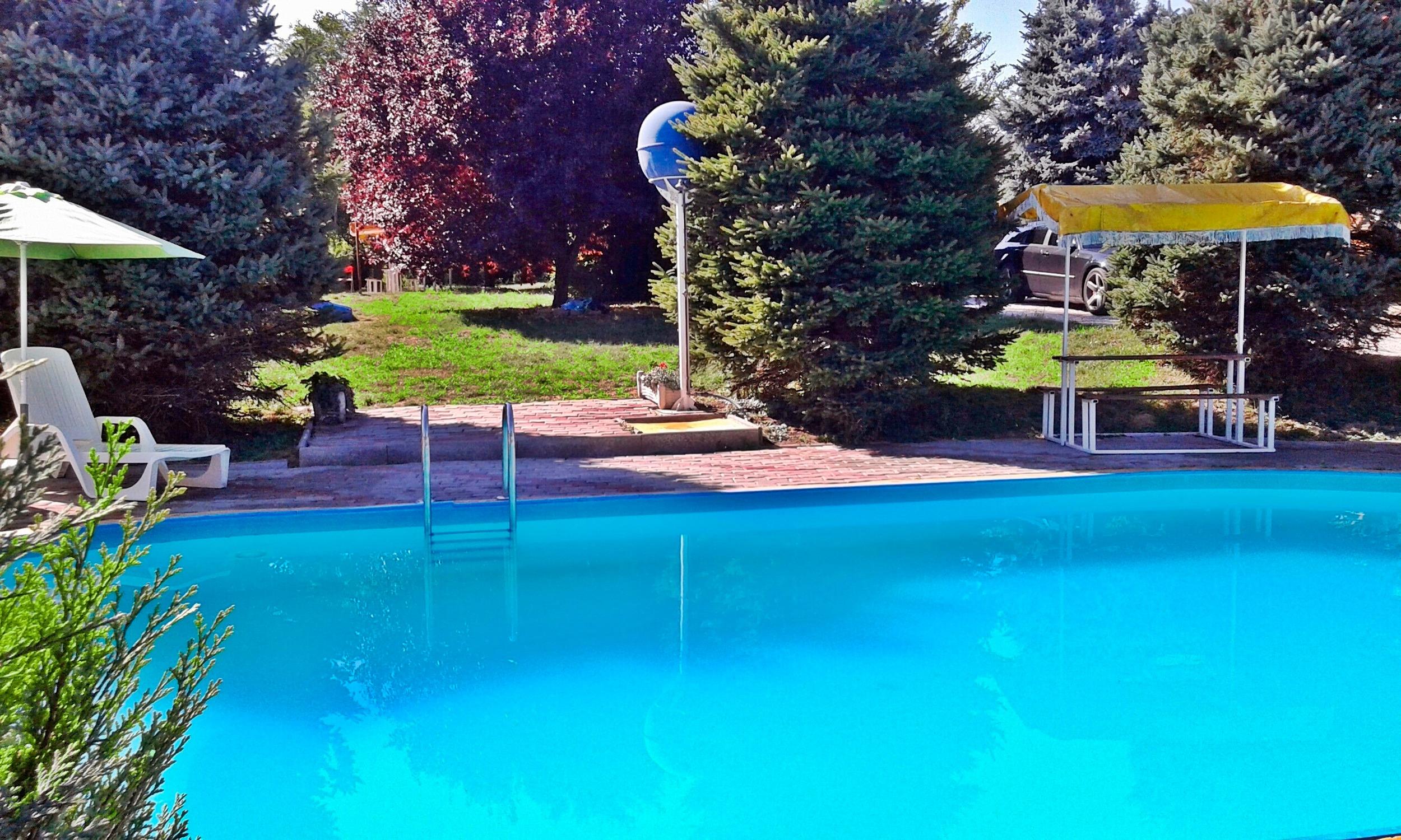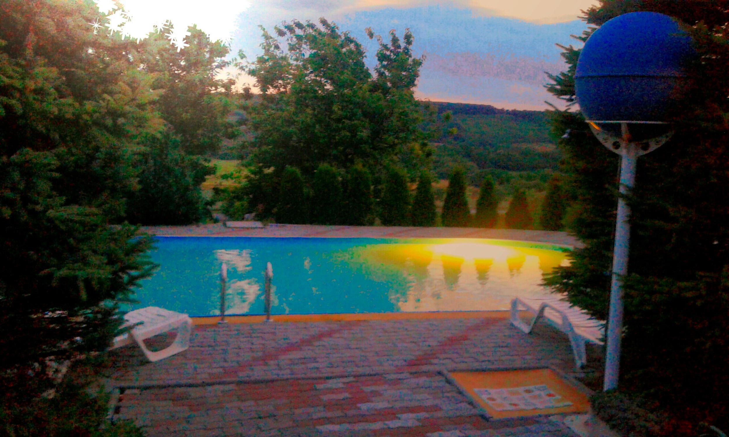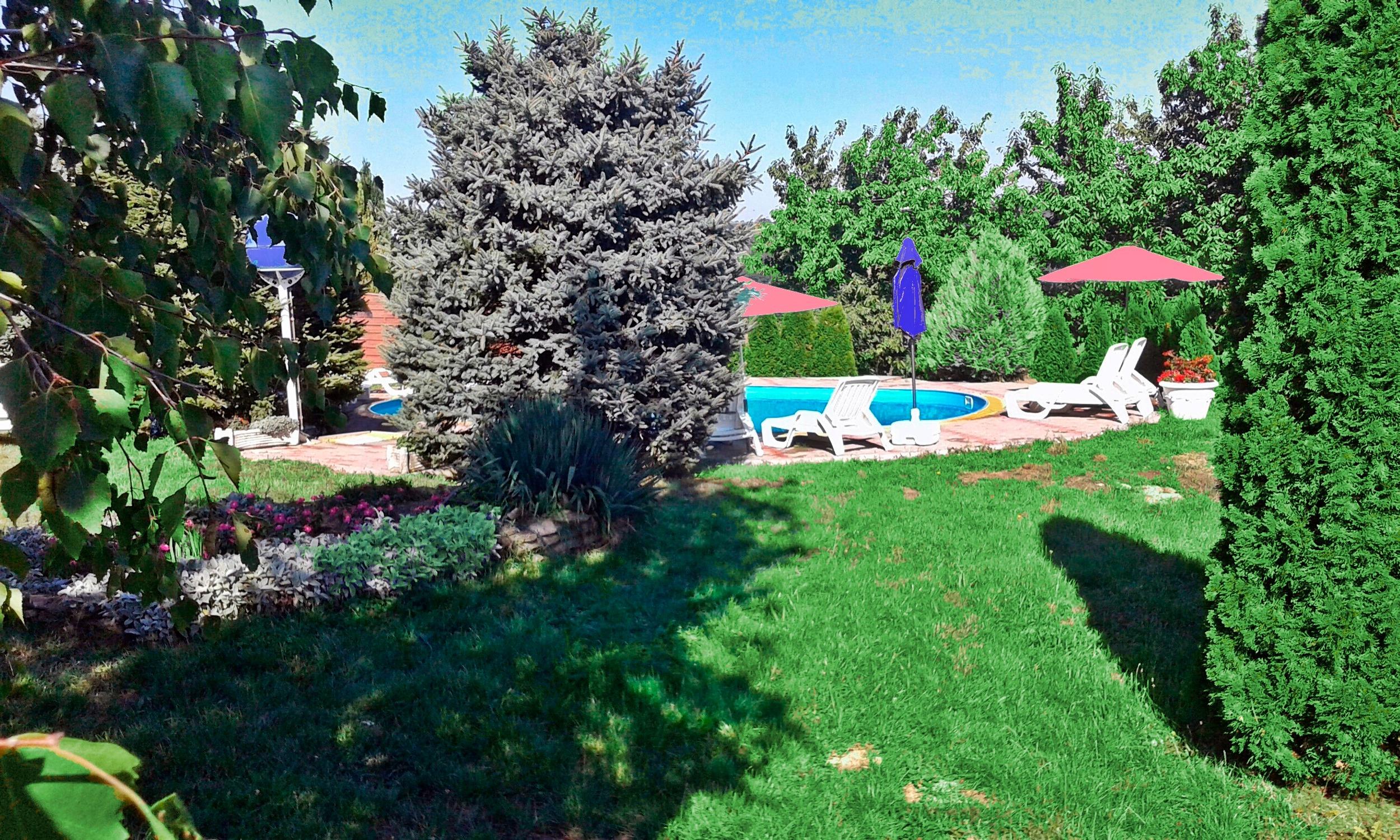 Zur gemeinsamen Nutzung stehen zur Verfügung: Sonnernliegen, Gartendusche, Grillmöglichkeiten, ein Pavillon und der Außenpool. (5,5 m x 12 m). Der Vermieter wohnt im Nachbarhaus.