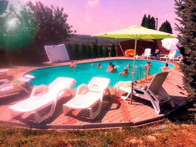 Zur gemeinsamen Nutzung stehen zur Verfügung: Sonnernliegen, Gartendusche, Grillmöglichkeiten, ein Pavillon und der Außenpool. (5,5 m x 12 m). Der Vermieter wohnt im Nachbarhaus.