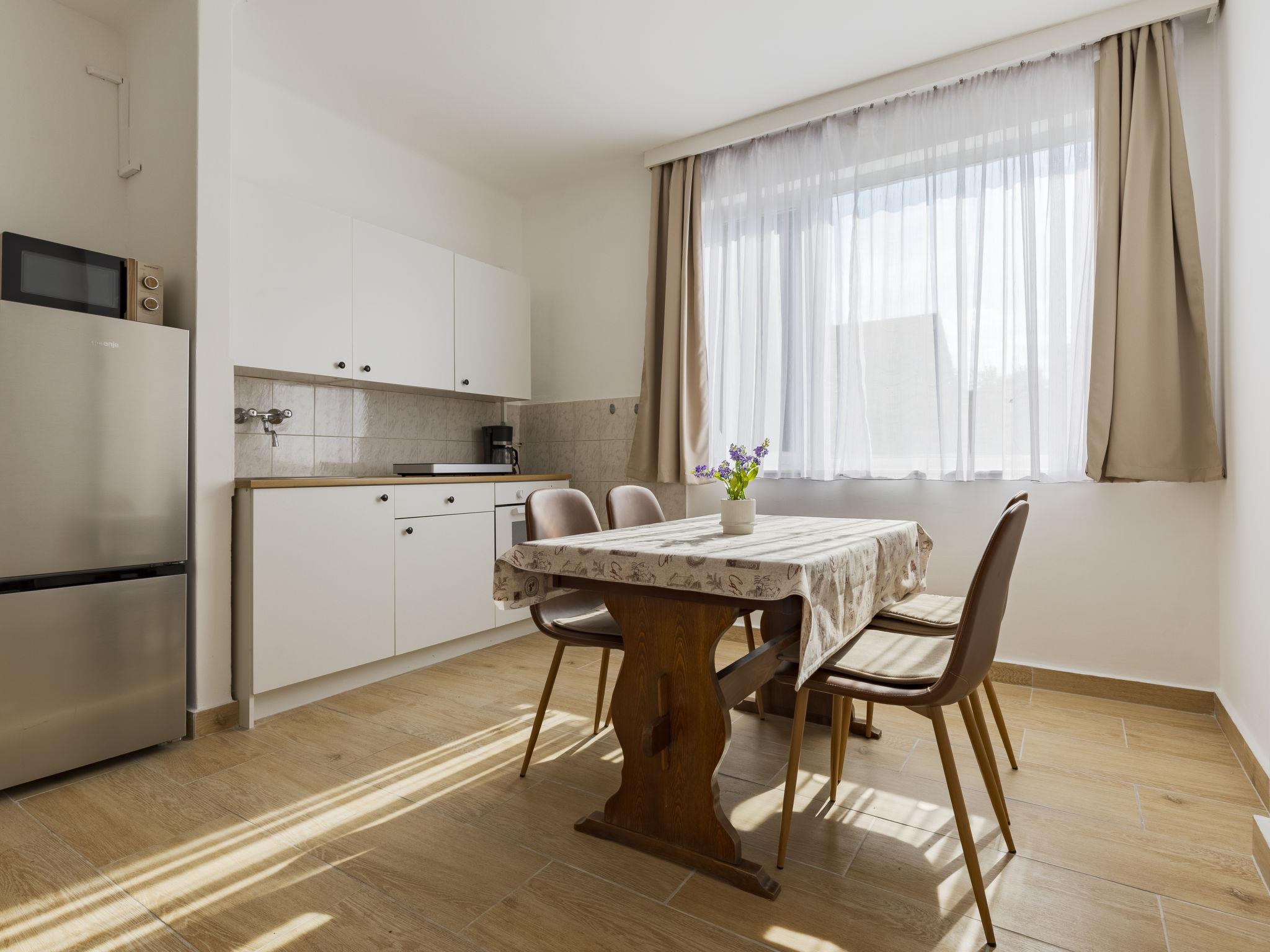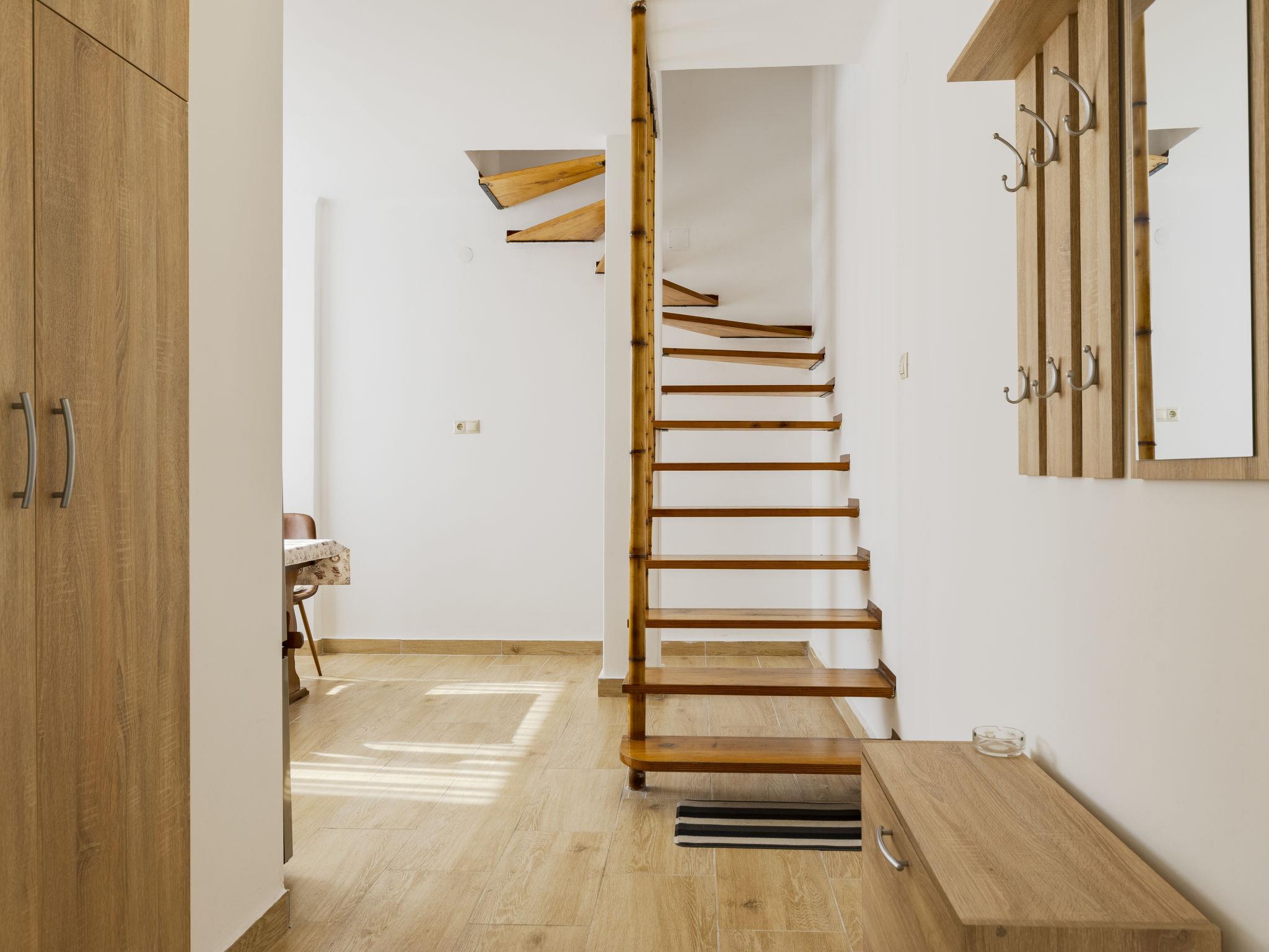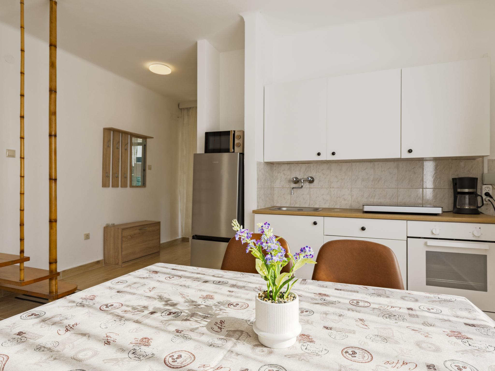 "Thomas", 2-room semi-detached house on 2nd floor. Bright, renovated in 2025, practical and comfortable furnishings: open dining room with dining table. Exit to the terrace. Open kitchen (oven, 2 induction hot plates, toaster, kettle, microwave, freezer, electric coffee machine). Shower/WC. Air-conditioning. Upper floor: small living room with cable TV, international TV channels and air conditioning. Exit to the balcony. 2 small double bedrooms, each room with 1 french bed (140 cm, length 200 cm). Terrace furniture, barbecue (portable), deck chairs (2). Facilities: mosquito net. Internet (WiFi, free).